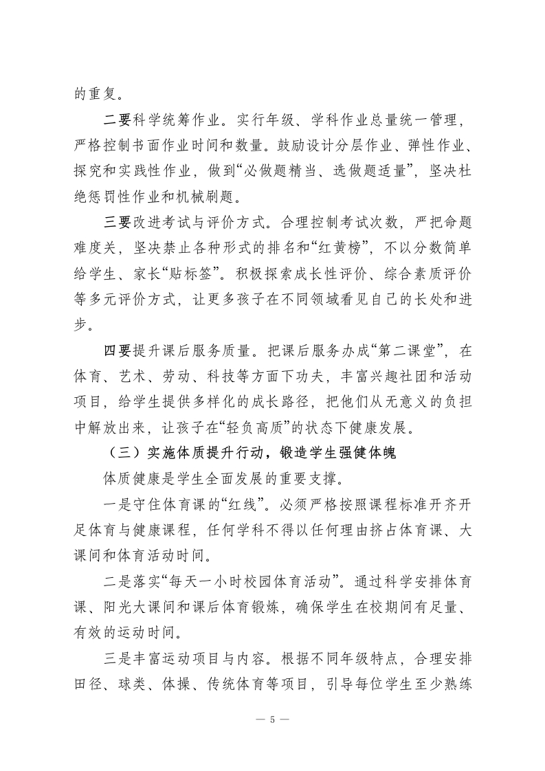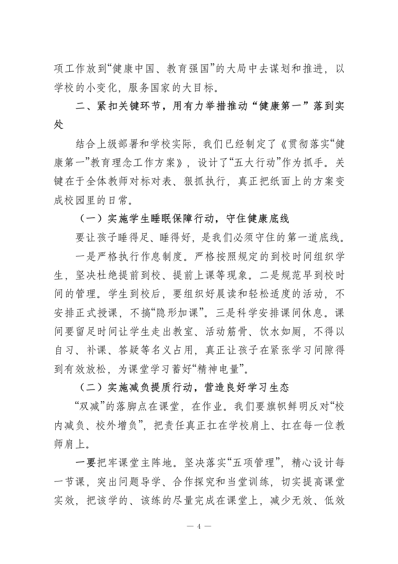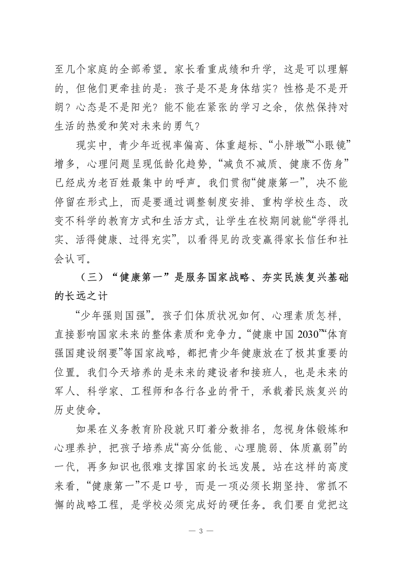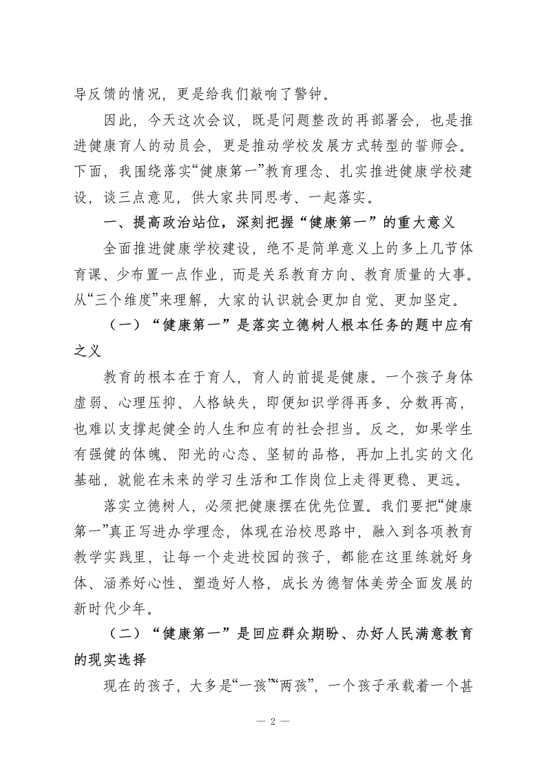 把“健康第一”写进每一堂课:校长在推进会上的3点要求、5项任务!各位老师、同志们:今天把大家召集在一起,目的只有一个:把关于教育和健康的一系列重要论述真正学深悟透,把《教育部关于全面推进健康学校建设的指导意见》和区教体局的部署要求不折不扣落实到位,进一步统一思想、形成合力,用更高的站位和更实的举措,把“健康第一”的教育理念落到每一间教室、每一堂课、每一项教育教学活动中去,切实守护好学生的身心健康,推动学校教育高质量发展迈上新台阶。常说,健康是人生的“1”,其他都是后面的“0”。没有这个“1”后面的“0”再多也没有意义。某同志强调,要树立“健康第一”的教育理念,让孩子们积极参加体育锻炼,实现“文明其精神、野蛮其体魄”。这不是一般性的提醒,而是对健康与个人成长、国家发展关系的深刻揭示,为新时代基础教育指明了方向。教育部把“健康第一”作为新春“开年第一会”的主题,专门对健康学校建设作出全面部署,充分体现了党和国家对青少年健康成长的高度重视。从学校情况看,这些年围绕学生健康我们也做了不少探索,但与上级的要求、家长的期待相比,差距依然不小:有的教师理念转变不到位,仍然存在挤占体育活动时间、作业过量的问题;体质监测、近视防控、心理健康干预等工作还不够系统、不够有效;家校协同育人的机制和合力尚未真正形成。上级督1
