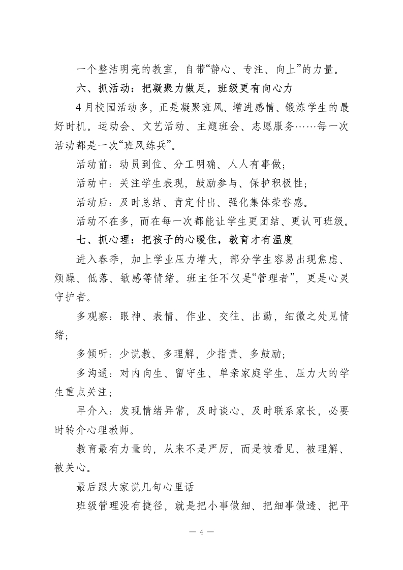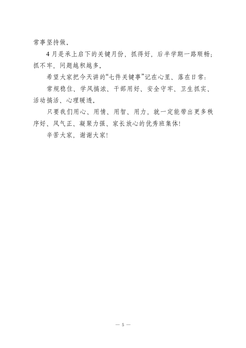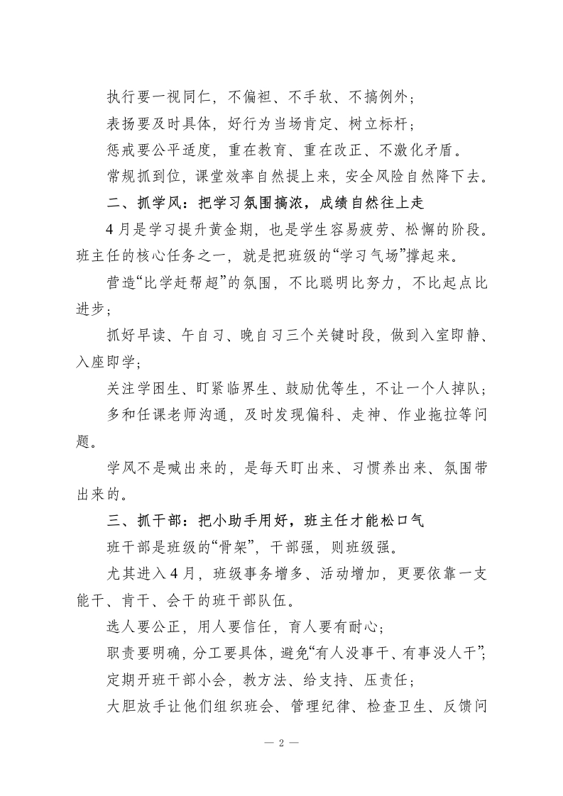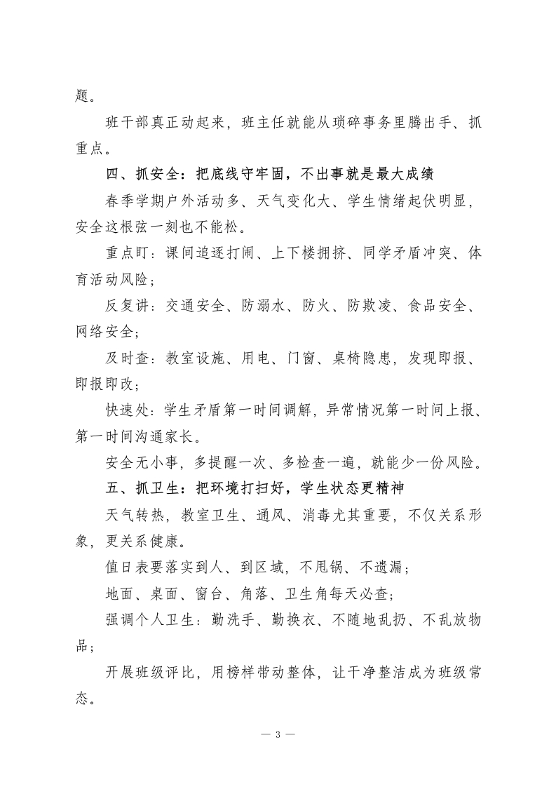 班主任工作会讲话:抓好七件关键事,把班级管稳、管活、管出温度各位班主任老师:大家下午好!学生状态逐步稳定、学习节奏全面拉开、行为习惯基本成型,但同时也是矛盾易发、情绪波动、管理容易松懈的时候。今天把大家召集起来,不讲空道理、不摆大框架,就围绕班级怎么管、学生怎么带、问题怎么解,和大家交流一套实在、好用、能落地的做法一一抓好七件关键事,轻松带出班风正、学风浓、人心齐的和谐班集体。班主任是学校最辛苦、最细致、最离不开的岗位,每天从早到晚、从课堂到课间、从情绪到安全、从学习到生活,事事要操心、件件要落实。一个班级好不好,关键不在“管得多严”,而在“管得是否到位、是否走心、是否有效”。接下来我讲的这七点,大家可以直接带回班级、用在日常,越做越顺手、越管越轻松。一、抓常规:把规矩立在前,班级才不乱春季学期天气转暖,学生活跃度高、容易浮躁,常规一松,全班就乱。我们要抓的不是“表面整齐”,而是让学生形成稳定习惯:出勤准时、课堂专注、课间文明、仪容得体、手机规范、自习有序。制度要简单清晰,让学生记得住、做得到;一1