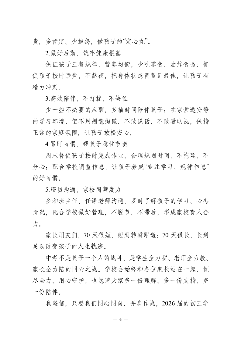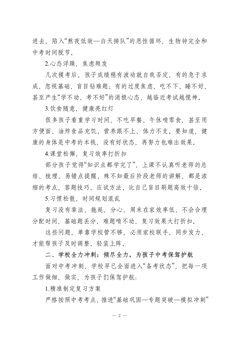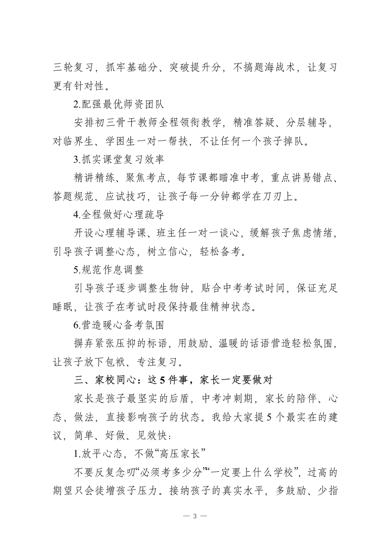 初三家长会校长致辞:这5件事,家长一定要做对尊敬的各位家长朋友:大家好!四月的校园春意正浓,2026年中考的冲刺号角已经彻底吹响。今天我们齐聚这场初三家长会,距离今年中考仅剩70余天,这是孩子初中三年最关键、最吃劲的攻坚期,也是家校携手、同心护航的核心时刻。首先,我代表学校全体教职工,向百忙之中抽空到场的各位家长,致以最诚挚的感谢!初三是孩子人生中第一次重要的人生大考,每一分成绩、每一点进步、每一次心态起伏,都牵动着学校、家庭的心。这段时间,我们看着孩子们早起晚睡、埋头刷题,既心疼又欣慰;也发现了不少备考中的问题和隐患。今天,我不和大家讲空话、套话,就掏心窝子聊三件事:当前孩子的真实备考状态、学校的全力保障措施、家长该如何精准配合,让我们心往一处想、劲往一处使,帮孩子稳稳打赢中考这场硬仗。一、直面现状:4月冲刺期,孩子面临的真实问题进入四月,复习进入白热化阶段,大部分孩子都在全力冲刺,但我们通过课堂观察、作业反馈、谈心交流,也发现了五个普遍问题,直接影响中考发挥,必须引起大家重视:1.作息紊乱,身心透支不少孩子为了多刷题熬夜到深夜,甚至开夜车,结果第二天课堂上昏昏欲睡、注意力涣散,老师讲的考点、方法全没听-1