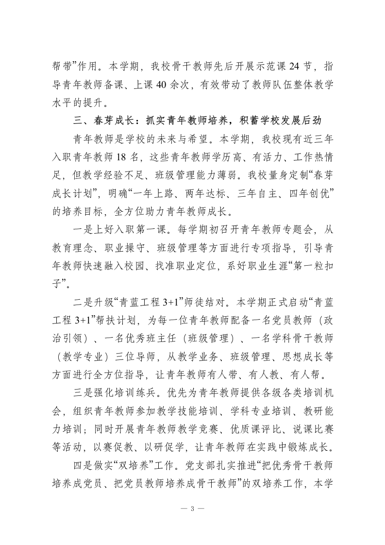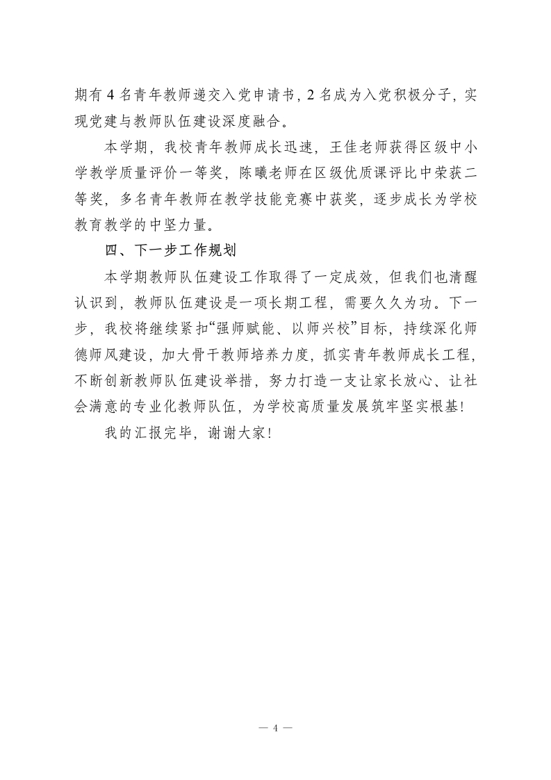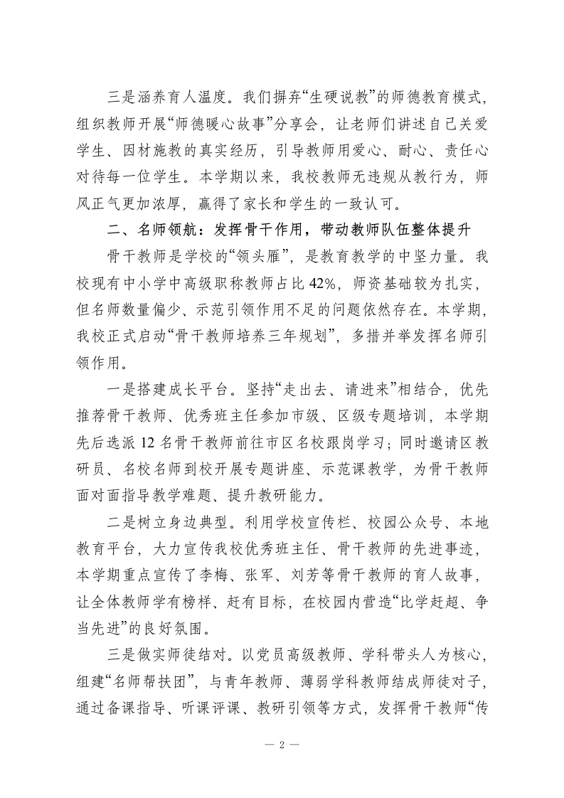 春季教师队伍建设工作校长汇报:强师赋能,以师兴校,筑牢学校育人根基尊敬的各位领导、老师们:大家好!教师队伍是学校发展的核心竞争力,是立德树人的根本依靠。本学期,我校紧紧围绕“师德铸魂、名师领航、青年成长”三大主线,扎实推进教师队伍建设创新实践,全力打造一支“师德高尚、业务精湛、结构合理、充满活力”的专业化教师队伍。下面,我就本学期教师队伍建设工作,向各位做详细汇报。一、师德铸魂:守育人初心,让师风正气扎根校园师德是教师的立身之本,是教育工作的生命线。本学期,我校以“春风师德”主题教育为抓手,把师德师风建设融入日常、抓在经常。一是强化理论学习。每月定期组织全体教师开展师德专题学习,深入学习《新时代中小学教师职业行为十项准则》《教师法》等内容,结合身边的师德典型案例,引导教师明底线、知敬畏、守初心,摒弃“重教书、轻育人”的片面观念,树立“育人为本、德育为先”的教育理念。二是压实责任链条。全体教师签订《师德师风承诺书》,将师德表现与年度考核、评优评先、职称晋升直接挂钩;开展师德民主评议,通过学生评、家长评、同事评,全方位监督教师从教行为;同时开通校长信箱、师德举报渠道,主动接受家长和社会监督,让师德师风建设看得见、摸得着。1