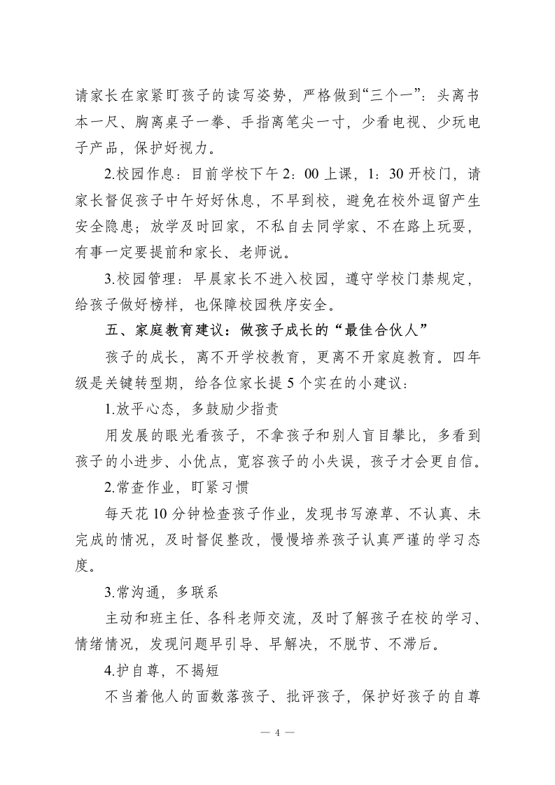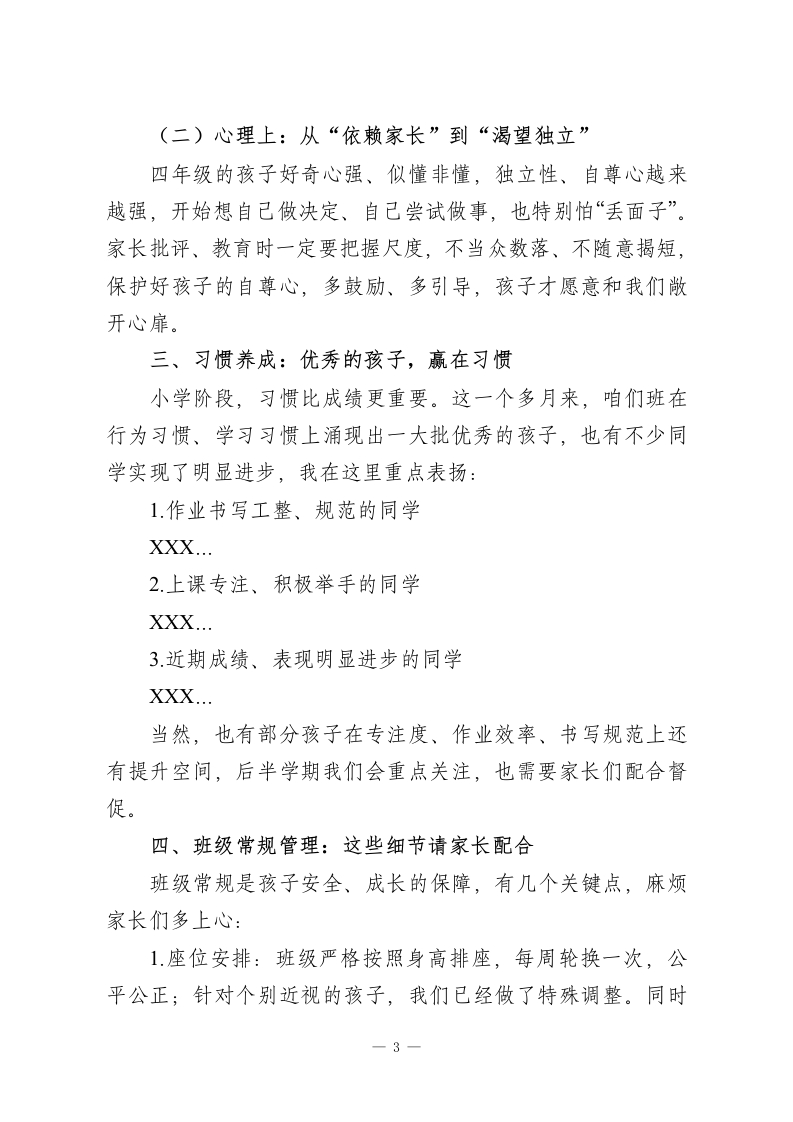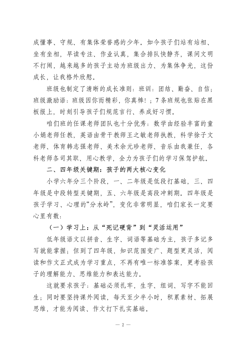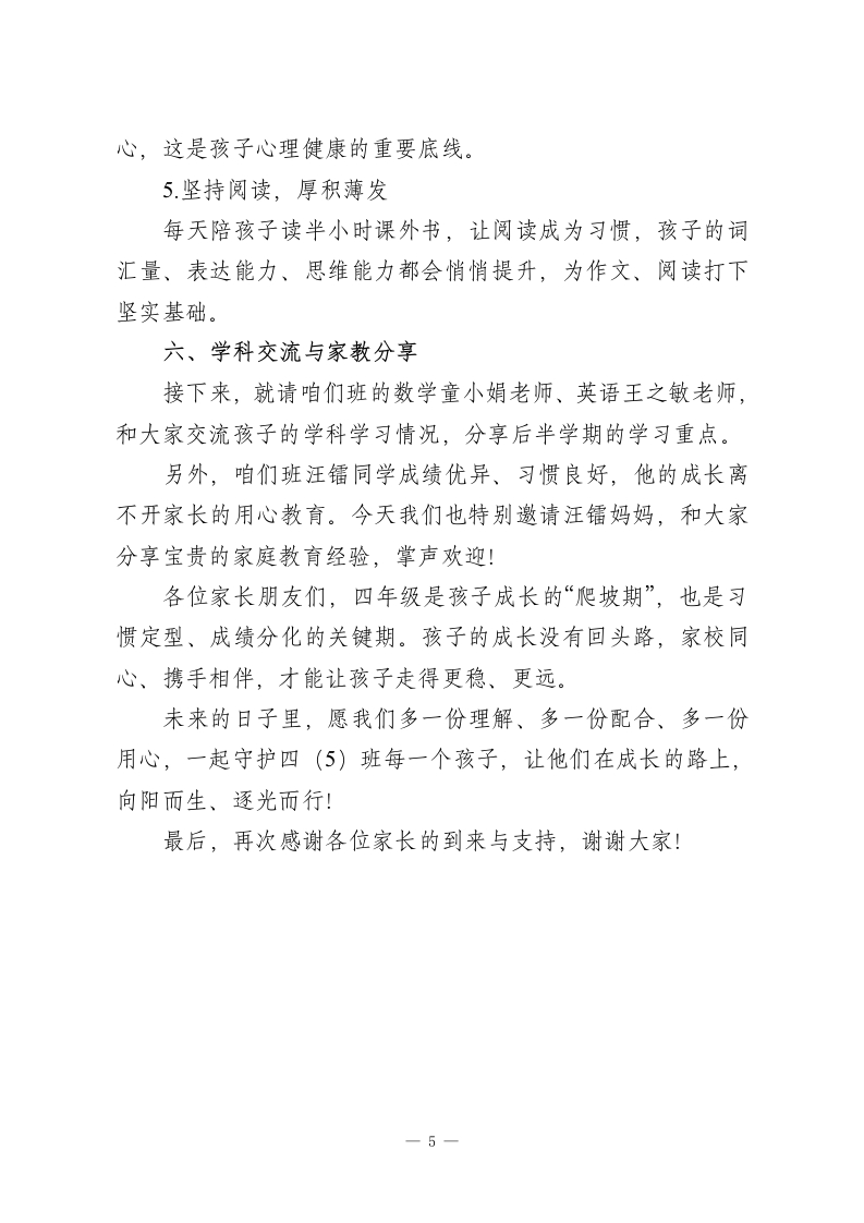 春季小学家长会教师发言稿:孩子的成长没有回头路尊敬的各位家长朋友们:大家晚上好!暮春四月,草木葱茏,转眼2026年春季学期已走过一个多月的时光。非常感谢大家在百忙之中抽空来到学校,参加咱们四(5)班的家长会,这一份到场,就是对孩子成长最用心的守护,也是对班级工作、学校工作最有力的支持。在此,我代表四(5)班全体任课老师,向各位家长致以最诚挚的谢意!首先,我先和大家简单介绍咱们吴都小学的办学理念:学校始终坚守“以爱育爱、以发展促发展”的核心宗旨,把全面提升教育质量作为根本目标,深耕素质教育,注重孩子的习惯养成、品格塑造与全面发展,让每一个孩子在校园里都能快乐学习、健康成长。接下来,我重点和大家聊聊咱们四(5)班的情况、孩子进入四年级的关键变化,以及后半学期家校配合的重点,咱们掏心窝子交流,实实在在为孩子的成长发力。一、班级基本情况:向上向善,班风渐成咱们四(5)班共有68名同学,其中男生45人、女生23人,男生活泼聪颖、精力充沛,女生踏实勤奋、细心认真,是一个充满活力、团结向上的班集体。从一年级牵手走到四年级,我作为语文老师兼班主任,陪着孩子们走过了整整三年时光,见证了他们从懵懂孩童慢慢长1