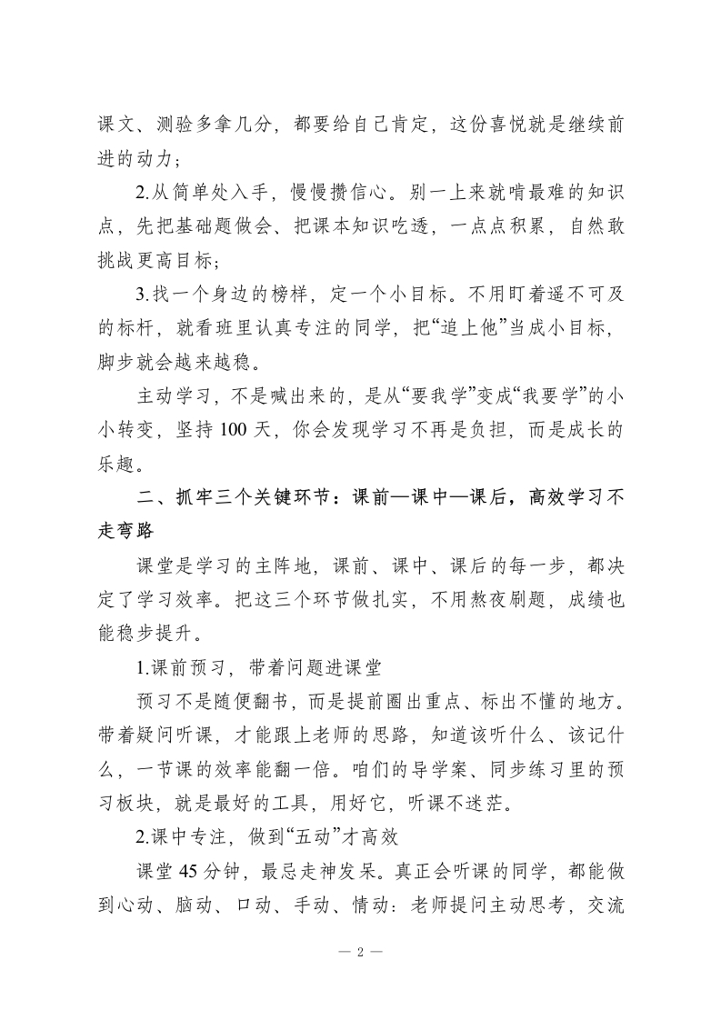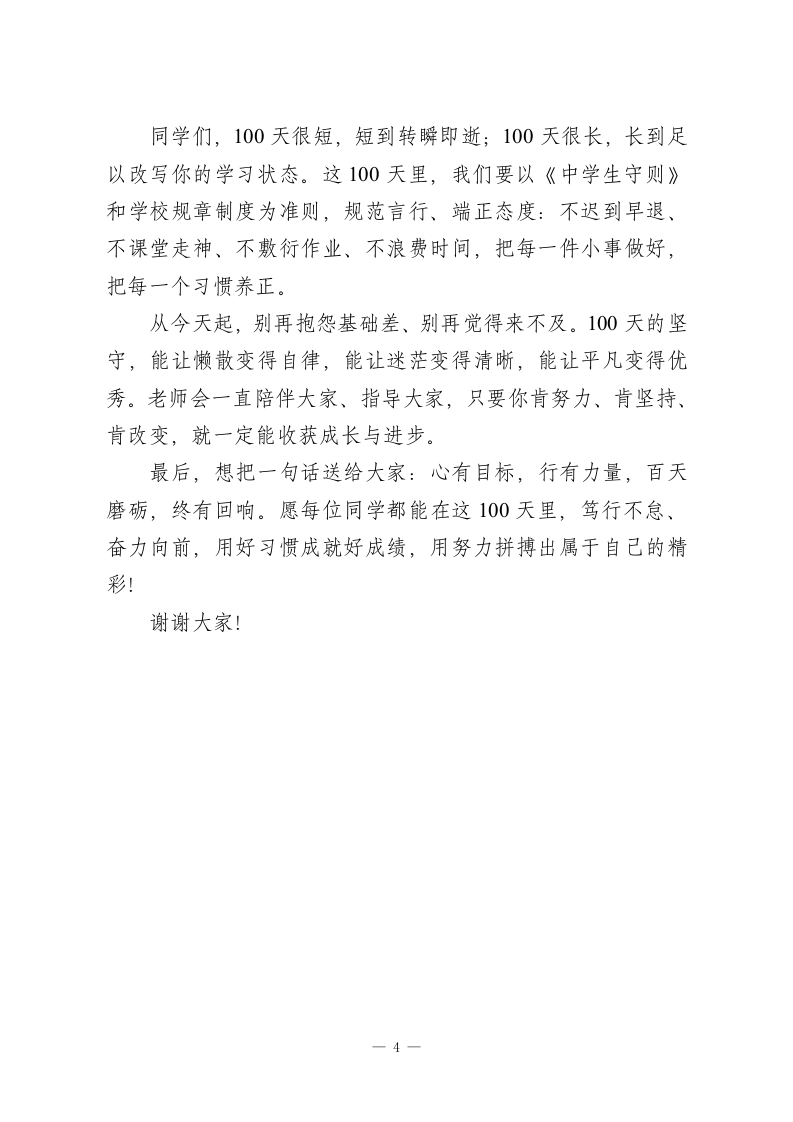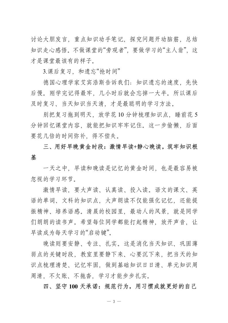 国旗下副校长讲话:坚守百天,笃行不怠,用好习惯拼出好成绩尊敬的各位老师、亲爱的同学们:大家早上好!春风送暖,万物生长,正是校园里最该拼搏、最能成长的黄金时节。不管是备战中考的初三学子,还是蓄力提升的各年级同学,从今天算起,坚持100天,足以改变学习状态、扭转成绩局面、实现自我超越。今天我想和大家聊的,不是空泛的口号,而是最实在、最管用的道理:规范行为、养好习惯、用对方法,100天的坚持,就能让你从迷茫掉队,变成稳步前行的优秀学子。很多同学总觉得“成绩不好是因为不够聪明”,其实恰恰相反,学习的差距,从来不是智商的差距,而是习惯的差距、行动的差距、坚持的差距。科学早已证明,一个好行为连续坚持100天,就会变成刻在骨子里的习惯;一个坏习惯及时改正100天,就能彻底告别低效与浮躁。这100天,就是我们逆袭成长、突破自我的最佳窗口期。一、先唤醒内心的力量:主动学,比被动熬更有用学习最忌讳“推着走、逼着学”,看似坐在书桌前,心思早就飘走了,熬再久也没有效果。真正的学霸,都有一颗主动学习的心,这就是我们说的“学习内驱力”。怎么唤醒这份动力?其实很简单:1抓住每一次小进步的成就感。做对一道难题、背会一段-1