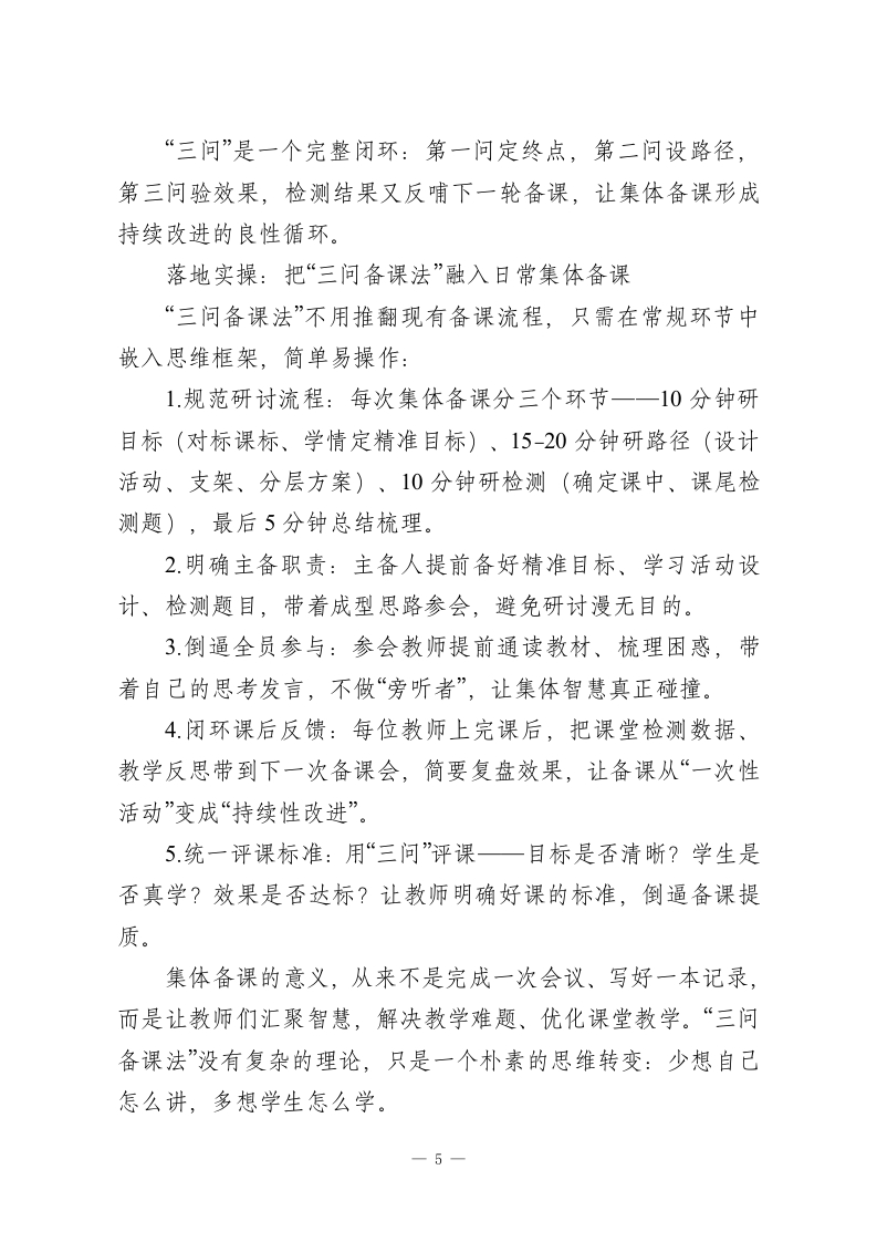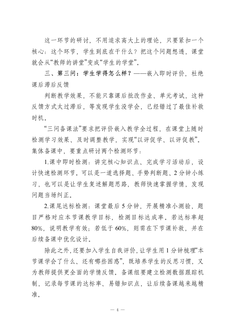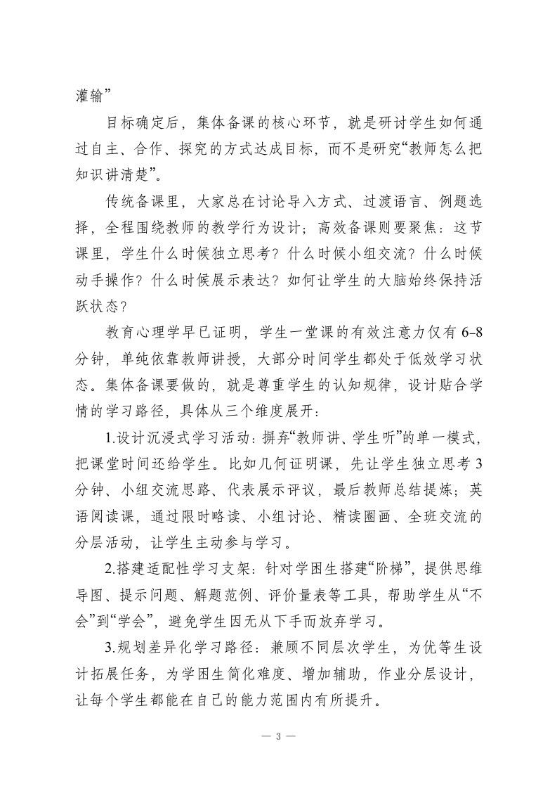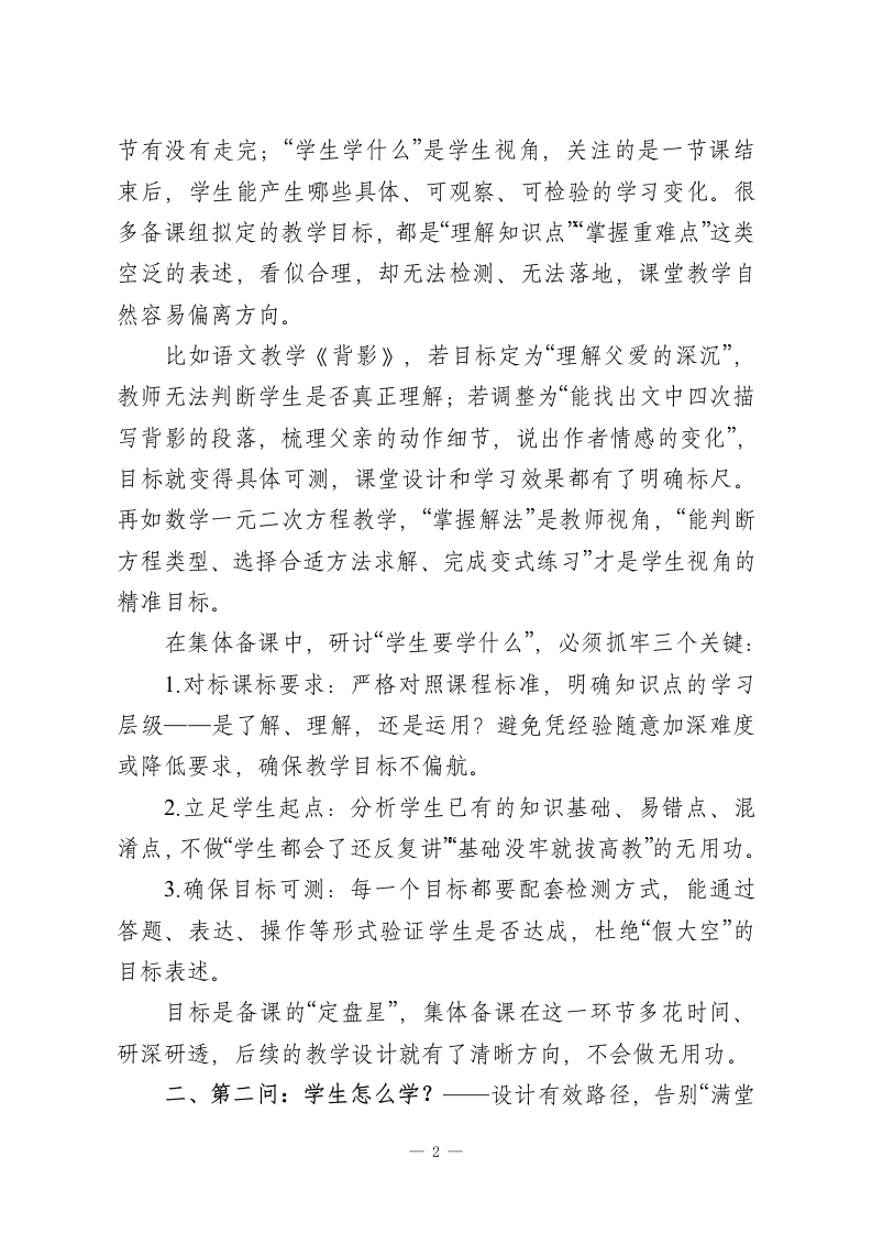 让集体备课真正赋能课堂一一“三问备课法”破解教研空转难题在日常教学管理中,集体备课早已成为各校的常规工作:固定时间、固定地点、专人记录,流程看似规范完整,可不少一线教师都有同感:多数集体备课只是“走形式、凑记录”。主备人照着教材讲知识点、理流程,其他老师被动听、随手记,散会后回到课堂,依旧按自己的老思路教学。这样的集体备课,既耗费时间精力,又对课堂提质毫无帮助,完全陷入了“表面热闹、实际空转”的困境。究其根本,问题出在备课的核心导向上。长期以来,我们的集体备课都在围绕“教师怎么教”展开,研究教材内容、知识结构、教学环节,却唯独忽略了最关键的主体一一学生。真正高效的集体备课,必须跳出“以教定备”的固有思维,回归教育本质,紧紧围绕学生的学习过程,反复叩问三个核心问题:学生要学什么?学生怎么学?学生学得怎么样?这就是能让集体备课落地见效的“三问备课法”,它把备课的重心从“教师的教”转向“学生的学”,让每一次研讨都直指课堂实效,让集体智慧真正转化为教学质量。一、第一问:学生要学什么?一一锚定精准目标,拒绝模糊笼统集体备课的第一步,绝不是先琢磨“这节课我要讲什么”,而是要明确“这节课学生要学会什么”。“教师讲什么”是教材视角,关注的是知识有没有讲全、环1