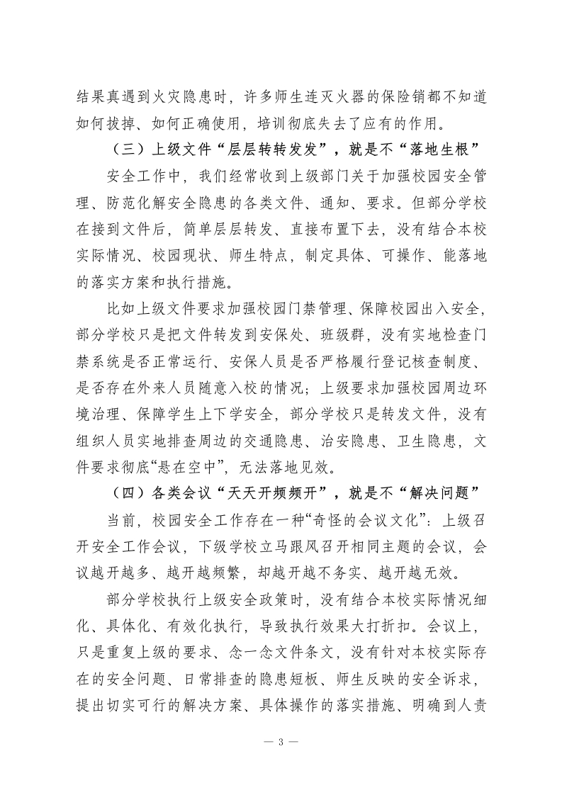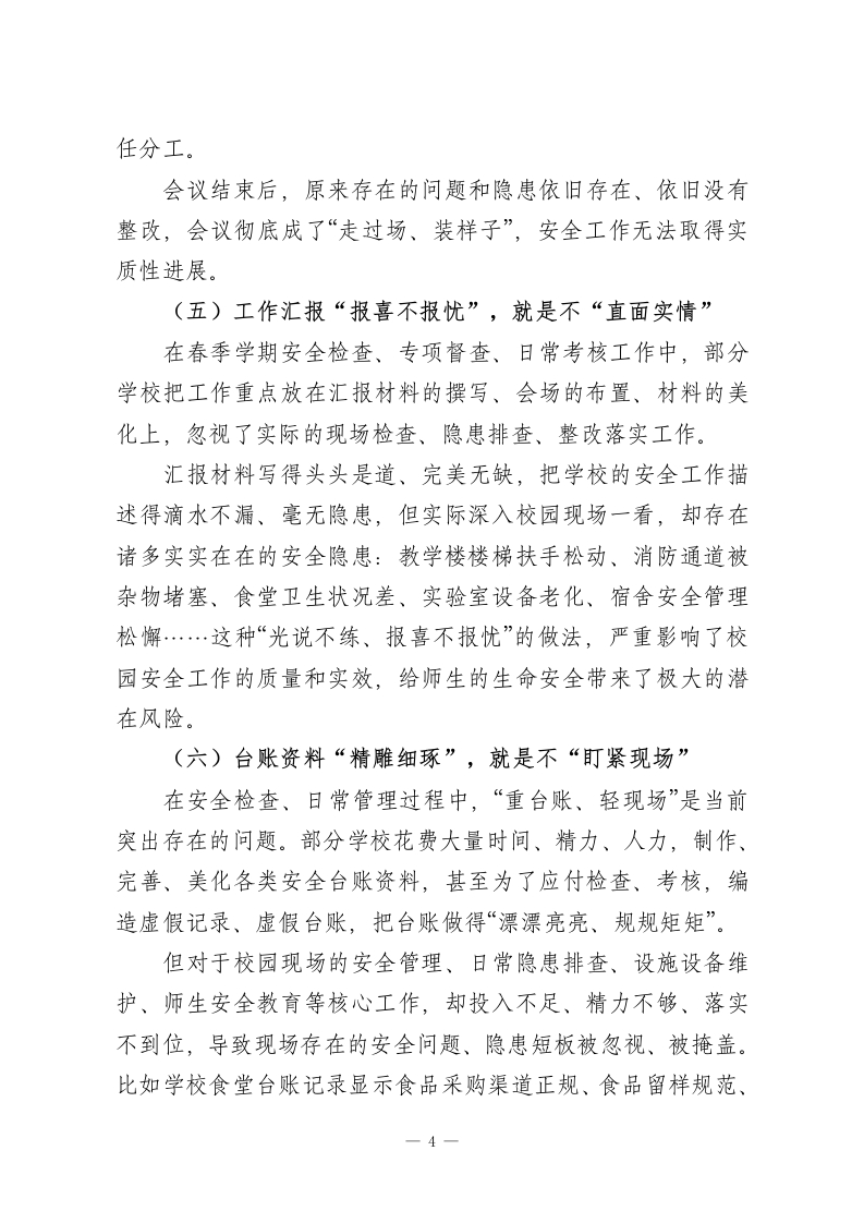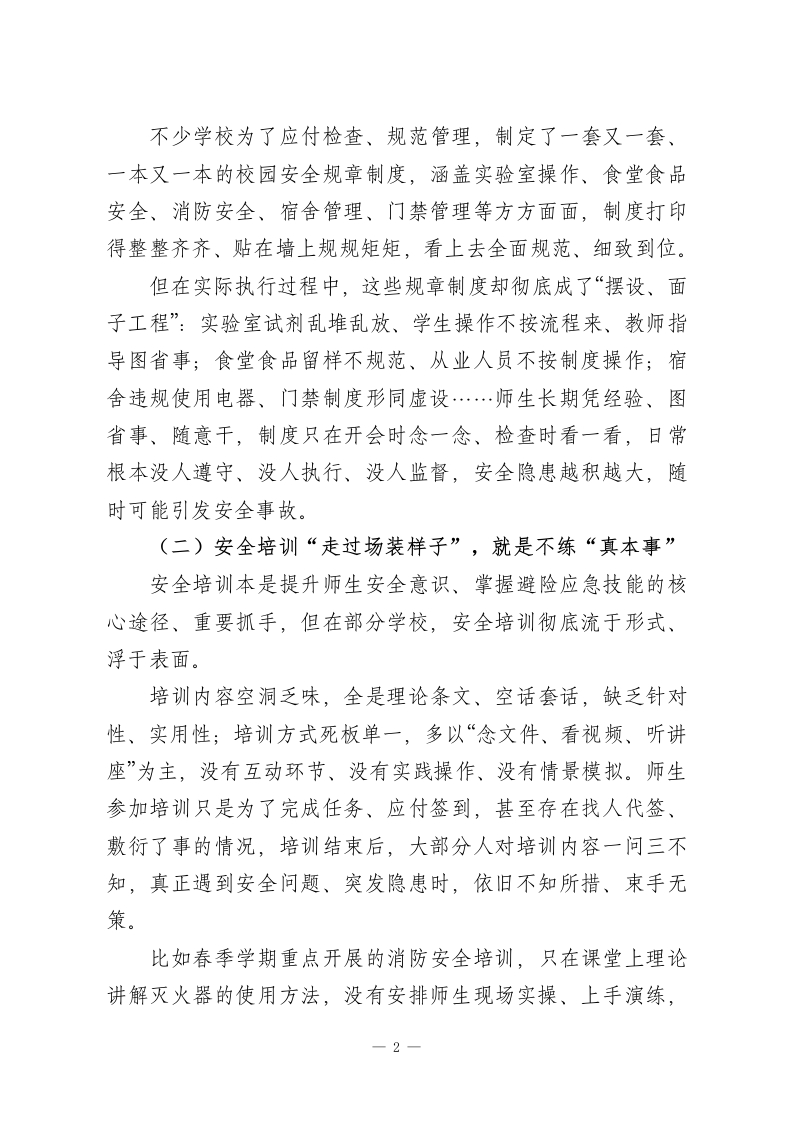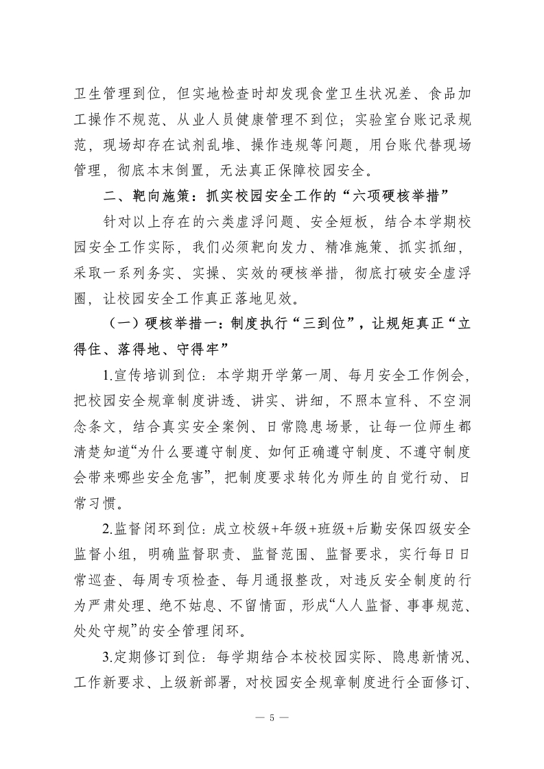 校园安全工作专题会上校长发言:告别虚浮务虚,抓实落地见效,全力守护师生平安尊敬的各位领导、各位教育同仁:大家好!安全是教育的生命线,是师生工作学习的前提保障,是学校一切事业发展的基石底线。没有安全,一切成绩都是空谈;没有安全,一切发展都是泡影。今天,在全市学校安全工作经验交流会上,我不想讲空洞的口号、不摆虚浮的成绩、不念刻板的条文,只想结合我们一线学校的真实工作场景、实际问题短板、实操落地做法,和大家坦诚交流、务实探讨:如何彻底打破校园安全长期存在的“虚浮圈、形式圈、口号圈”,让安全工作从“纸面挂着”走向“地面抓实”、从“口头念着”走向“行动干着”、从“虚功做着”走向“实效见着”,真正把安全护在每一位师生身边、护在校园每一个角落、护在春季学期每一个日常细节里。一、直面问题:校园安全必须警惕的“六类虚浮病”当前,全市各校安全工作整体平稳有序,但结合春季学期开学检查、日常巡查、专项排查情况来看,部分学校依然存在重形式、轻实效,重布置、轻落实,重材料、轻现场的虚浮问题,这些问题看似不大,实则暗藏隐患、危及平安,必须高度警惕、坚决整改。(一)规章制度“挂墙挂嘴”,就是不挂“行动”1-