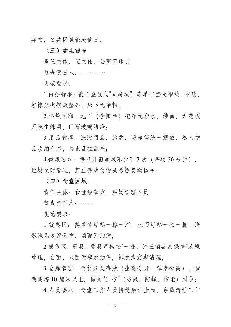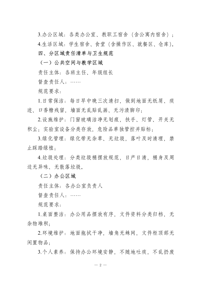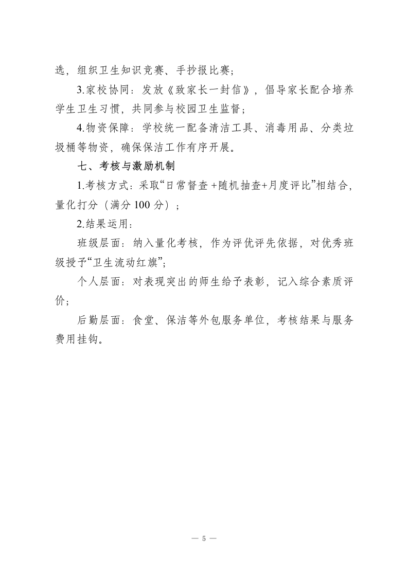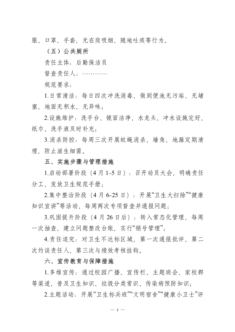 校园健康提升行动暨第38个爱国卫生月实施方案爱国卫生运动是践行“健康中国”战略的重要载体,旨在通过全民参与、全域治理,筑牢公共卫生安全防线,培育文明卫生风尚,改善人居环境质量,提升师生健康素养。为深入推进校园爱国卫生工作,结合学校实际,制定本方案。一、工作领导小组组长:…(统筹全局,负责方案审定与资源保障)副组长:…(分管落实,协调督查推进)成员:…及全体班主任(具体执行与日常督查)》二、核心工作目标1.环境提质:实现校园“洁、净、美、序”,消除卫生死角,改善教学、生活、办公环境:2.习惯养成:推动师生形成“勤洗手、常通风、讲卫生、爱环境”的健康生活方式;3机制健全:构建“责任明晰、督查有力、奖惩分明”的校园卫生长效管理体系;4氛围营造:打造“人人参与、家校联动、共建共享”的爱国卫生工作格局。三、重点治理区域1.公共空间:校门周边、主干道、绿化带、公共厕所、运动场地;2.教学区域:教室、楼道走廊、楼梯、实验室、功能室;一1