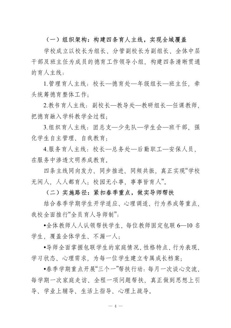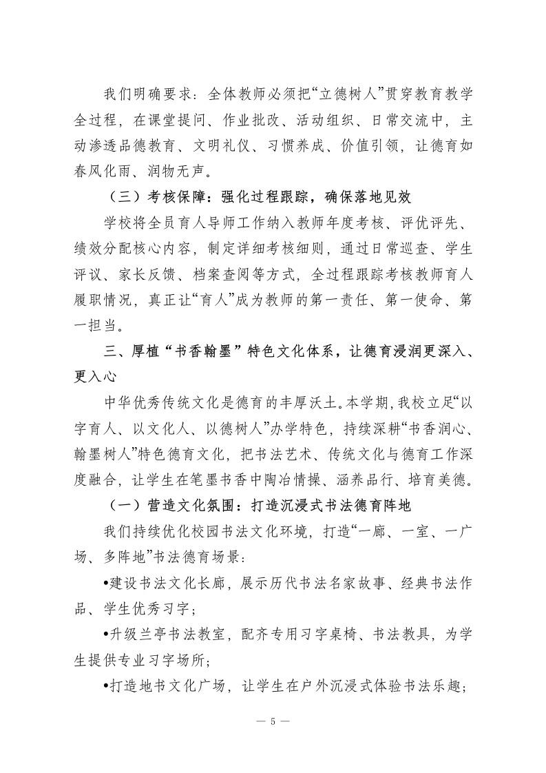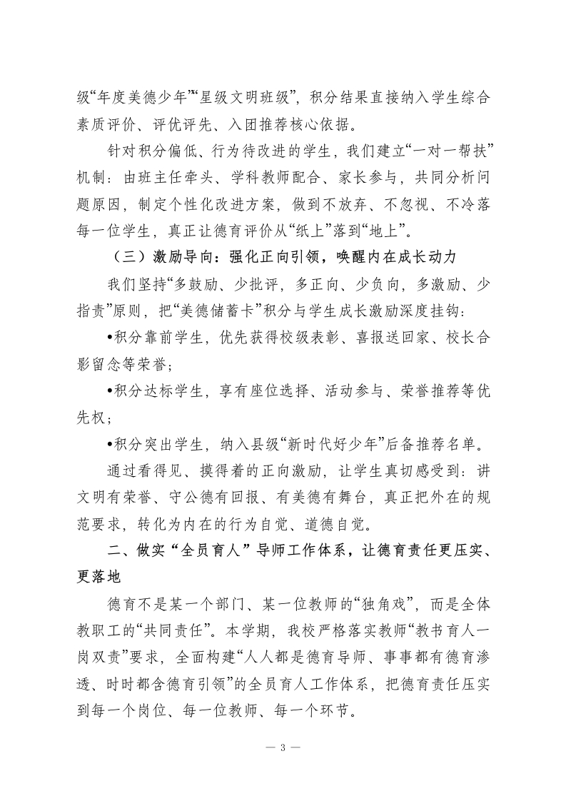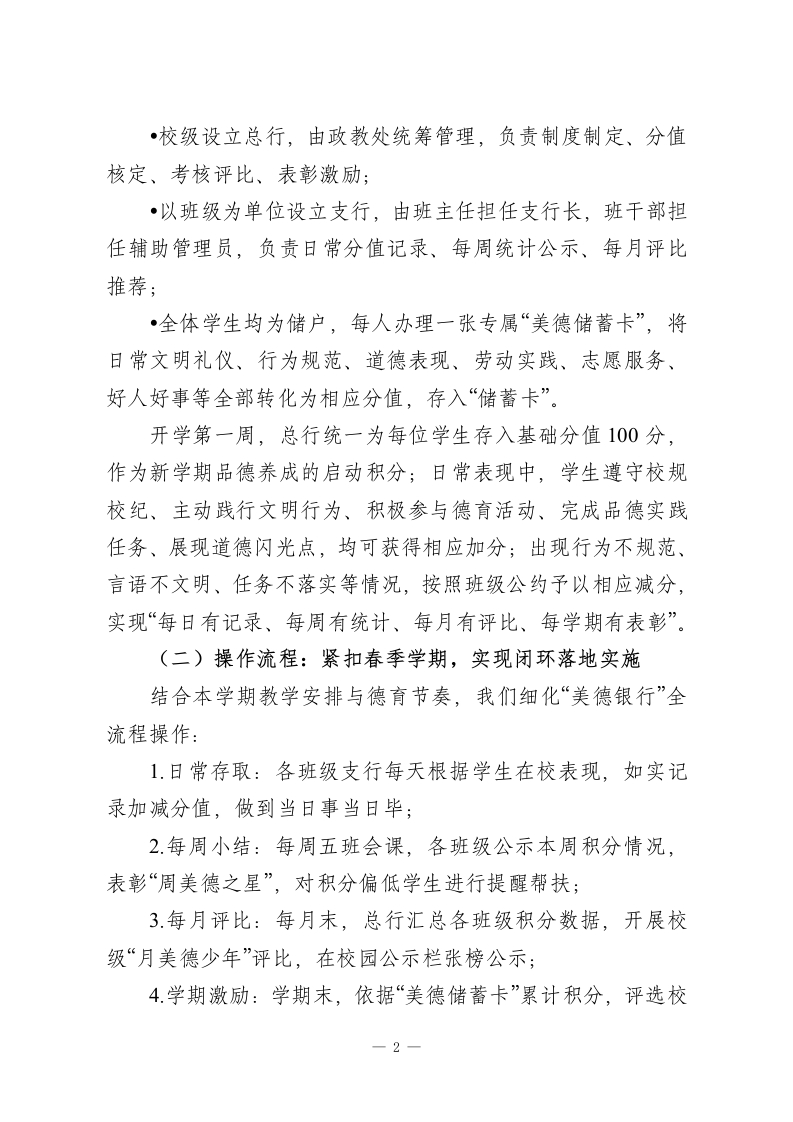 校长论坛演讲:深耕细作抓德育守正创新育新人尊敬的各位领导、各位同仁:大家好!如何把德育工作抓具体、抓深入、抓出实效,如何构建贴合校情、贴近学生、贴近实际的特色德育体系,如何让每一位孩子在常态化德育浸润中明大德、守公德、严私德,是我们每一所学校、每一位校长必须答好的时代考题。今天,我谨代表学校,围绕本学期特色德育落地实施这一主题,与各位同仁交流我校的具体做法、实践路径与工作思考,旨在互相学习、共同探讨、携手提升。一、创新“美德银行”积分管理模式,让德育评价更具象、更可感长期以来,学生品德评价存在重结果、轻过程,重定性、轻定量,重说教、轻激励的问题,评价方式偏笼统、偏模糊,难以真正唤醒学生的道德自觉、行为自觉。本学期,我校立足学生行为习惯养成、品德素养培育的实际需求,创新推行“美德银行”积分管理新模式,把抽象的道德表现转化为可记录、可累计、可评比、可激励的“道德财富”,让德育评价真正走进日常、走进细节、走进学生心里。(一)运行机制:模拟银行储蓄,实现全程动态管理我们以“储蓄文明、积累美德、培育品行”为核心,参照银行储蓄管理模式,搭建校级“美德银行”总体系:-1