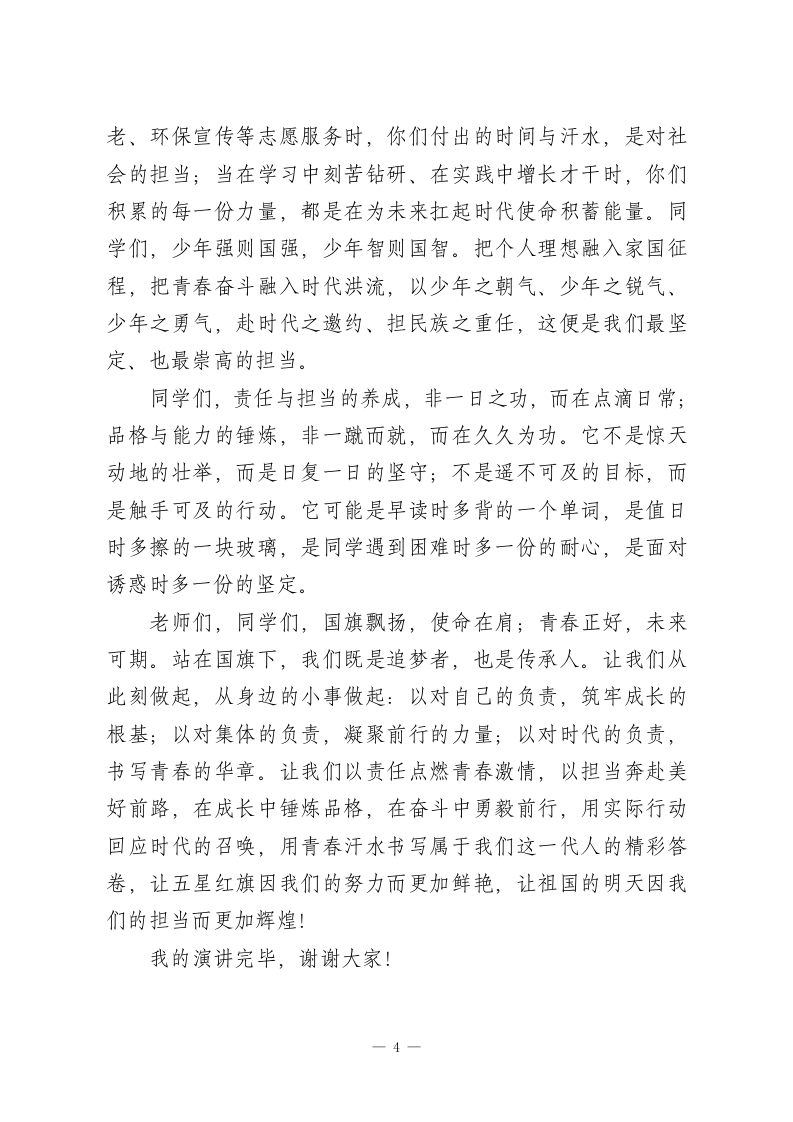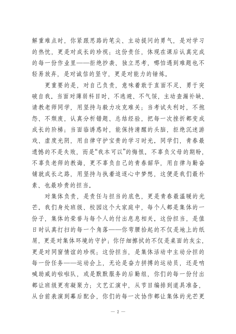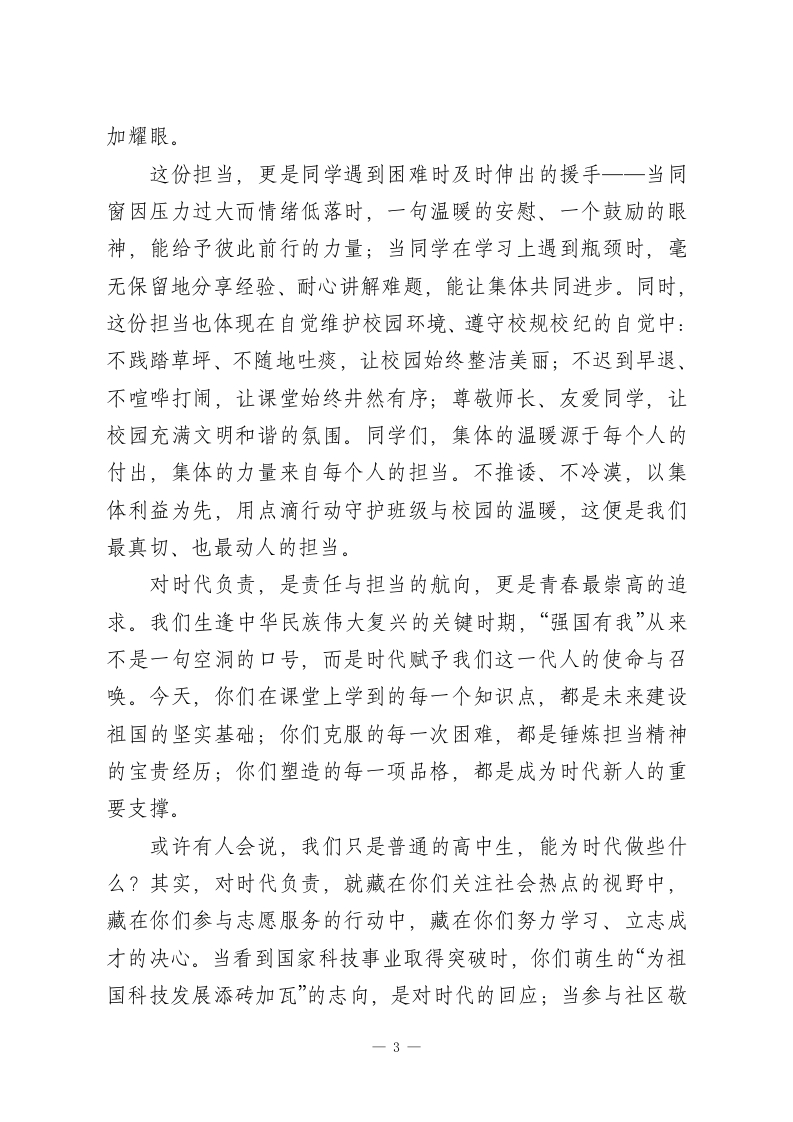校长在国旗下演讲:责任与担当,新时代高中生的青春答卷尊敬的各位老师,亲爱的同学们:大家早上好!当清晨的第一缕阳光洒满校园,当雄壮的《义勇军进行曲》在耳畔庄严奏响,我们怀着无比崇敬的心情,注视着五星红旗冉冉升起、迎风飘扬。这面鲜红的旗帜,承载着民族的希望与时代的使命;这片充满书香的校园,是你们青春绽放、梦想启航的舞台。站在国旗下,站在青春的赛道上,我常常思考一个问题:新时代的高中生,该以怎样的姿态肩负使命、奔赴成长?今天,我想以《责任与担当》为题,与大家分享我的感悟与期许。有人说,责任与担当是遥不可及的宏大口号,是成年人的沉重负担。但在我看来,它从来不是写在纸上的空洞誓言,更不是挂在嘴边的响亮口号一一它藏在校园日常的每一个选择里,融在我们学习生活的每一个瞬间中,是我们每个人都能身体力行的坚守,是青春最动人的底色。对自己负责,是责任与担当的起点,更是人生最坚实的根基。高中三年,是你们世界观、人生观、价值观形成的关键时期,是锤炼本领、塑造品格的黄金岁月。这份责任,藏在早读课上不敷衍的朗朗书声里一一当别人还在昏昏欲睡时,你挺直的腰背、专注的神情,是对知识的敬畏,更是对自己未来的负责;这份责任,映在课堂上不松懈的专注眼神中一一当老师讲1