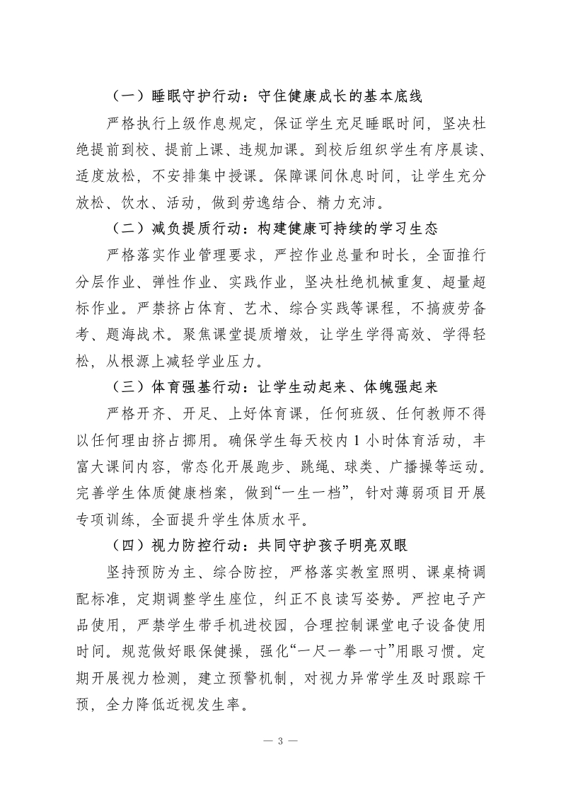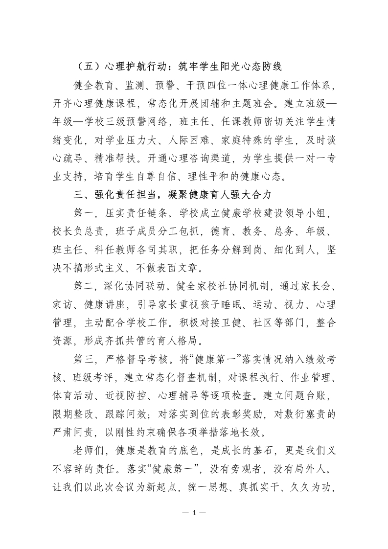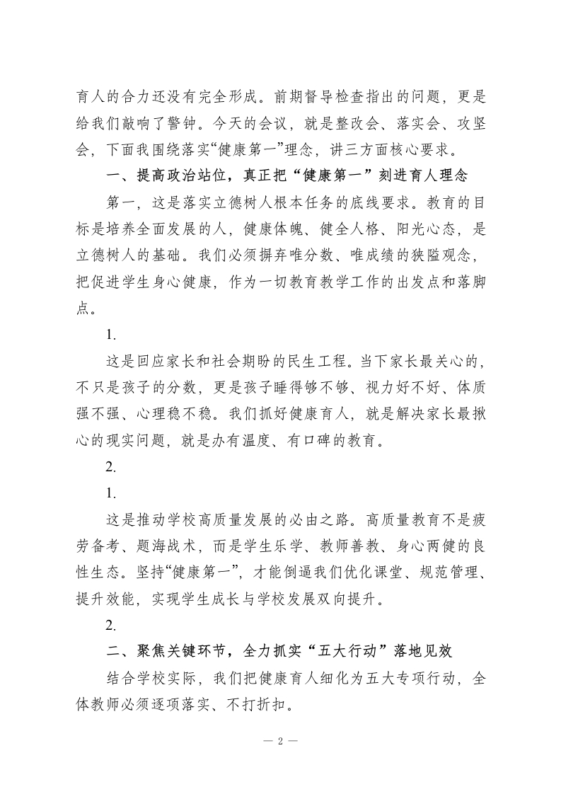 学校“健康第一”工作推进会讲话一一锚定3点要求、抓实5大行动,把健康育人落到实处各位老师:大家好!今天我们召开这次“健康第一”工作推进会,目的非常明确:深入贯彻上级关于健康学校建设的各项要求,把“健康第一”这四个字,从理念变成行动、从口号变成实效,全面整改当前工作中的短板问题,以最坚决的态度、最扎实的举措,守护全校学生的身心健康,办好真正以人为本、全面发展的教育。健康是成长的根基,是人生的“1”,知识、成绩、未来都是后面的“0”。没有健康的身体、阳光的心态,一切发展都无从谈起。近年来,国家高度重视青少年健康成长,教育部多次强调要把“健康第一”摆在教育教学的首要位置,坚决纠正“重分数、轻体质、轻心理”的片面育人倾向。对我们学校而言,推进健康学校建设,不是一项临时性任务,而是必须长期坚守的育人底线,是回应家长期盼、办好人民满意教育的核心工程。回顾前一阶段工作,我们在学生体质提升、心理健康教育、作业减负等方面做了一些尝试,但对照上级标准和学生实际需求,差距依然明显:部分教师的育人理念还没有真正转变,依然存在挤占体育活动、超时布置作业、忽视学生状态的现象;学生睡眠管理、近视防控、体质监测等工作不够系统细致;心理健康干预多为被动应对,缺乏前置预警;家校协同推进健康1