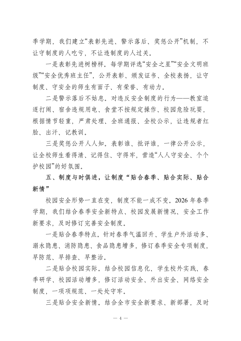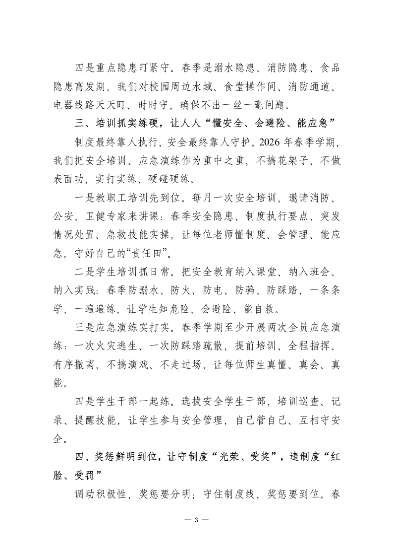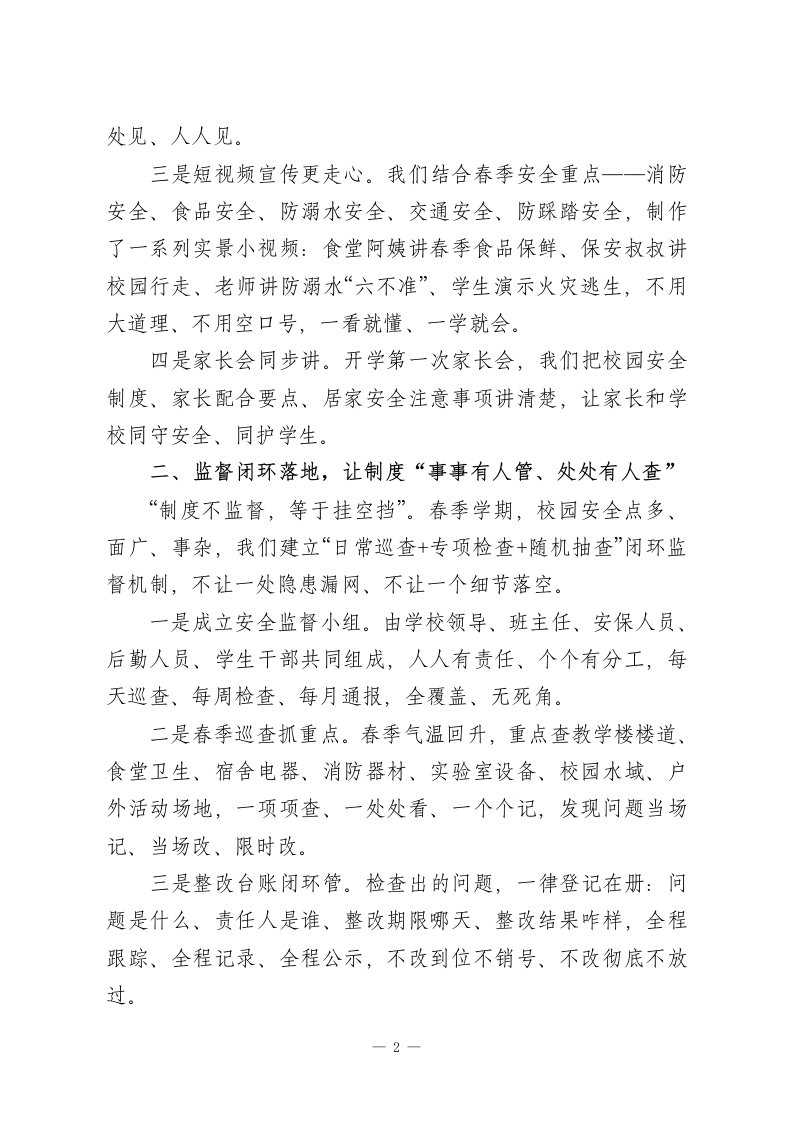 学校安全工作经验交流会上校长发言:让纸上的安全制度,真正变成守护师生的“安全盾”尊敬的各位领导、各位教育同仁:大家好!今天,全市齐聚一堂交流学校安全工作,核心只有一个:让纸上的安全制度,真正变成守护师生的“安全盾”。制度不是挂在墙上、念在嘴上的空话,而是落在日常、管在细节、护在全程的实在举措。2026年春季学期,学生返校、活动增多、气温回升,各类安全隐患进入高发期,唯有把制度执行抓到底、守到位,才能守住校园平安。下面,我结合学校实际,谈几点具体做法。一、宣传入脑入心,让制度“人人知晓、句句牢记”制度要落地,首先得人人懂、人人记、人人认同。春季学期开学,我们把安全宣传作为“开学第一课”,不搞大讲座、空说教,而是贴近学生、贴紧春季、贴紧日常。一是开学教育抓重点。老生返校,第一堂班会必讲安全:校园行走、教室纪律、食堂就餐、宿舍管理、户外活动安全,一条条讲清楚、一个个说到位,让学生一进校园就明白“什么能做、什么不能碰、什么必须守”。二是多渠道宣传全覆盖。校园广播每天播一条春季安全提示,宣传栏每周换一期安全知识,公众号每周推一篇安全案例,班主任每天在班级群发一条安全提醒,让安全知识天天见、处1