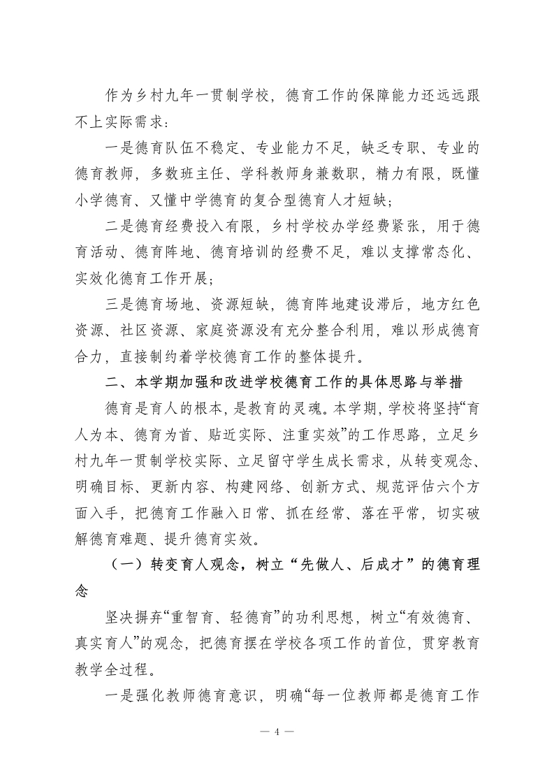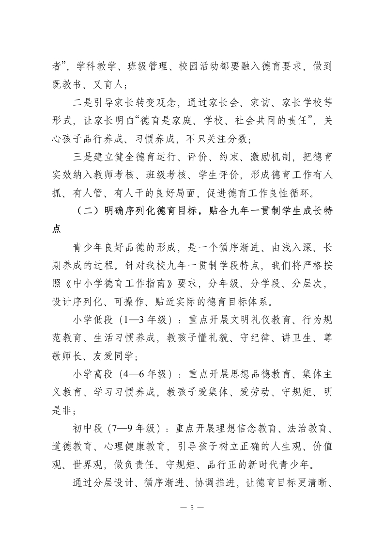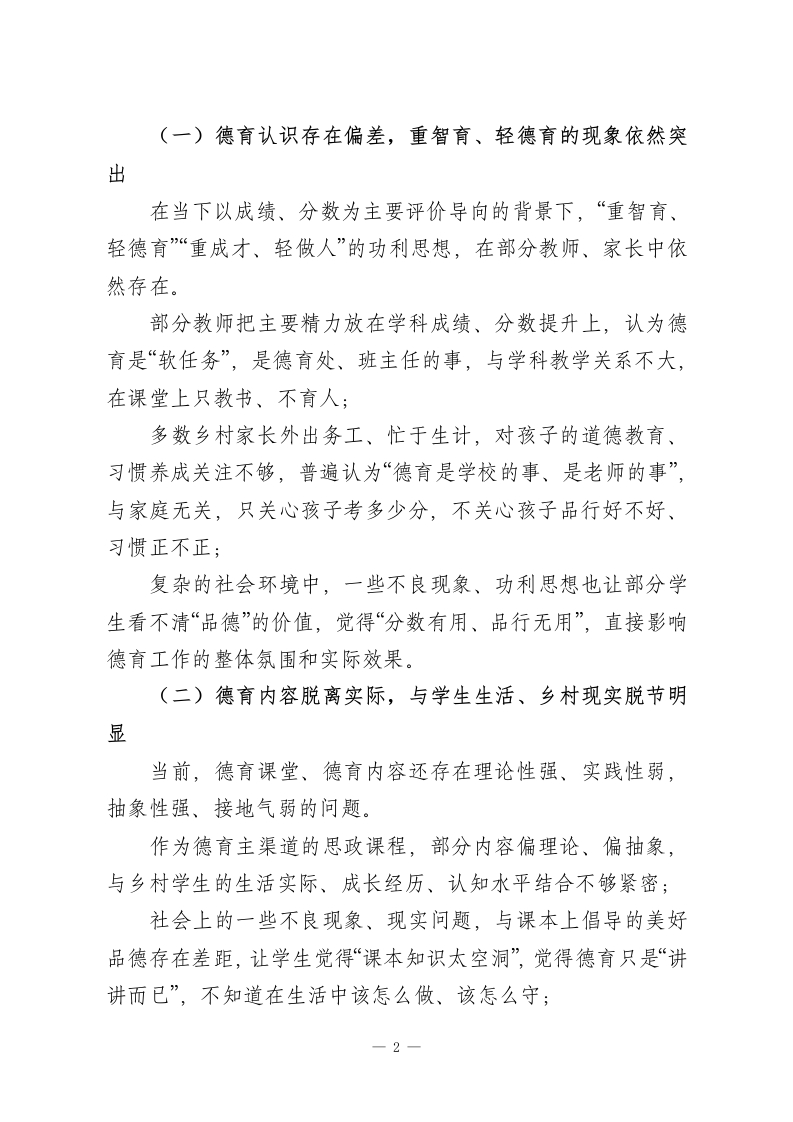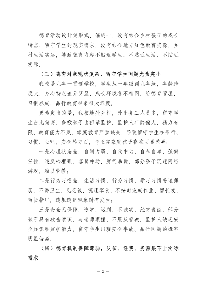 学校德育工作调研校长汇报:守好育人初心,抓实德育实效各位领导、老师们:作为一所地处乡村、承载红色教育底蕴的九年一贯制学校,我们既是省级爱国主义教育基地,也是市、县两级连续多年的“文明单位”,更是传承地方教育文脉、守护乡村孩子成长的主阵地。在教育高质量发展的新形势下,在乡村家庭教育缺失、社会环境复杂、留守学生占比偏高的现实背景下,如何把德育工作抓实、抓细、抓出实效,如何破解“重分数、轻做人”的现实困境,如何让每一个孩子先成人、再成才,成为我们本学期必须答好的核心课题。近期,学校围绕德育工作开展了全面调研,通过走进课堂、深入班级、访谈师生、沟通家长、梳理问题,既看到了多年来德育工作积累的成效与荣誉,也清醒认识到当前德育工作面临的实际困难、突出问题和现实困惑。下面,我结合本学期工作实际,就学校德育工作存在的问题、改进的思路和具体的举措,作全面汇报。一、当前学校德育工作面临的实际困难和突出问题我校作为乡村九年一贯制学校,学段跨度大、学生差异明显、留守学生占比偏高、家庭教育基础薄弱,这些现实特点让德育工作面临诸多实际挑战。当前,学校德育工作还存在认识不到位、内容不接地气、对象差异大、保障跟不上的突出问题,直接影响德育实效,也制约着育人质量的整体提升。1