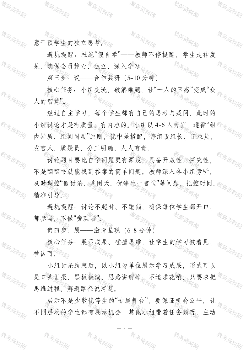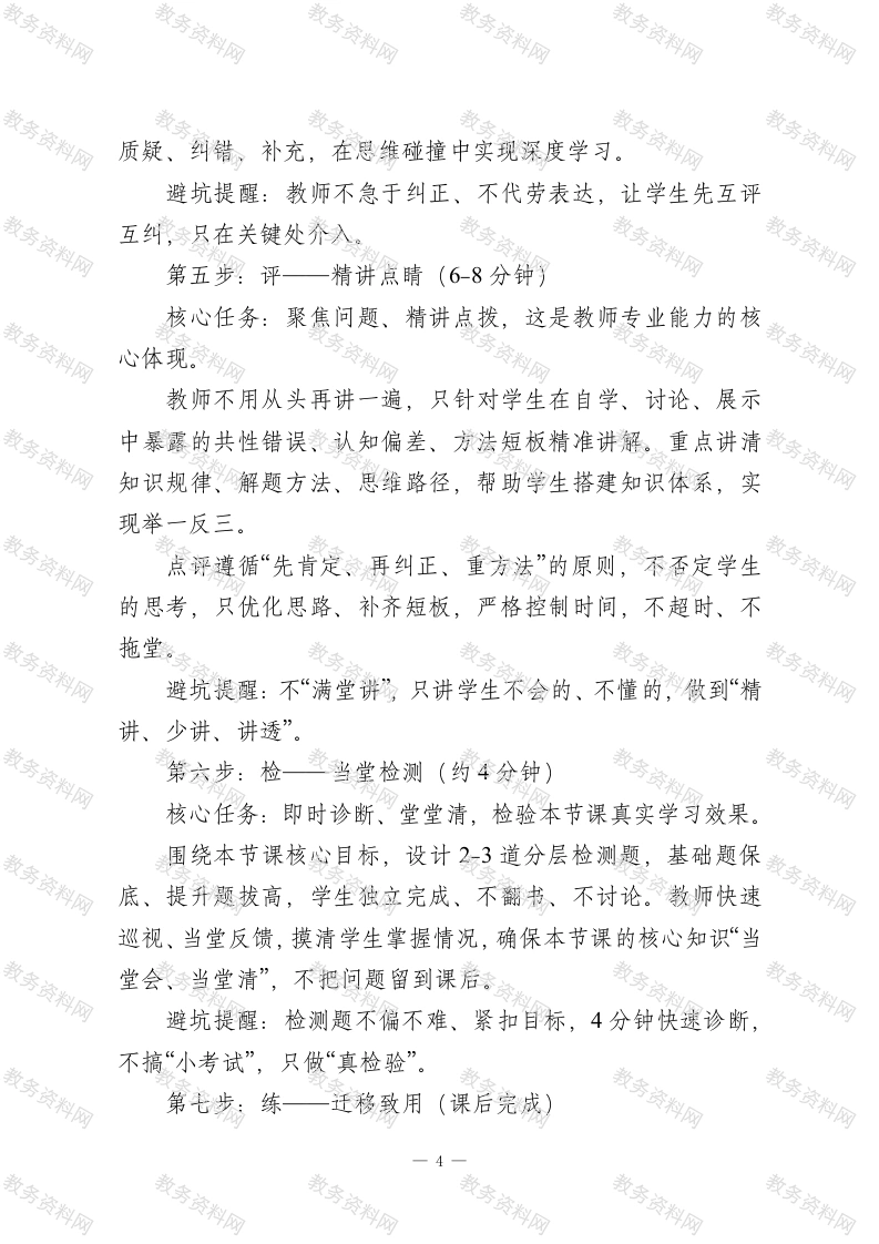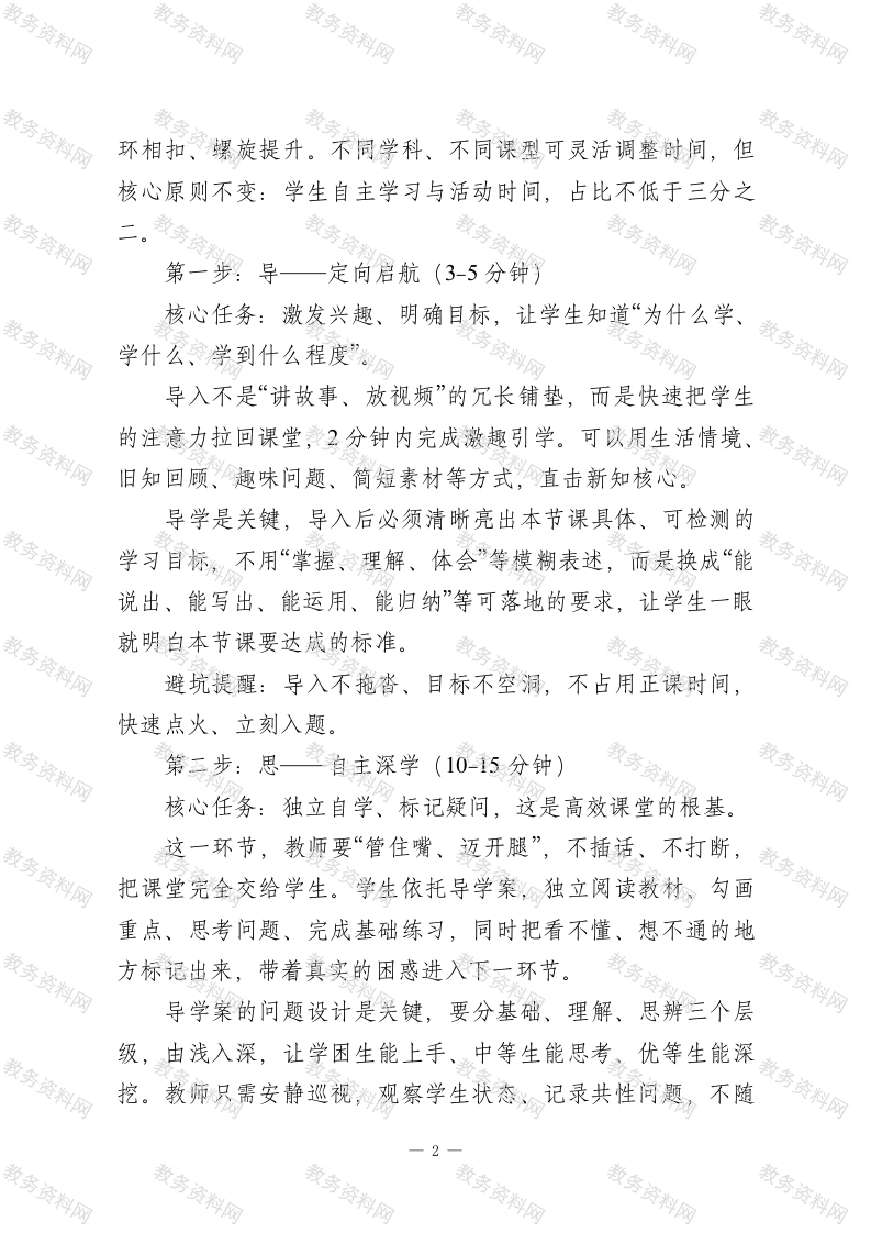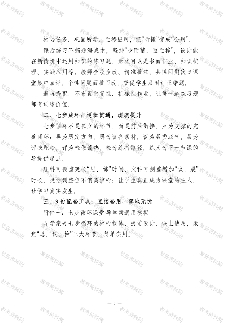 学校高效课堂“七步循环”实操指南一一让课堂真高效、教师好上手、学生真学会走进课堂听课,总能看到两种截然不同的场景:有的课堂上,学生主动思考、踊跃发言,眼神里透着专注,下课前一检测,知识点全都扎扎实实地掌握了;可更多的课堂,是教师站在讲台上讲得口干舌燥,学生坐在座位上昏昏欲睡,看似流程走得完整,实则知识没落地、能力没提升。低效课堂的核心问题,从来不是教师不认真、学生不聪明,而是课堂结构出了偏差一一教师把学生该独立思考的、该动手尝试的、该合作探究的,全都“代劳”了。课堂看似被知识填满,学生却始终处于被动接收的状态,看似听懂了,一做题就出错,一应用就卡壳。真正的高效课堂,核心从来不是“教师讲得多精彩”,而是“学生学得有多深”。教师要从“主讲的演员”转变为“导学的导演”,把课堂的主动权、时间权、思考权,彻底还给学生。结合多年课堂观察与一线教学实践,我们梳理出高效课堂七步循环教学法,以“导、思、议、展、评、检、练”七个环节为核心,形成“课内闭环学习+课后巩固迁移”的完整教学链条,没有花架子、全是实操点,一线教师拿来就能用、课堂就能变样。一、七步循环课堂:每一步都落地,每一分钟都有效七步循环不是固定不变的死板流程,而是贴合学生认知规律的教学逻辑,前六步在课堂内完成,第七步延伸至课后,环—1