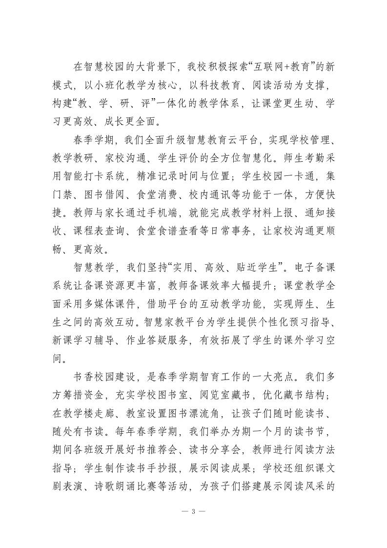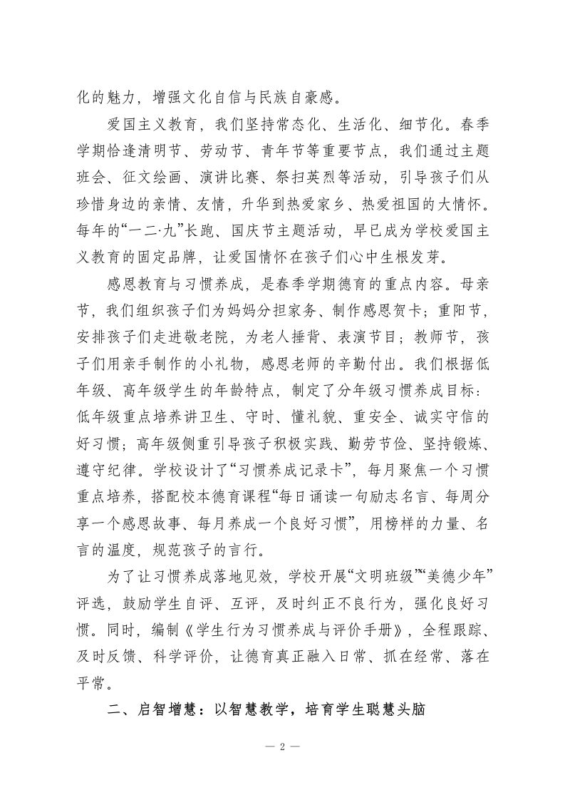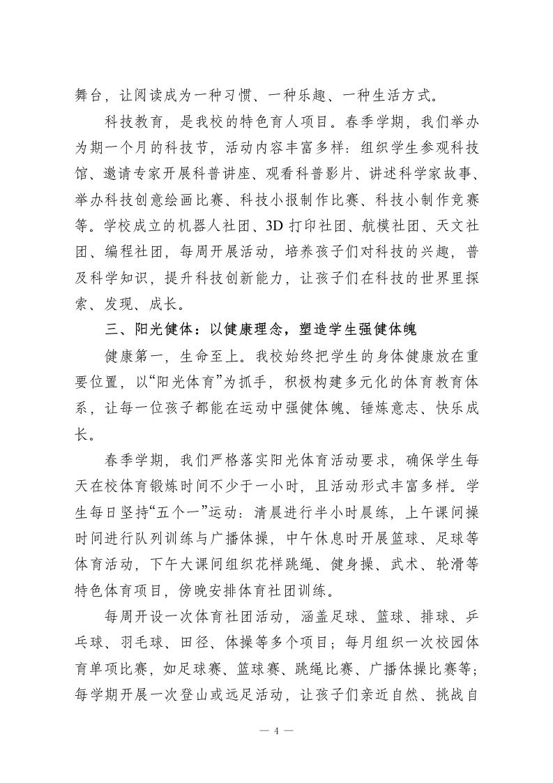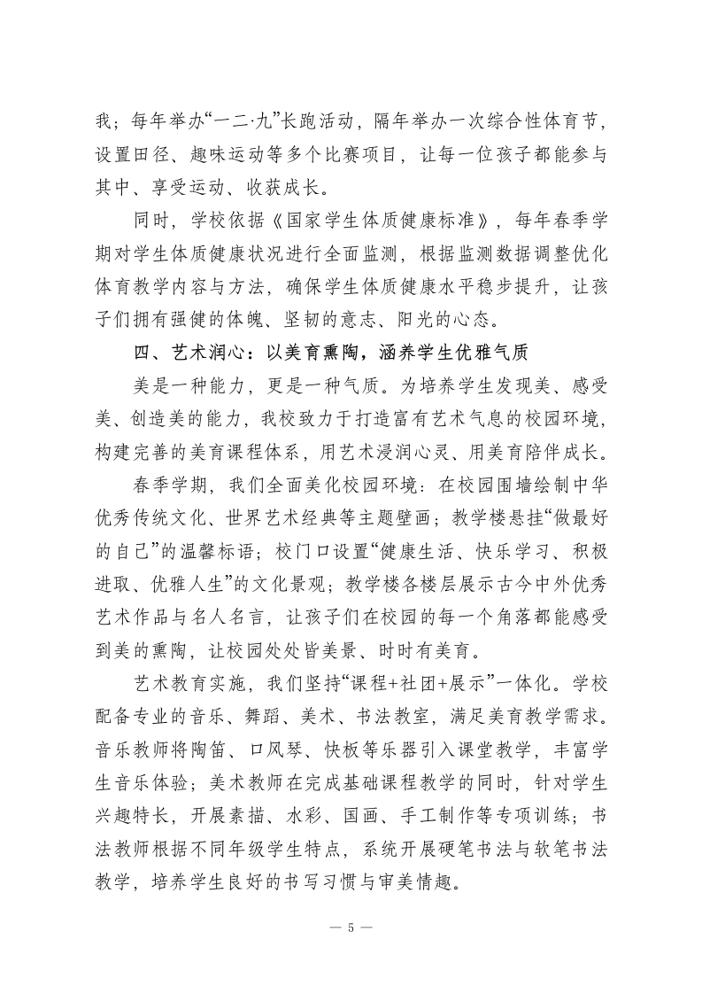 学校管理育人工作交流会上校长发言:深耕五育融合,共育时代新人尊敬的各位领导、各位教育同仁:大家好!在新时代立德树人的根本任务指引下,“五育融合”早已不是一句抽象的教育口号,而是融入校园日常、扎根育人细节、陪伴学生成长的真实教育行动。今天,能在这里和各位同仁交流我校在“五育融合”方面的实践、思考与探索,我倍感荣幸。接下来,我将结合学校春季学期的具体工作,从德育、智育、体育、美育、劳育五个维度,和大家分享我们的育人做法与心得。一、立德铸魂:以暖心德育,滋养学生向善心灵德育是育人的根与魂。我校始终把“立德树人”放在首位,以社会主义核心价值观为引领,坚持“德为先、才为基、品为重”的育人理念,用贴近学生、贴近生活、贴近日常的暖心德育,滋养每一位孩子的向善心灵。春季学期,我们把中华优秀传统文化融入日常晨读。精心编写的《三字经》《弟子规》校本读本,成为孩子们每天清晨的“精神早餐”。20分钟的晨读时光,没有生硬的说教,只有师生共读的温馨;10分钟的放学巩固,没有枯燥的背诵,只有潜移默化的美德熏陶。除此之外,学校开设的书法、戏曲、围棋、国画等传统文化社团,每周定期开展活动,每学期举办社团成果展示,让孩子们在笔墨、戏曲、国画中感受中华优秀传统文1