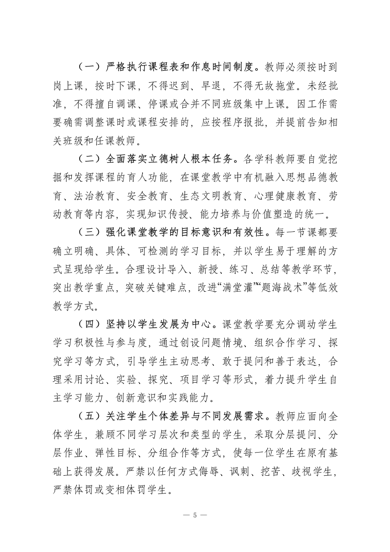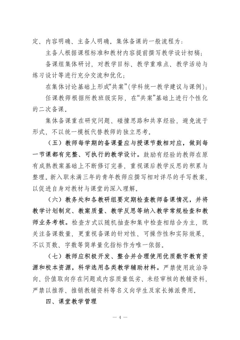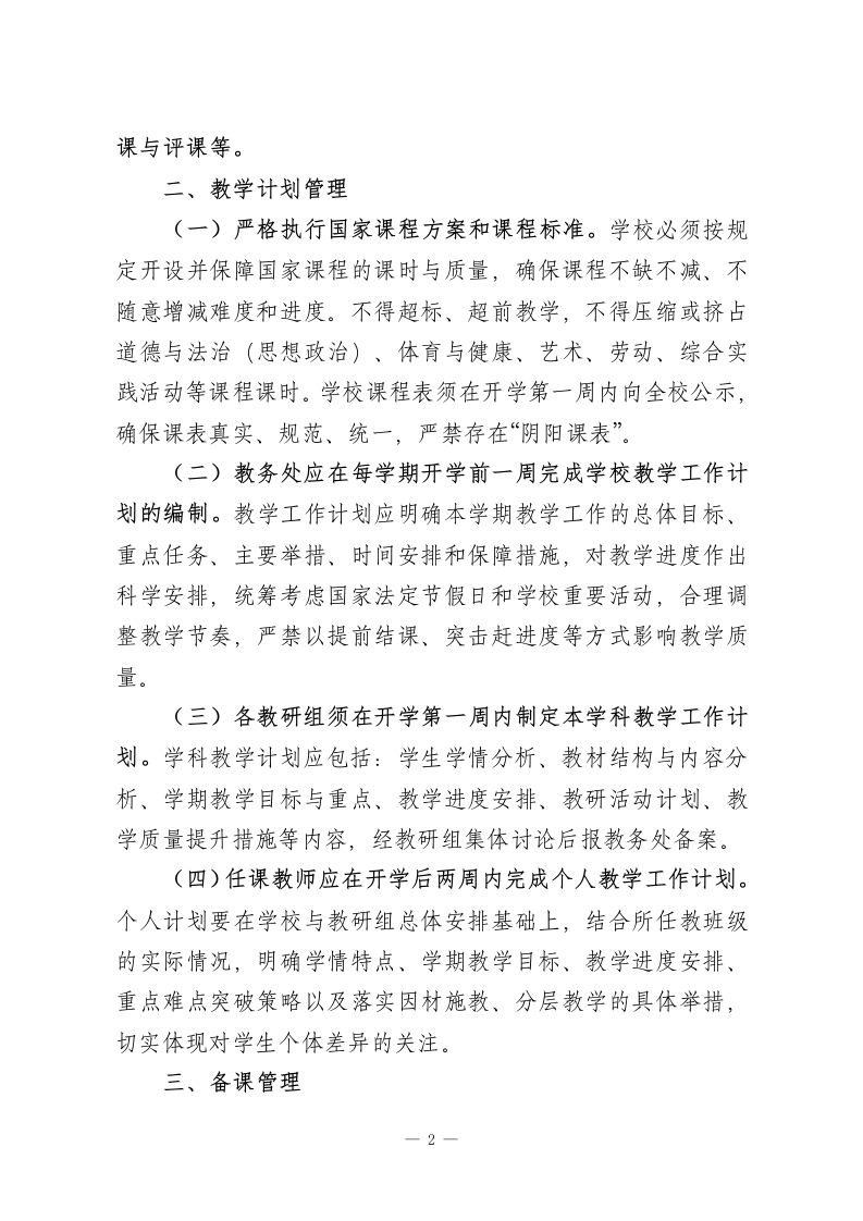 学校教学常规管理实施细则(2026版)公布为全面贯彻党的教育方针,落实立德树人根本任务,深入推进《教育强国建设规划纲要(2024一2035年)》和基础教育“规范管理巩固年”有关要求,进一步加强和规范学校日常教学管理,提升教育教学质量,促进学生全面而有个性的发展,结合学校实际,特制定本实施细则。一、总则(一)教学常规是学校教学工作的基本制度和操作规范,是教师开展课堂教学和教育活动必须遵守的行为准则。全体教师应自觉将教学常规内化为职业素养和日常习惯,在教学实践中做到尊重教育规律、守住工作底线、遵循制度要求。(二)教学常规管理坚持“规范运行与激发活力并重”的原则。一方面要保障教学秩序稳定、教学行为合规,另一方面要充分尊重教师的专业判断与自主权,鼓励教学方式方法上的探索与创新,为教师安心从教、静心育人营造良好环境。(三)教务处(教导处)是教学常规管理的职能部门,负责教学常规制度的组织实施、过程监管、指导服务和考核评价。各教研组、备课组在教务处统筹下,承担本科(学科)教学常规的具体落实、过程管理和日常督导。(四)教学常规管理覆盖学校教学工作的各个环节,主要包括:教学计划制定与执行、备课、课堂教学、作业布置与批改、辅导与学业指导、考试与学业评价、教研与校本培训、听1