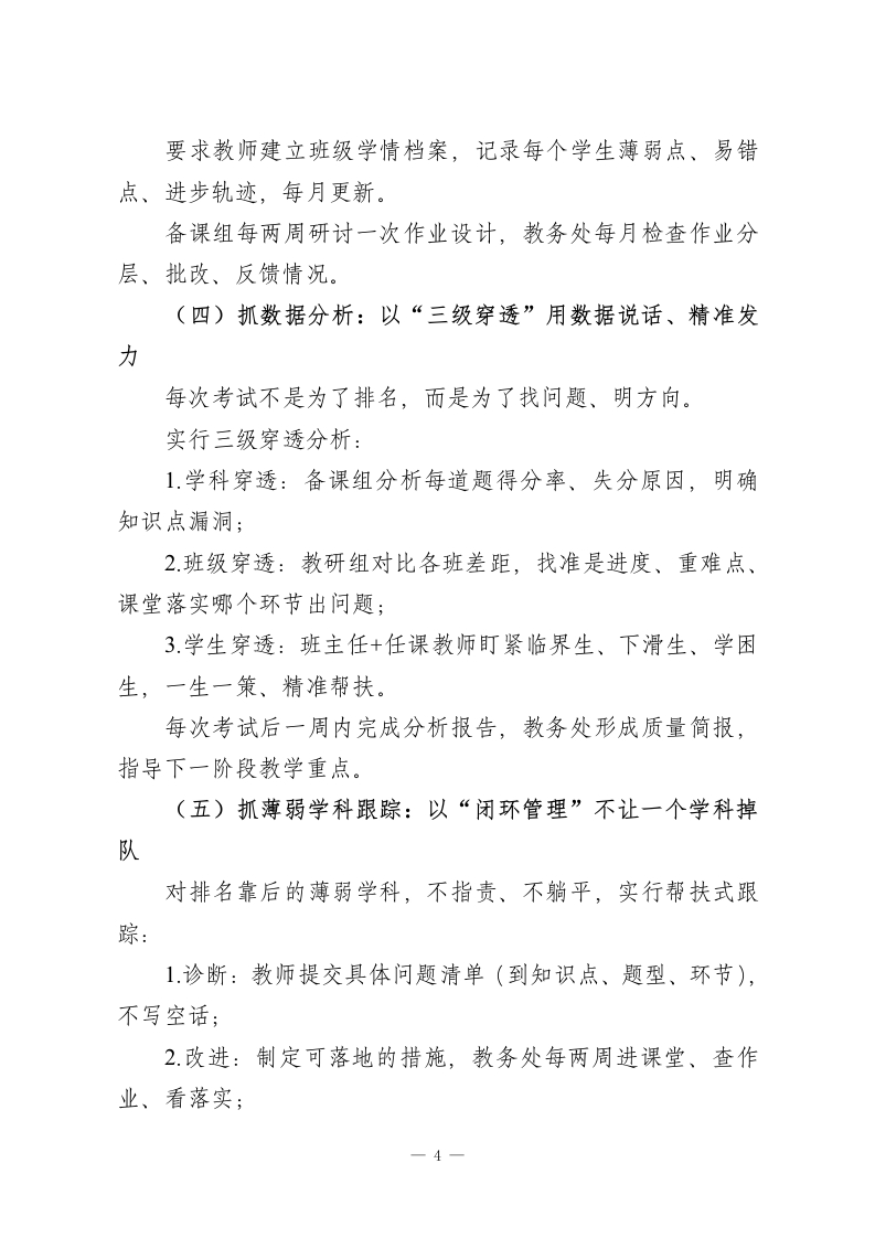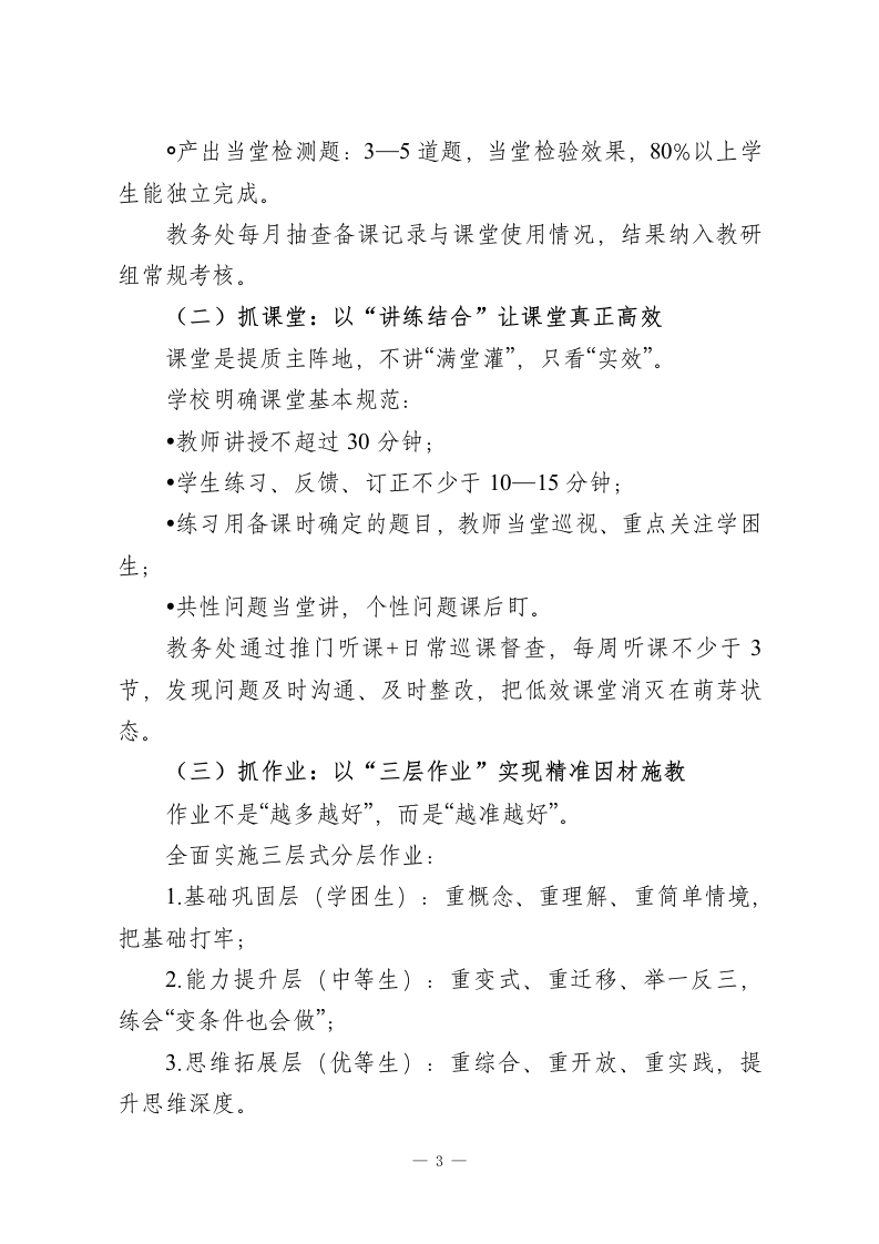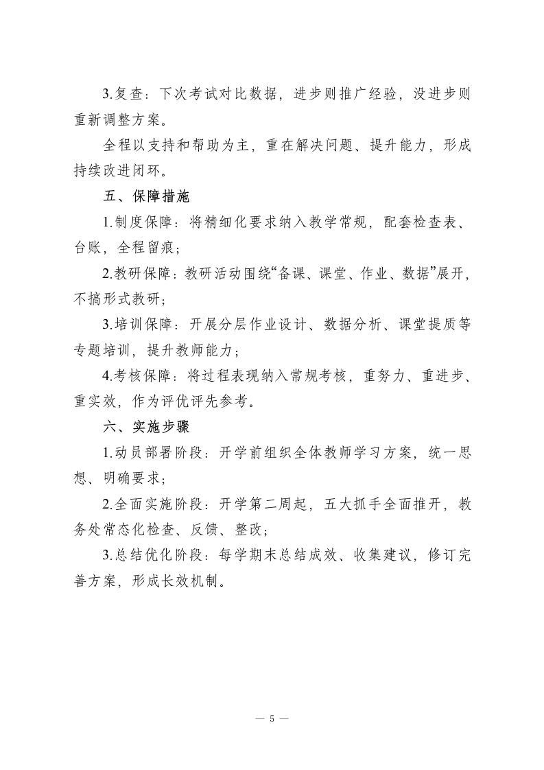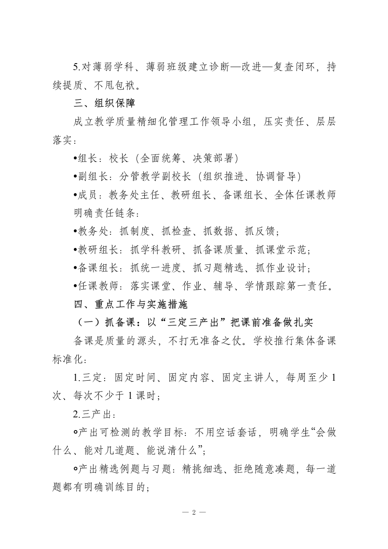 学校教学质量提升精细化管理实施方案:五大关键抓手,提升教学质量一、指导思想坚持以教学为中心、以质量为生命线,把精细化管理落到日常教学的每一个环节。围绕备课、课堂、作业、数据分析、薄弱学科跟踪五大关键抓手,构建全过程、可落地、可追踪的教学质量管理体系,推动教学管理从“重结果”向“重过程”转变、从“一刀切”向“分层教、分层学”转变、从“临时突击”向“常态长效”转变,全面提升学校整体教学质量与育人水平。二、工作目标总体目标构建一套备课规范、课堂高效、作业精准、数据赋能、跟踪闭环的教学质量管理机制,让管理看得见、过程抓得住、效果评得准。具体目标1.集体备课做到定时间、定内容、定主讲人,每次备课形成目标、习题、检测三项成果;2课堂全面落实讲练结合,保证学生每节课有效练习时间不少于10分钟;3.全学科、全年级推行分层作业,实现作业与学生水平精准匹配,不搞“一刀切”;4.考试数据实现学科一班级一学生三级穿透分析,精准定位问题;一1