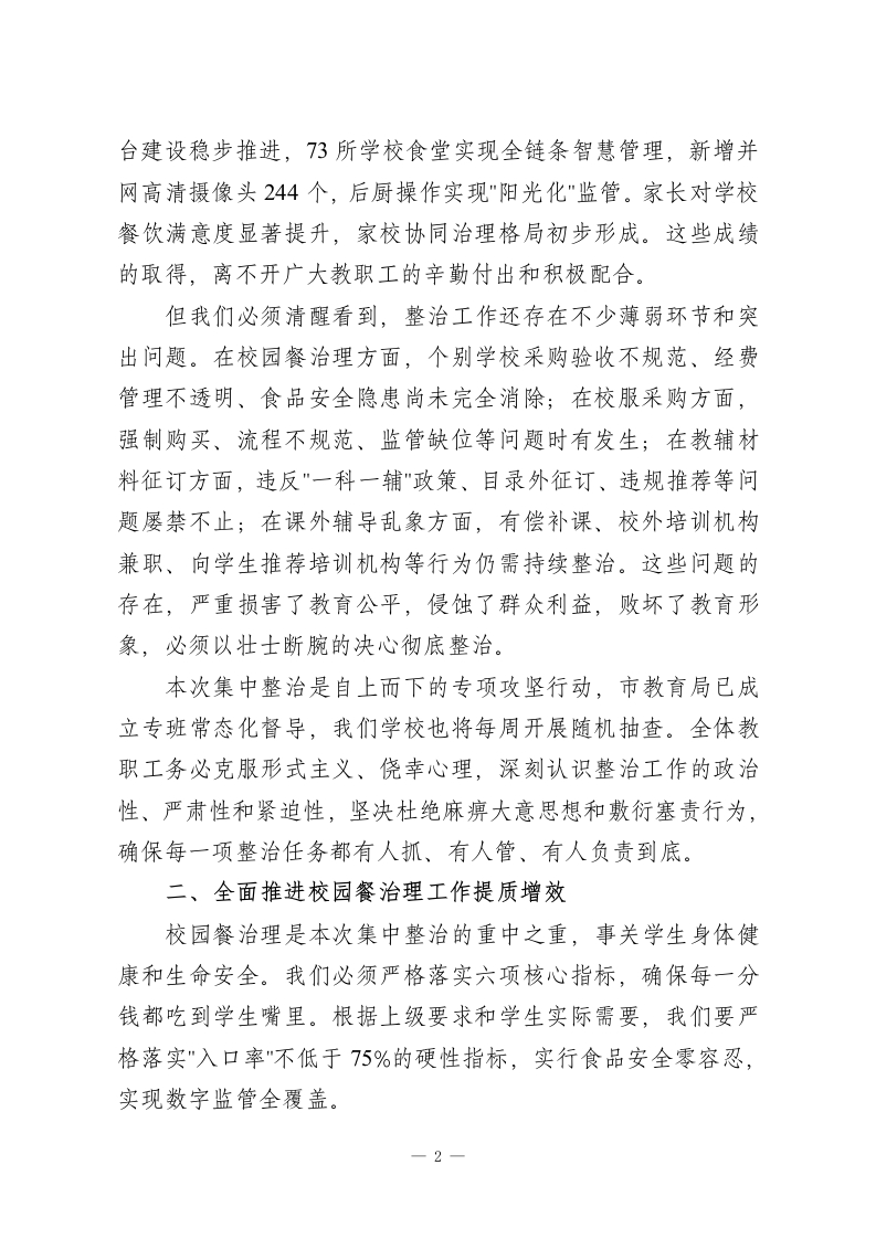 在XX市XX小学群众身边不正之风和腐败问题集中整治攻坚行动工作推进会上的讲话同志们:今天下午,我们召开全体教职工会议,主要任务是深入贯彻落实市教育局关于群众身边不正之风和腐败问题集中整治攻坚行动的相关精神,全面部署教育系统三年大行动收官阶段各项重点任务。此次会议聚焦校园餐治理、校服采购、教辅材料征订、课外辅导乱象四项核心整治工作,目的是进一步压实责任、明确纪律、强化落实,推动集中整治工作走深走实、落地见效。全体教职工要充分认识到本次会议的重要意义,以高度的政治责任感和使命感投入到整治工作中来。一、深刻认识集中整治工作的重大意义和紧迫形势当前,教育系统三年大行动已进入收官阶段,这是检验整治成效的关键环节,也是打通"最后一公里"的专项部署。群众身边不正之风和腐败问题集中整治,事关教育公平正义,事关群众切身利益,事关党和政府形象。教育事业是最大的民生工程,每一项整治工作都直接关系到学生的健康成长、家长的切身利益、社会的和谐稳定。全体教职工必须从讲政治的高度,充分认识此次集中整治工作的极端重要性。近年来,我市教育系统在群众身边不正之风和腐败问题整治方面取得了阶段性成效。据统计,全市中小学平均”入口率”已达77.26%,部分学校实现了100%的目标。数字食堂监管平1