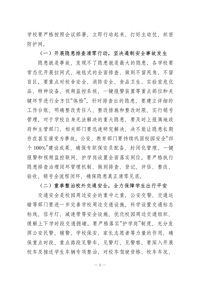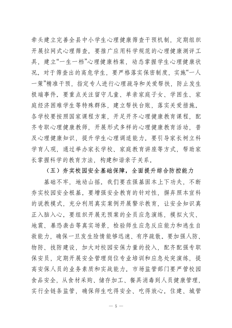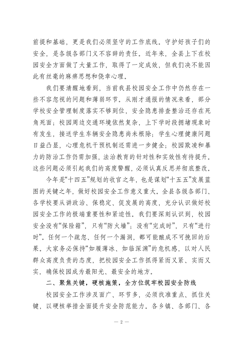 在XX县校园及周边安全工作会议上的讲话同志们:今天,我们召开全县校园及周边安全工作会议,主要任务是深入贯彻落实上级关于校园及周边安全工作的决策部署,全面分析当前我县校园安全形势,对下一阶段的安全隐患排查整治工作进行再动员、再部署、再落实。参加今天会议的有县委、县政府相关领导同志,各乡镇、县直各相关单位的主要负责同志,以及全县各中小学、幼儿园的负责同志。大家齐聚一堂,共同商讨校园安全大计,充分体现了县委、县政府对校园安全工作的高度重视,也彰显了我们守护祖国未来、保障师生安全的坚定决心。校园安全,直接关系到青少年的健康成长,关系到千千万万个家庭的幸福安宁,关系到整个社会的和谐稳定。我们必须以高度的政治责任感和历史使命感,时刻紧绷安全这根弦,坚决筑牢校园安全防线。刚才,XX同志通报了2025年预防和减少未成年人违法犯罪工作开展情况,并结合当前形势明确了各方职责;XX同志通报了近期我县校园及周边安全形势及工作整体情况;相关部门和学校作了表态发言,讲得都很具体、很实在,我完全赞同。下面,结合当前形势和任务,我讲三点意见。一、提高站位,正视问题,深刻认识校园安全工作的极端重要性孩子的安全是天大的事。校园安全稳定是所有教育工作的1