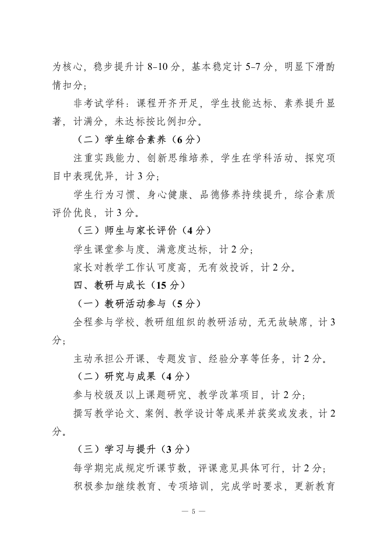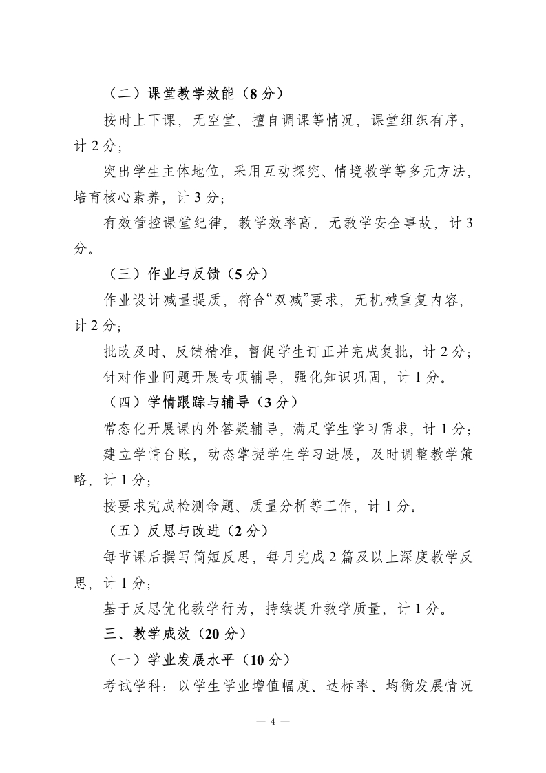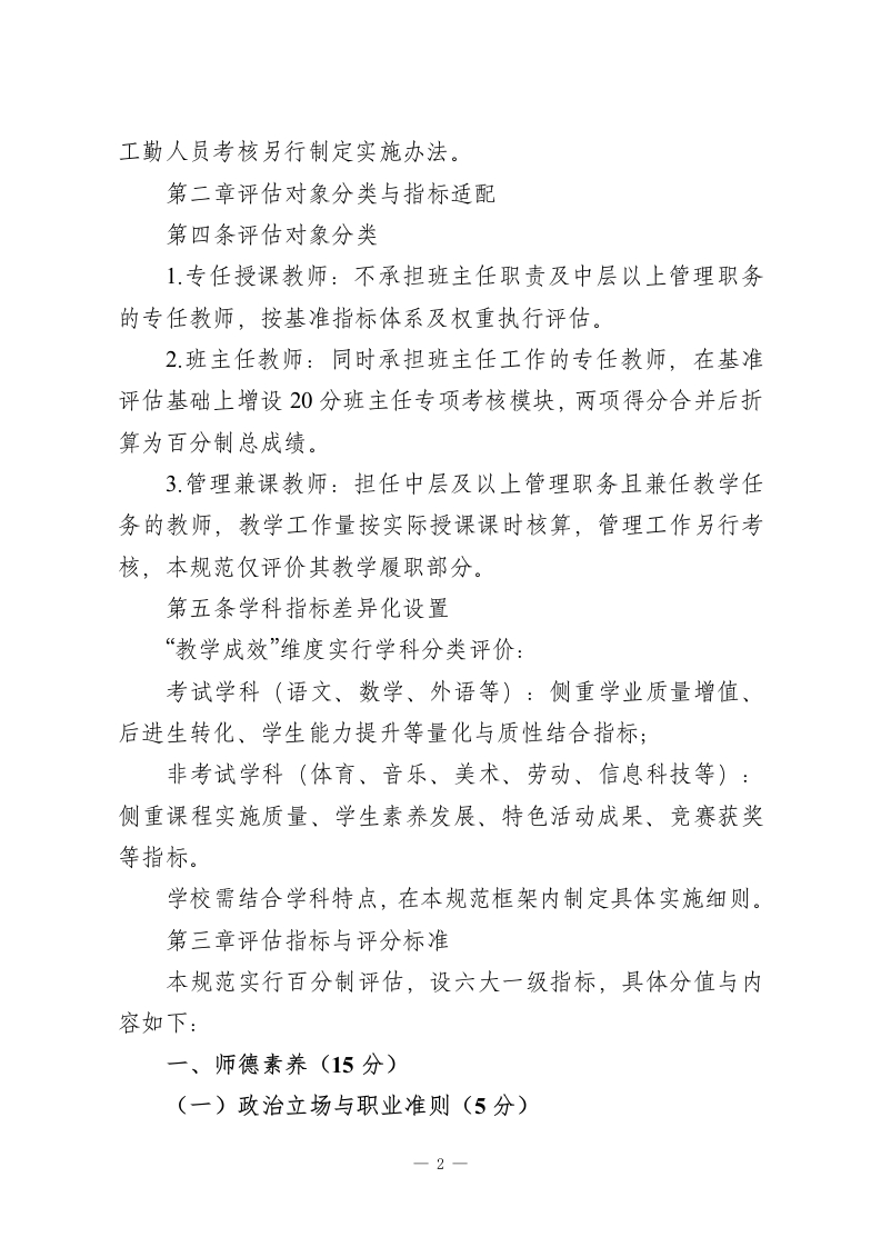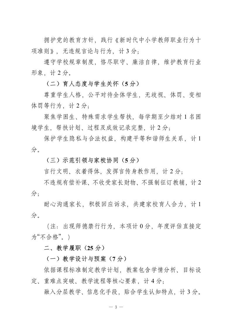 中小学教师履职质量评估规范(2026年修订版)第一章总则第一条制定依据与目的依据国家教育方针及《新时代基础教育强师计划》相关要求,聚焦“立德树人”根本任务,构建导向明确、科学公正、适配发展的教师评估体系,激励教师深耕教育教学、提升专业素养,促进中小学教育质量全面升级,特制定本规范。第二条核心原则1.师德引领,育人为核:将师德师风作为评估首要维度,严守师德“一票否决”底线,引导教师以高尚品行践行育人使命。2教学为本,质量为要:立足教育教学主责主业,兼顾过程规范与成效落地,摒弃“唯分数”“唯升学率”单一评价倾向。3.分类施策,公平适配:按岗位职责差异划分评估类别,差异化设置指标权重与考核重点,保障不同岗位、学科教师评价公平。4赋能成长,激励导向:兼顾当下表现与长远发展,以评估发现优势、补齐短板,搭建教师专业成长支持体系。5.全程贯通,综合评判:融合日常过程性记录与阶段性总结评估,全面反映教师履职全貌,确保评价结果客观真实。第三条适用范围本规范适用于各级各类中小学在编在岗专任教师。学校管理人员兼任教学任务的,其教学工作参照本规范评估;教辅、一1