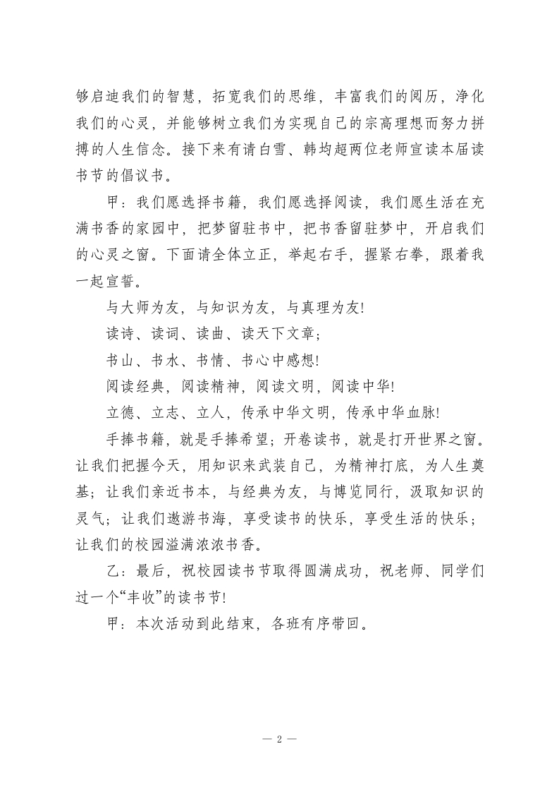 2026年“书香校园”读书节启动仪式主持词:许一程漂流撷一缕书香甲:尊敬的领导、老师,乙:亲爱的同学们,合:大家好!甲:好书,像长者,谆谆教诲。乙:好书,似导师,循循善诱甲:花开正逢春,乙:世外漫书香。合:接下来我宣布行之实验学校“最美人间四‘阅'天,春风漫卷书香来”第七届读书节启动仪式现在开始!乙:从最初的经典古诗词,到国学经典诵读,再到同学们担任阅读推荐官,我校一直在为走出一条读书强校之路而努力。乙:那敞开的门扉里,是一口淘不完的井,是一座掘不尽的矿。手捧书籍,就是手捧希望。乙:首先请李校长为本次活动致辞,大家掌声欢迎!甲:我们的生活会因阅读而多姿,我们的生命会因阅读而精彩!走进一本好书,就是找到了一位良师,觅到了一位挚友:走进书的世界,会让我们的知识丰实,见地卓越;会让我们的思想超然,心胸旷达;读书可以延展我们的生命提升我们的综合素质。接下来就请大家聆听李老师的精彩发言。大家掌声欢迎。乙:腹有诗书气自华,最是书香能致远。读书就是在和最崇高的人“对语”,读书是一种心灵的“旅行”。阅读一本好书,能-1