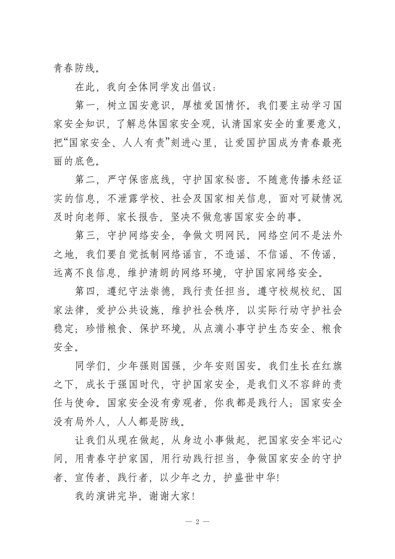 2026年国家安全教育日学生国旗下讲话稿:筑牢国家安全防线,争做新时代护国安邦好少年尊敬的各位老师,亲爱的同学们:大家早上好!春风送暖,万物向阳。今天是4月13日,我们站在庄严的五星红旗下,即将迎来4月15日全民国家安全教育日。在这个特殊的时间节点,我演讲的主题是:筑牢国家安全防线,争做新时代护国安邦好少年。或许有同学会觉得,“国家安全”是遥远的宏大命题,是军人、外交官的职责,和我们学生无关。但我想告诉大家:国家安全,从来都不是抽象的概念,它就在我们身边,与每一个人的生活息息相关。从守护国家领土完整、抵御外部风险,到维护网络空间清朗、守护生态环境安全;从保障粮食安全、经济稳定,到守护文化传承、生物安全…总体国家安全观涵盖了我们生活的方方面面。国家安宁,我们才能安心读书、幸福生活;山河无恙,我们才能追逐梦想、奔赴未来。正所谓“国安才能家安,国兴方能民昌”,国家安全是民族复兴的根基,是人民幸福的保障。作为新时代的青少年,我们虽身处和平年代,但绝不能忘记:国家安全无小事,人人都是守护者。我们或许不能奔赴前线戍守边疆,但可以用青春行动,为国家安全筑起一道坚实的