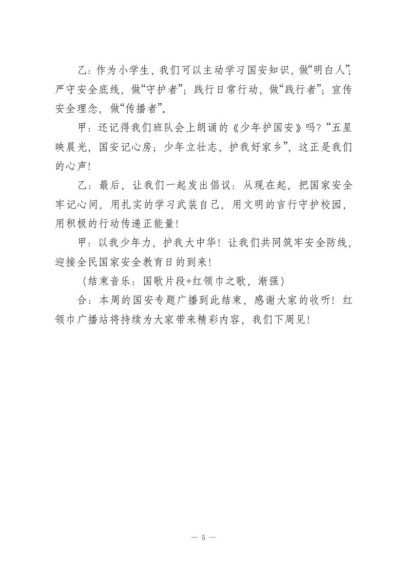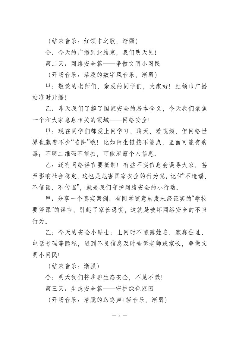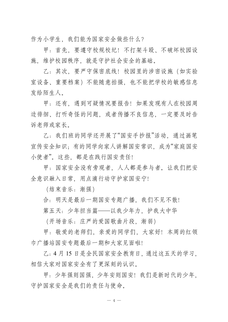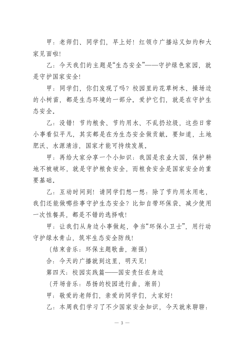 2026年全民国家安全教育日红领巾广播站系列广播稿第一天:国安小课堂一国家安全是什么?(开场音乐:轻快的校园歌曲,渐弱)》主持人甲:敬爱的老师们!主持人乙:亲爱的同学们!合:红领巾广播站又和大家见面啦!甲:我是主持人XXX。乙:我是主持人XXX。本周是全民国家安全教育周,4月15日就是我国第11个全民国家安全教育日啦!甲:提到“国家安全”,很多同学可能会觉得遥远一一是不是和军人保卫边疆有关?其实呀,国家安全涵盖方方面面,和我们每个人的生活都息息相关!乙:没错!总体国家安全观包括政治、网络、生态、粮食、文化等16个领域。简单说,国家安宁,我们才能安心读书、快乐成长;社会稳定,我们才能享受幸福生活。甲:比如,餐桌上的粮食安全让我们不挨饿,干净的空气和水源是生态安全的体现,清朗的网络环境是网络安全的保障。这些,都是国家安全的重要组成部分!乙:今天的互动提问来啦:你觉得身边哪些小事和国家安全有关?欢迎大家在班级里讨论,明天我们将揭晓答案哦!甲:国家安全,人人有责。从今天起,让我们一起走进国安小课堂,学习安全知识,争做护国安邦好少年!一1一