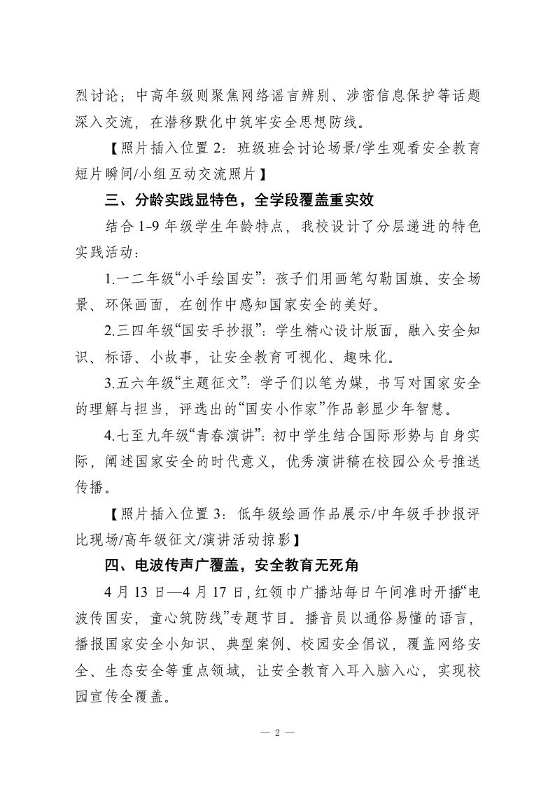 2026年全民国家安全教育日系列活动纪实:国安护万家,少年筑防线为深入贯彻总体国家安全观,增强全校1-9年级学生的国家安全意识,营造“人人学国安、人人守国安、人人护国安”的浓厚氛围,我校于2026年4月13日一4月17日开展了“国安护万家,少年筑防线”主题系列活动,将国家安全教育融入校园日常,引导青少年以实际行动守护家国安宁。一、庄严升旗启征程,国安理念入人心4月13日清晨,全校师生齐聚操场,举行主题升旗仪式。迎着朝阳,五星红旗冉冉升起,嘹亮的国歌回荡校园。学生代表以《筑牢安全防线,争做新时代护国安邦好少年》为题发表讲话,用稚嫩却坚定的声音诠释少年担当;德育主任结合当前复杂国际形势,深入解读国家安全的丰富内涵,向全体师生发出“居安思危、守护国安”的倡议。随后,XX班同学带来主题朗诵《少年护国安》,铿锵有力的诵读声彰显新时代青少年的家国情怀。【照片插入位置1:升旗仪式全景图/学生代表讲话特写/班级朗诵风采照】二、主题班会深研讨,安全知识共学习周一班队课上,各班级同步开展“国家安全记心间,平安校园共守护”主题班会。班主任通过安全教育短片、典型案例分析、互动问答等形式,向学生普及政治、网络、生态、粮食等领域的安全知识。低年级课堂上,孩子们围绕“身边的安全小事”热1