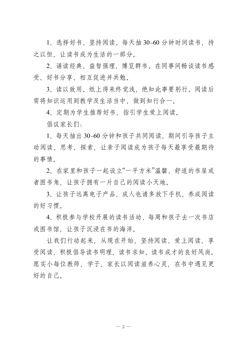 2026年中小学“书香校园”读书节活动倡议书:许一程漂流撷一缕书香腹有诗书气自华,最是书香能致远。著名作家莎士比亚说过:“生活里没有书籍,就仿佛没有阳光,智慧里没有书籍,就仿佛鸟儿没有翅膀。”书籍是人类进步的阶梯。读书可以让人保持思想活力,让人得到智慧启发,让人滋养浩然之气。一本好书往往能改变人的一生,一个人的精神成长,与他的阅读习惯息息相关,而一个民族的精神境界,在很大程度上取决于全民族的阅读水平。为深入实施素质教育,创建良好的校园文化,营造浓郁的书香氛围,增强全校师生的读书意识,实验小学诚挚地向全校师生和家长们发出如下倡议:倡议同学们:1、坚持阅读,每天抽30-60分钟静心阅读,懂得爱护眼睛,用正确的姿势阅读,养成“多读书、读好书、善读书”的好习惯。2、以家庭为单位“小手拉大手”,倡议同学们与家人同读一本书、同演一故事、同诵一人物。3、分享阅读体会,倡议同学们积极书写读书笔记,与家人、朋友分享自己喜爱的书籍、故事。4、听故事,温经典,倡议同学们积极听故事、温经典,致敬革命先烈,传承红色基因。5、积极参加学校开展的各类读书活动,勇敢秀出你的风采。倡议老师们: