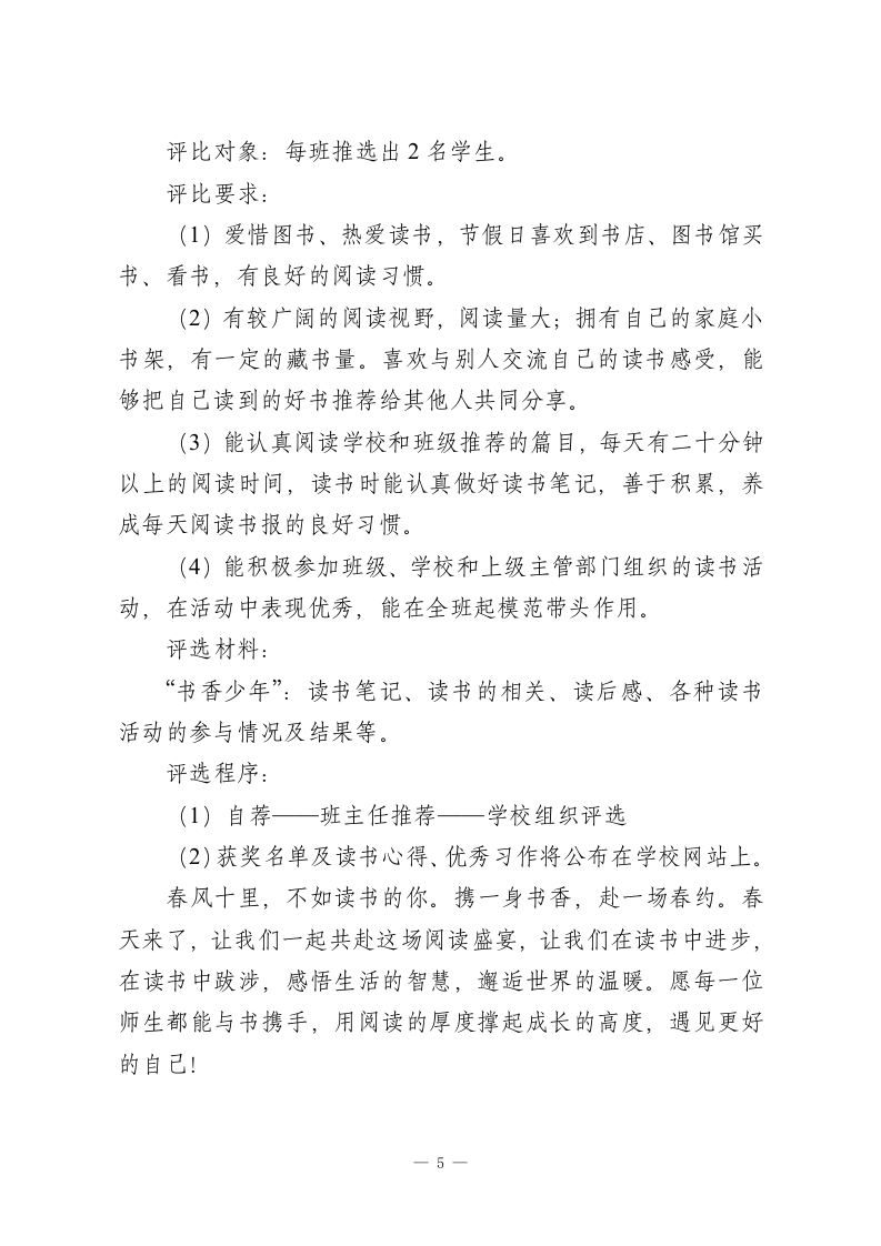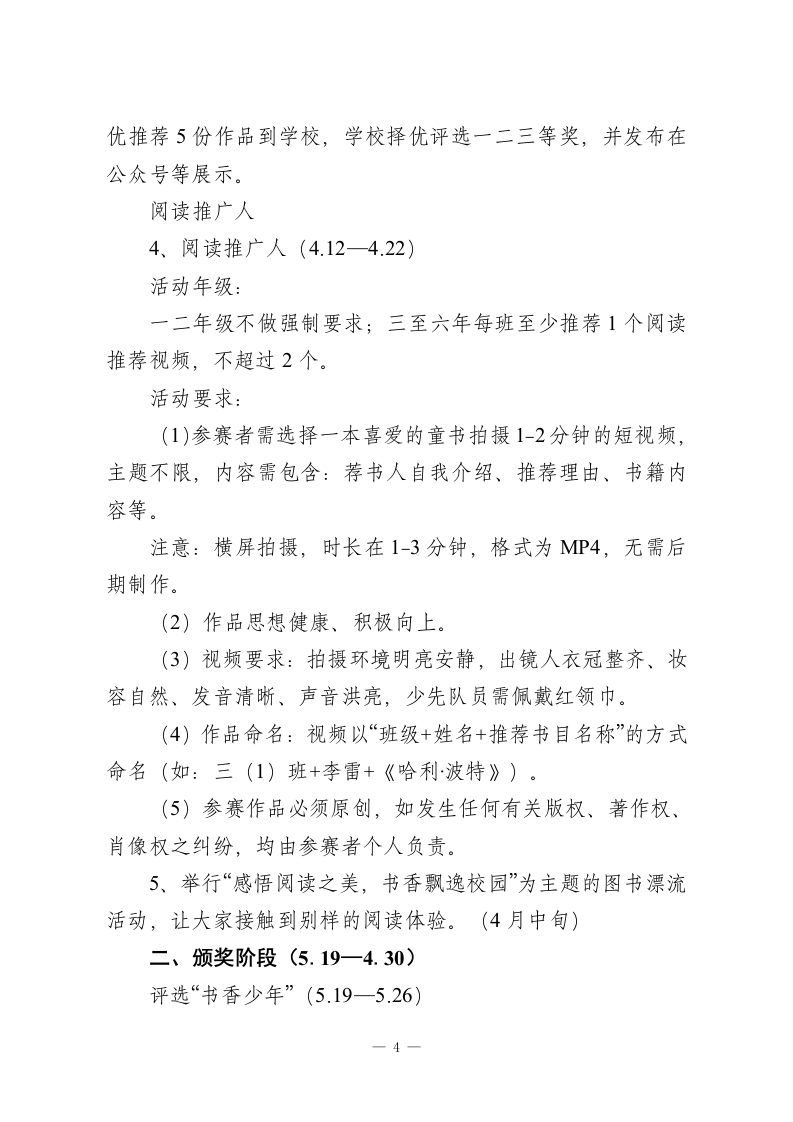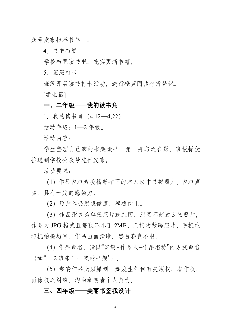 2026年中小学“书香校园”读书节活动方案:许一程漂流撷一缕书香一、指导思想好书,像长者,谆谆教诲;似导师,循循善诱;如朋友,心心相印。花开正逢春,世外漫书香。为了深入实施素质教育,落实“双减”政策,创建书香校园,营造浓郁的读书氛围,行之实验小学开展以“最美人间四‘阅'天春风漫卷书香来”为主题的第七届校园读书节活动,旨在激发学生读书的兴趣与热情,养成良好阅读习惯,让书籍为学生打开知识之窗,开启思想之门,以丰富知识,开阔视野,活跃思维,陶冶情操。二、活动主题最美人间四阅’天,春风漫卷书香来三、活动时间2026年4月一5月四、活动安排一、启动阶段(4.9一4.15)1、公众号宣传公众号发布读书节活动方案,在校门口展板进行校内展示宣传,校内布置读书名言。2、启动仪式4.15启动读书节开幕仪式,校长发起读书节阅读倡议。3、阅读推荐活动语文各年级备课组商定读书节阅读书目推荐,并在学校公一1