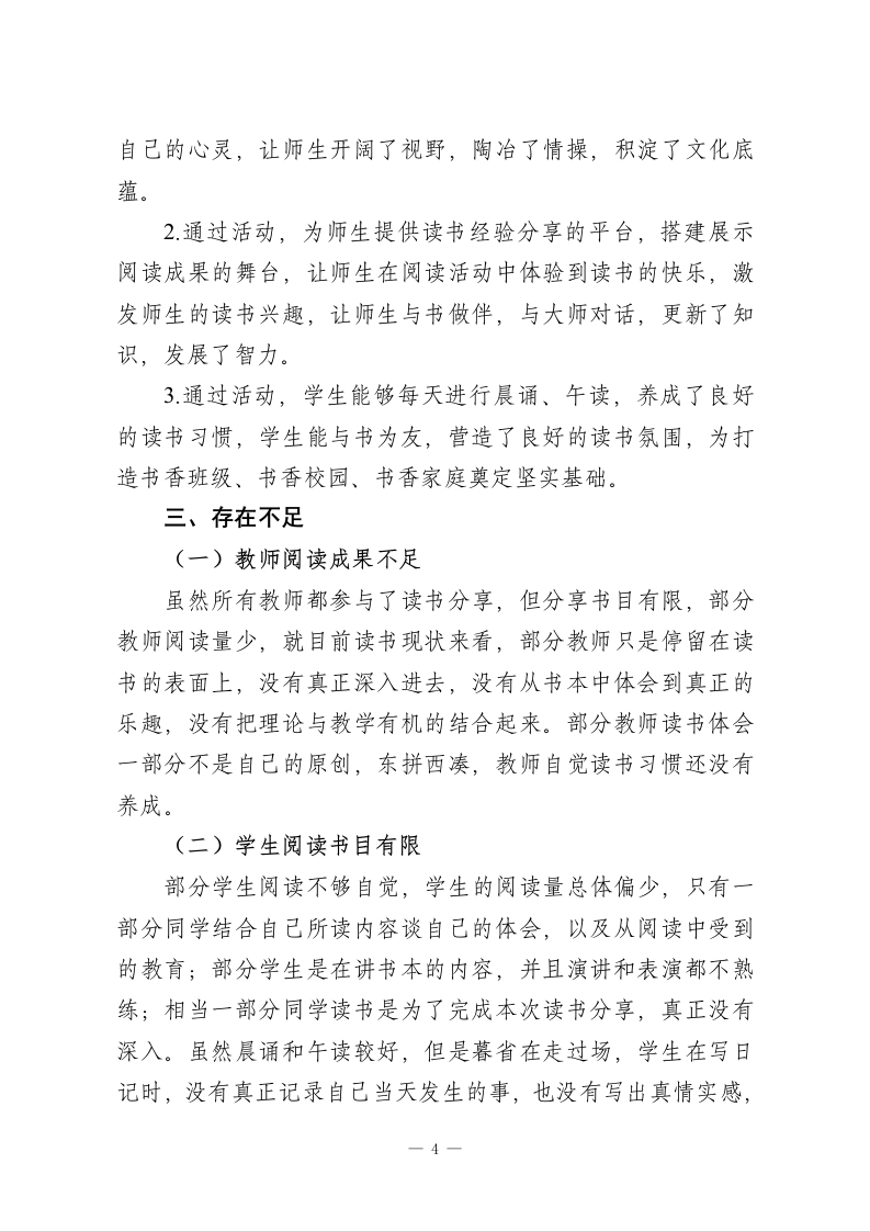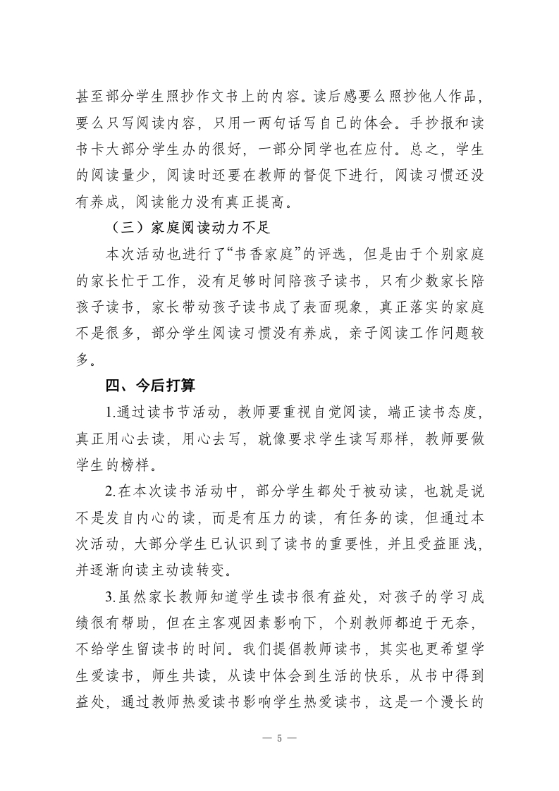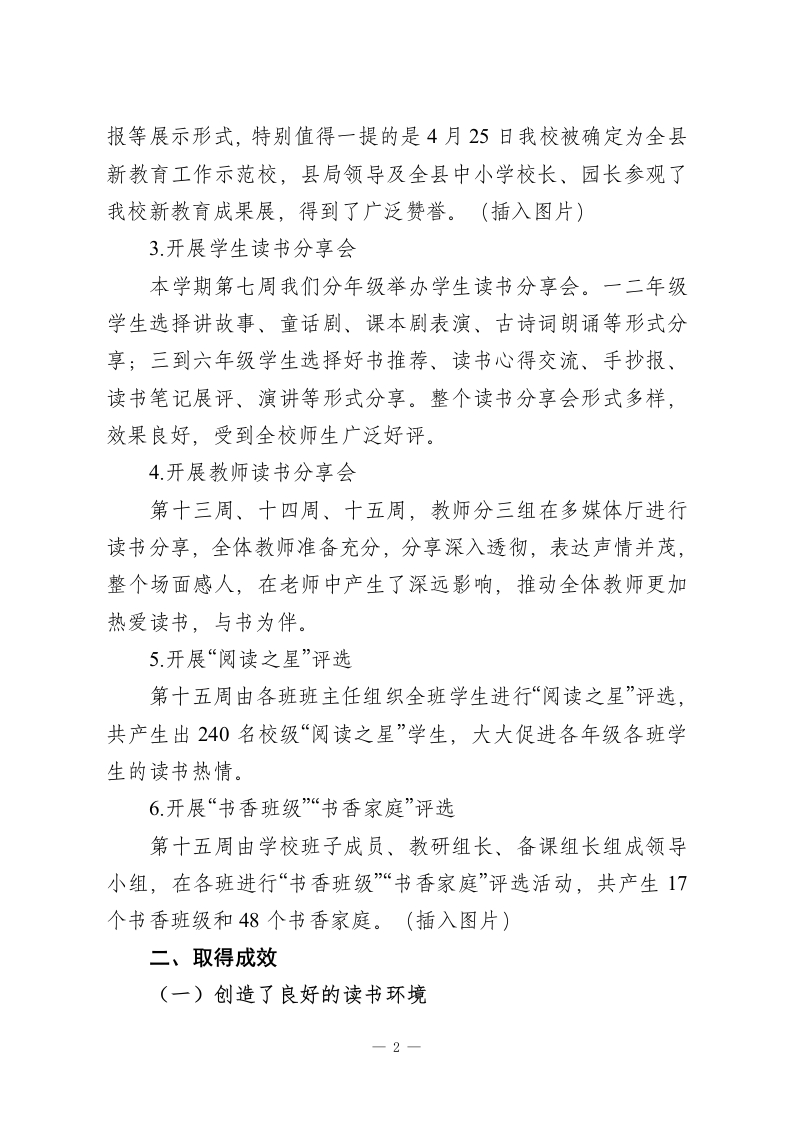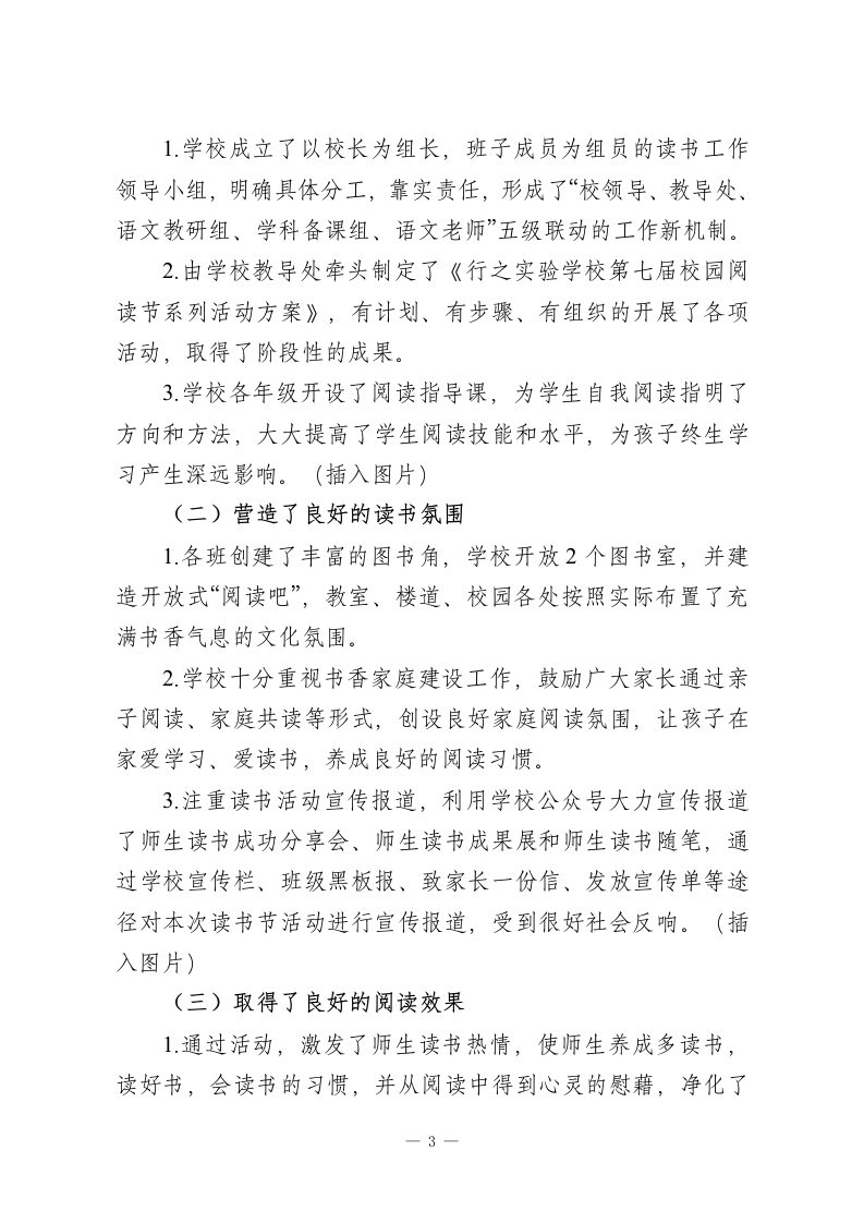 2026年中小学“书香校园”读书节活动总结或报道:许一程漂流撷一缕书香花开正逢春,世外漫书香。为了深入实施素质教育,落实“双减”政策,创建书香校园,营造浓郁的读书氛围,行之实验小学开展了第七届校园读书节活动,旨在激发学生读书的兴趣与热情,养成良好阅读习惯,让书籍为学生打开知识之窗,开启思想之门,以丰富知识,开阔视野,活跃思维。(插入图片)》一、活动开展本次活动主题为“最美人间四‘阅'天春风漫卷书香来”,全体师生参加,活动共分六部分。1.召开启动会2026年X月X日,星期一举办“行之实验学校第七届校园阅读节”系列活动启动会。向全体师生安排布置具体读书内容;要求各班丰富班级图书角,同时各班从学校图书室借阅100-200本图书,并倡导每位学生自愿捐书2-3本,开辟“图书伴我行”新天地;学校要求每位教师必读书目3本,各年级学生必读书目至少5本;学生坚持课前3分钟演讲,培养孩子的卓越口才;师生坚持写好教育随笔,进一步激活师生的写作热情。(插入图片)2.举办年级读书成果展各年级根据学生阅读书目,利用晨诵、午读、暮省、阅读课以及课后服务等时间,让学生进行阅读并制作读书卡、手抄1