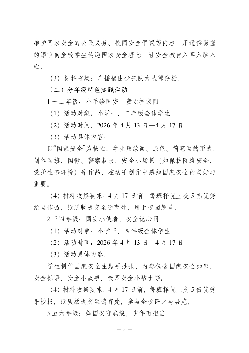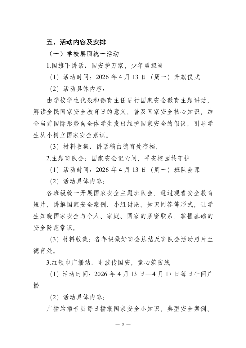 2026年中小学全民国家安全教育日活动方案:国安护万家,少年筑防线一、活动背景2026年4月15日是我国第11个全民国家安全教育日,当前国际形势复杂严峻,国家安全涵盖政治、国土、军事、经济、文化、网络、生态、资源、核安全等多个领域,与每个人的生活息息相关。为深入贯彻落实总体国家安全观,增强全校学生的国家安全意识,树立“国家安全,人人有责”的理念,筑牢校园安全思想防线,引导青少年自觉维护国家安全,结合我校1-9年级德育工作实际,特开展本次国家安全教育日主题系列活动。二、活动目的1.让学生全面了解国家安全的内涵、重要意义及相关法律法规,树立正确的总体国家安全观。2.结合不同学段学生年龄特点,普及基础国家安全知识,提升学生安全防范意识与自我保护能力。3培养学生的家国情怀与责任担当,让学生明白维护国家安全是每个公民的法定义务。4营造“人人学国安、人人守国安、人人护国安”的校园氛围,构建平安、和谐、稳定的校园环境。三、活动对象全校1-9年级全体学生四、活动时间2026年4月13日一4月17日一1