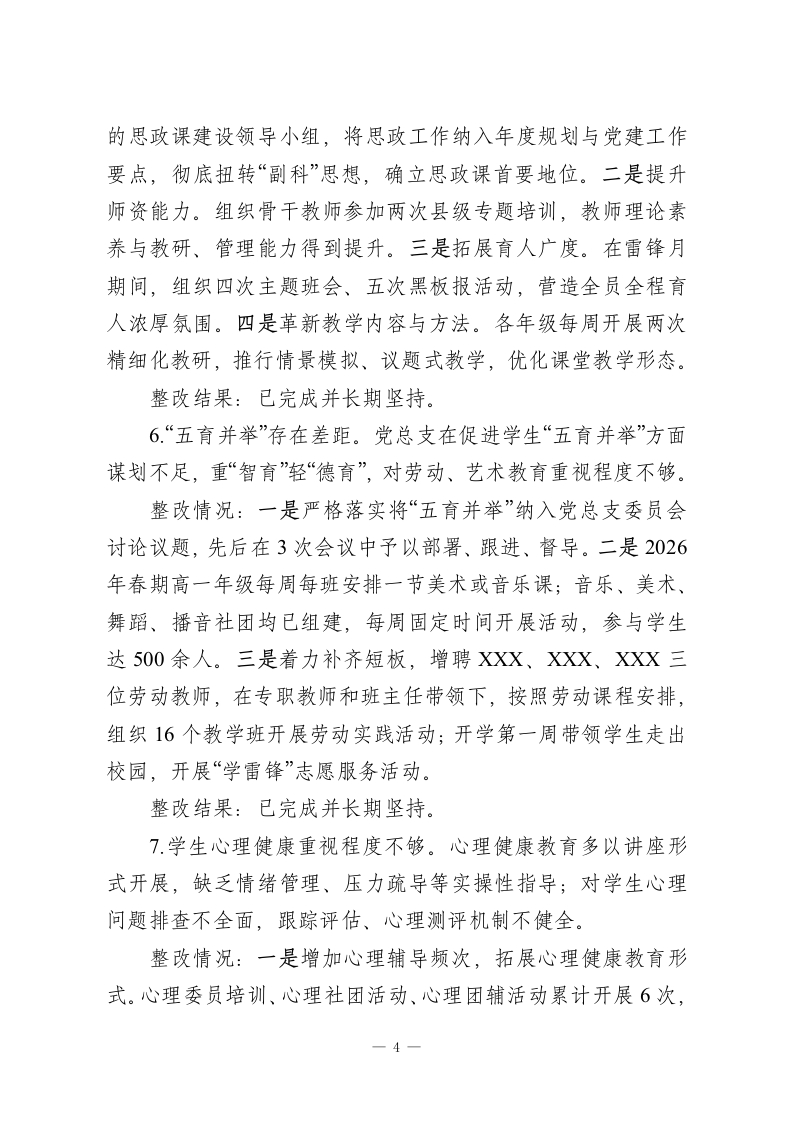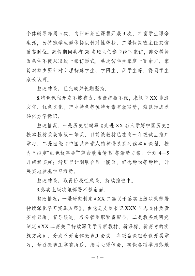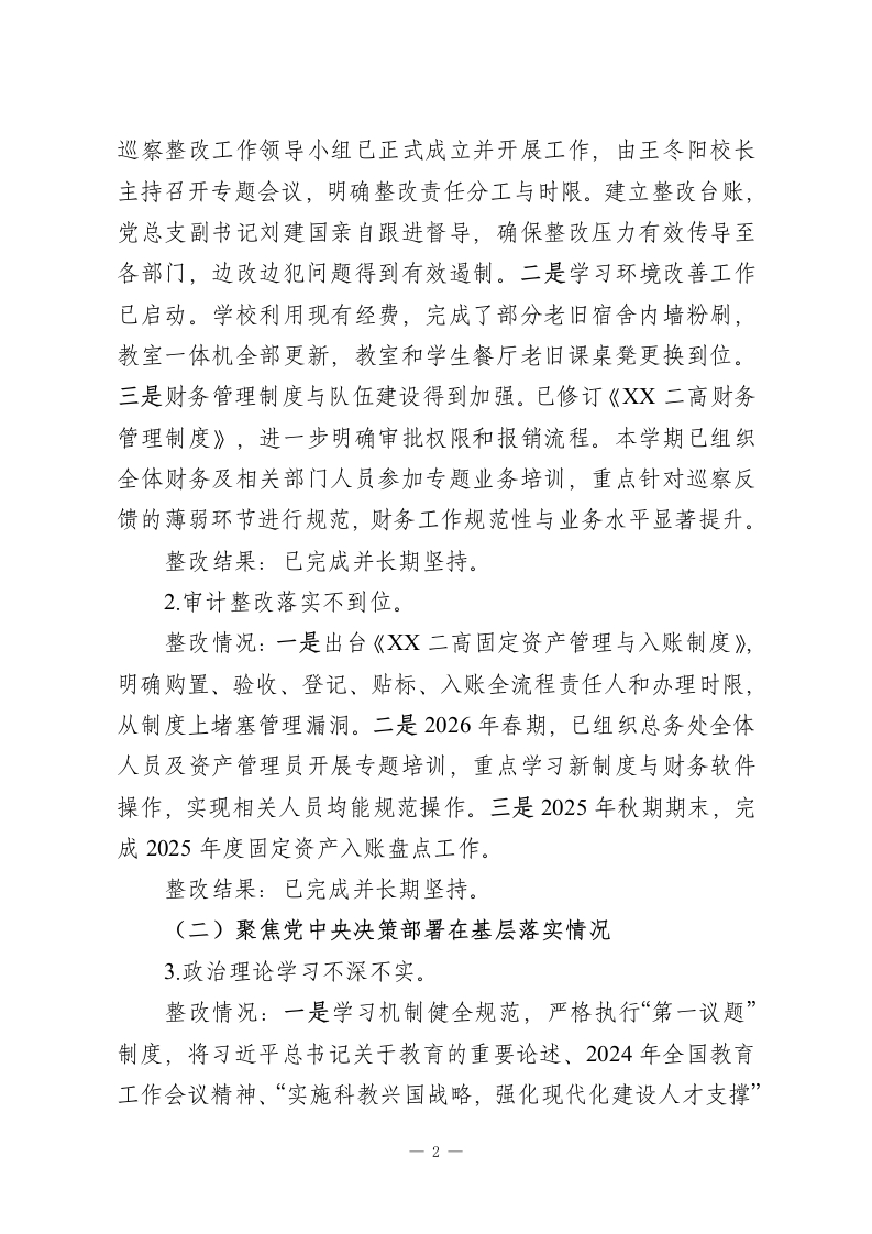XX县XX高级中学总支部委员会关于县委巡察整改进展情况的报告根据县委统一部署,2025年X月XX日至2025年XX月XX日,县委第十巡察组对县二高党总支进行了为期两个月的巡察“回头看”,并于2025年XX月XX日向县二高党总支反馈了巡察意见。按照巡察工作有关要求,现将巡察整改进展情况报告如下。一、党总支及主要负责同志组织落实整改情况成立由校长任组长、班子成员任副组长的巡察整改工作领导小组,确保整改工作部署到位、责任到人、落实到位。自收到县委第十巡察组巡察反馈意见以来,学校党总支、校委会召开巡察整改专题会议5次,专题民主生活会1次,专题研究和部署整改落实工作,坚决做到紧盯问题、步步为营、务求实效。党总支研究出台了《中共XX县XX高级中学总支部委员会关于县委第十巡察组巡察“回头看”反馈意见的整改落实方案》,制定了整改工作台账,认真对照反馈的4个方面问题,细化整改措施,逐一明确责任领导、责任部门、整改措施和整改时限,确保各整改事项有序推进、落地落实。二、集中整改进展情况(一)推动问题整改落实情况1巡察整改落实不到位。党总支对上轮巡察反馈问题整改主体责任压力传导不够,存在边改边犯情况。整改情况:一是主体责任得到压实,整改机制初步形成。1