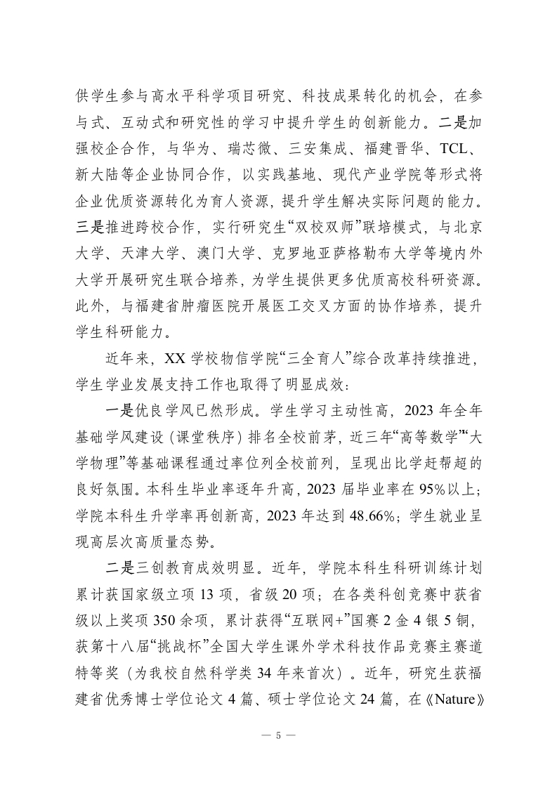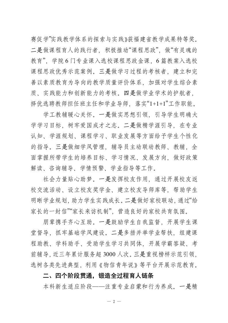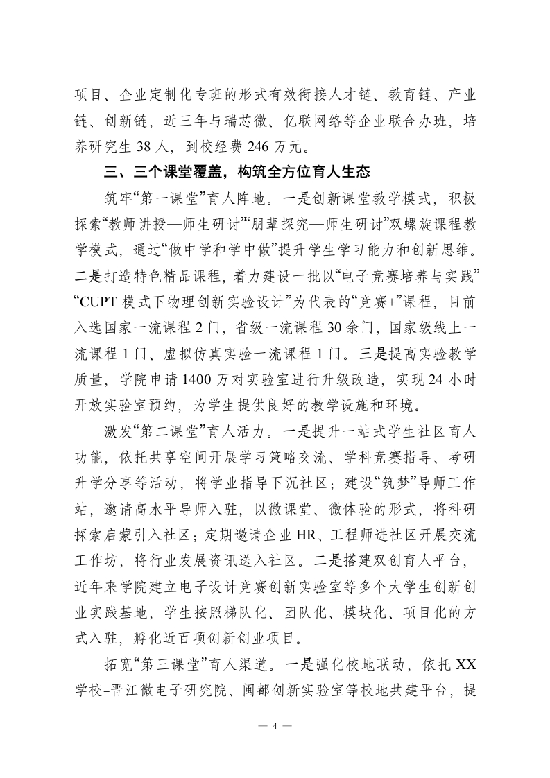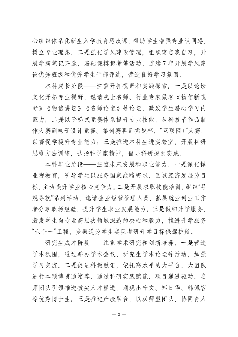 XX学校:“三全育人”构建高质量学生学业发展支持体系作为教育部首批“三全育人”综合改革试点学院和XX学校“新一代信息技术”学科群培育牵头单位,XX学校主动聚焦服务国家重大战略需求,坚持立德树人根本任务,以培养“深情怀、厚基础、强实践、重创新”的新一代信息技术人才为目标,秉承“以生为本、以学为本、提高能力、提升动能”的理念,着力构建“五支队伍协同、四个阶段贯通、三个课堂覆盖”的高质量学业发展支持体系,为发展新质生产力提供坚实的人才基础。一、五支队伍协同,凝聚全员育人合力院系领导匠心设计。一是重视人才培育顶层设计,持续优化人才培养方案,探索创新人才培养路径,2023年学院根据国家“101计划”组织申报的“微电子领域拔尖创新人才培养模式的探索与实践”获批省教育厅重大项目立项。二是加强师德师风建设,连续多年开展最佳一节课、“四有”好老师、优秀班主任评选。三是完善工作机制,成立校内首个学生发展中心,定期组织召开教学反馈分析会、学习体验与人才培养座谈会,切实推进学生学业发展支持工作。专任教师用心引领。一是做教育教学的主导者,鼓励教师以课程改革小切口完善解决人才培养质量大问题,主动推进教育教学改革,学院教师作为主要成员申报的《科产教融合、项目制牵引的工程实践教育体系改革》获2022年国家教学成果二等奖,程树英教授牵头负责的《构建电子类专业“知能相长、研1