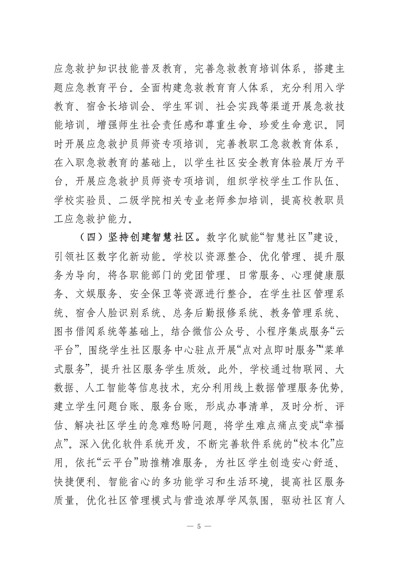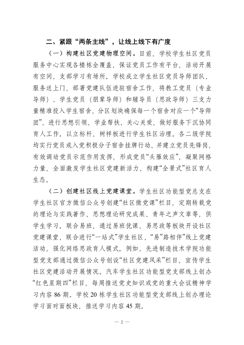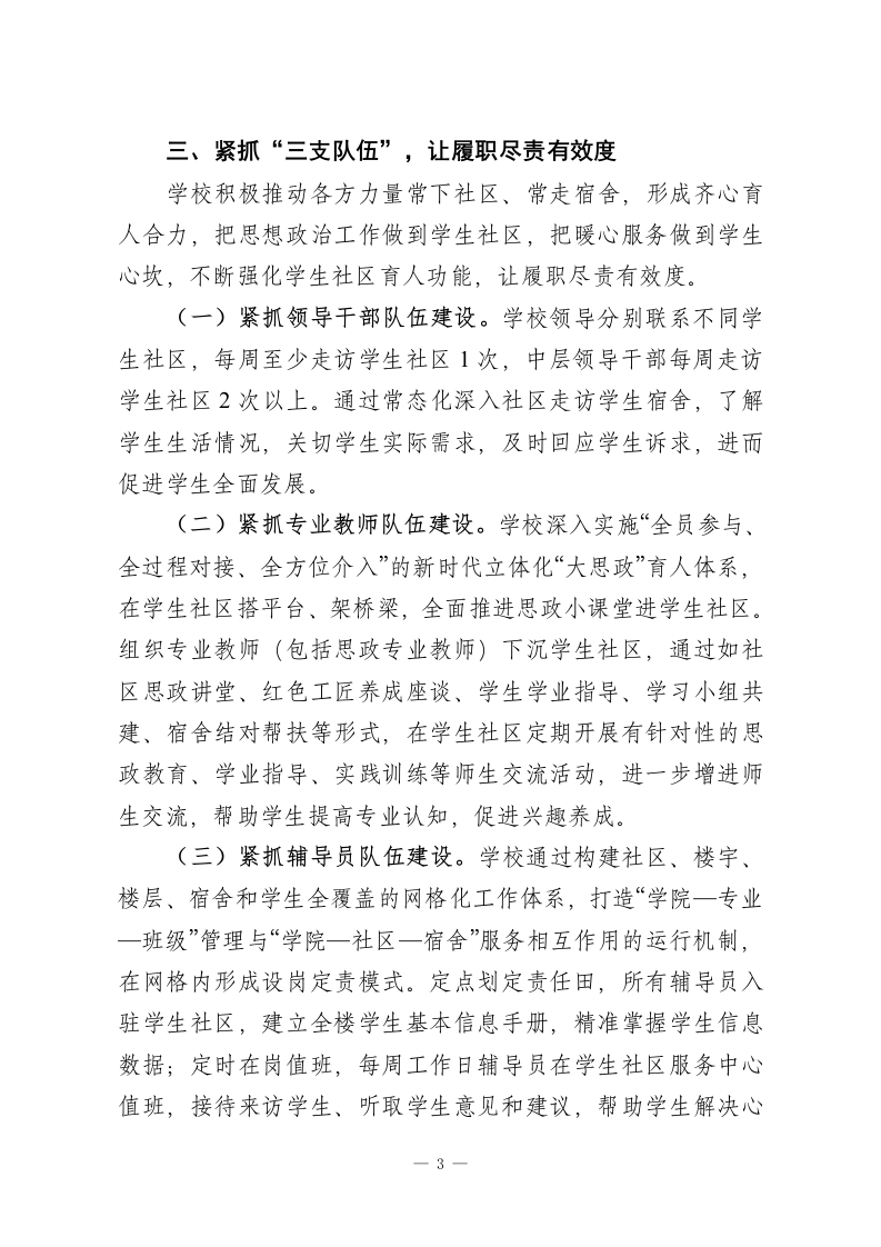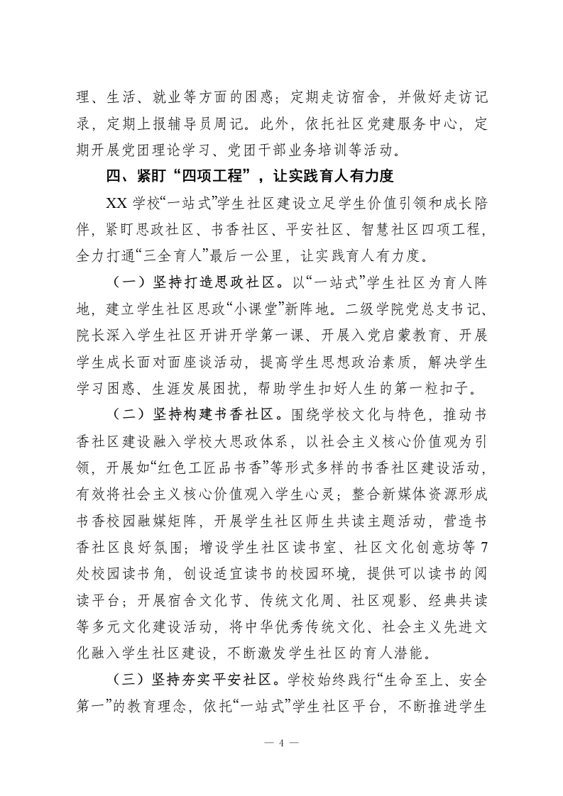 XX学校:以“四紧四度”构建学生社区“1234”育人新模式XX学校认真学习贯彻习近平总书记关于教育的重要论述,针对着力构建落实立德树人根本任务新生态新格局,以紧扣“一个核心”,紧跟“两条主线”,紧抓“三支队伍”,紧盯“四项工程”,构建学生社区“1234”育人新模式,为培养堪当民族复兴重任的时代新人提供强大支撑。一、紧扣“一个核心”,让党建引领有高度党的十八大以来,以习近平同志为核心的党中央不断进行实践探索和理论思考,强调要“坚持党建工作和业务工作一起谋划、一起部署、一起落实、一起检查”。据此,XX学校牢固树立围绕中心抓党建、抓好党建促业务的理念,不断深化“一站式”学生社区综合管理模式建设,由学校党委统筹、学生工作部牵头,制定了《XX学校“一站式”学生社区建设工作方案》《XX学校学生社区建立功能型党组织实施细则》《XX学校“一站式”学生社区功能型党组织设置方案》三个制度,为学生社区党建工作指明了方向。同时,学校聚力构建“纵向到底、横向到边”学生社区党建工作矩阵,建立“一站式”学生社区功能型党总支1个,功能型党支部12个,功能型党小组73个,形成党总支负责、党支部指导、党小组实施的纵向工作布局;编织党员干部队伍、教师队伍、辅导员队伍、学生自治队伍的横向服务网格,不断实现社区治理网格化,社区服务精细化,学生管理清单化,让党建引领有高度。一1