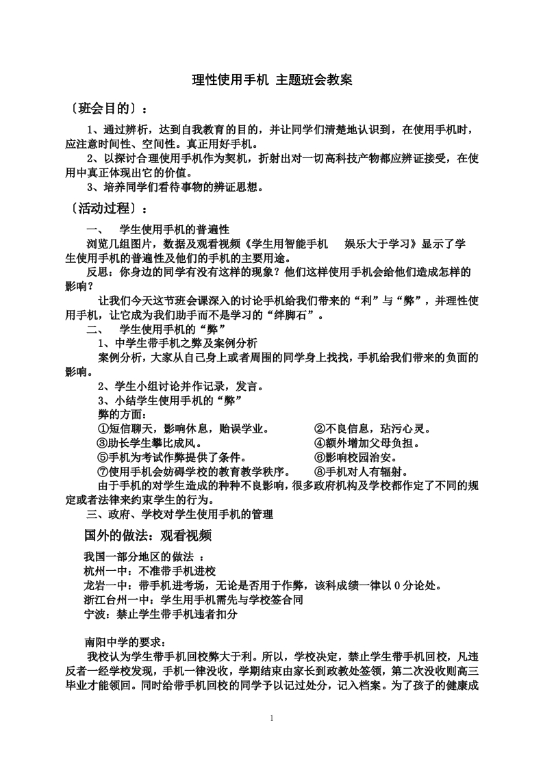 理性使用手机主题班会教案〔班会目的):1、通过辨析,达到自我教育的目的,并让同学们清楚地认识到,在使用手机时,应注意时间性、空间性。真正用好手机。2、以探讨合理使用手机作为契机,折射出对一切高科技产物都应辨证接受,在使用中真正体现出它的价值。3、培养同学们看待事物的辨证思想。〔活动过程):一、学生使用手机的普遍性浏览几组图片,数据及观看视频《学生用智能手机娱乐大于学习》显示了学生使用手机的普遍性及他们的手机的主要用途。反思:你身边的同学有没有这样的现象?他们这样使用手机会给他们造成怎样的影响?让我们今天这节班会课深入的讨论手机给我们带来的“利”与“弊”,并理性使用手机,让它成为我们助手而不是学习的“绊脚石”。二、学生使用手机的“弊”1、中学生带手机之弊及案例分析案例分析,大家从自己身上或者周围的同学身上找找,手机给我们带来的负面的影响。2、学生小组讨论并作记录,发言。3、小结学生使用手机的“弊”弊的方面:①短信聊天,影响休息,贻误学业。②不良信息,玷污心灵。③助长学生攀比成风。④额外增加父母负担。⑤手机为考试作弊提供了条件。⑥影响校园治安。⑦使用手机会妨碍学校的教育教学秩序。⑧手机对人有辐射。由于手机的对学生造成的种种不良影响,很多政府机构及学校都作定了不同的规定或者法律来约束学生的行为。三、政府、学校对学生使用手机的管理国外的做法:观看视频我国一部分地区的做法:杭州一中:不准带手机进校龙岩一中:带手机进考场,无论是否用于作弊,该科成绩一律以0分论处。浙江台州一中:学生用手机需先与学校签合同宁波:禁止学生带手机违者扣分南阳中学的要求:我校认为学生带手机回校弊大于利。所以,学校决定,禁止学生带手机回校,凡违反者一经学校发现,手机一律没收,学期结束由家长到政教处签领,第二次没收则高三毕业才能领回。同时给带手机回校的同学予以记过处分,记入档案。为了孩子的健康成