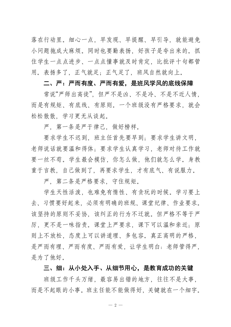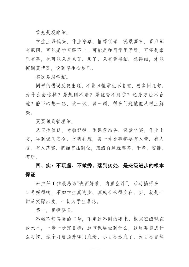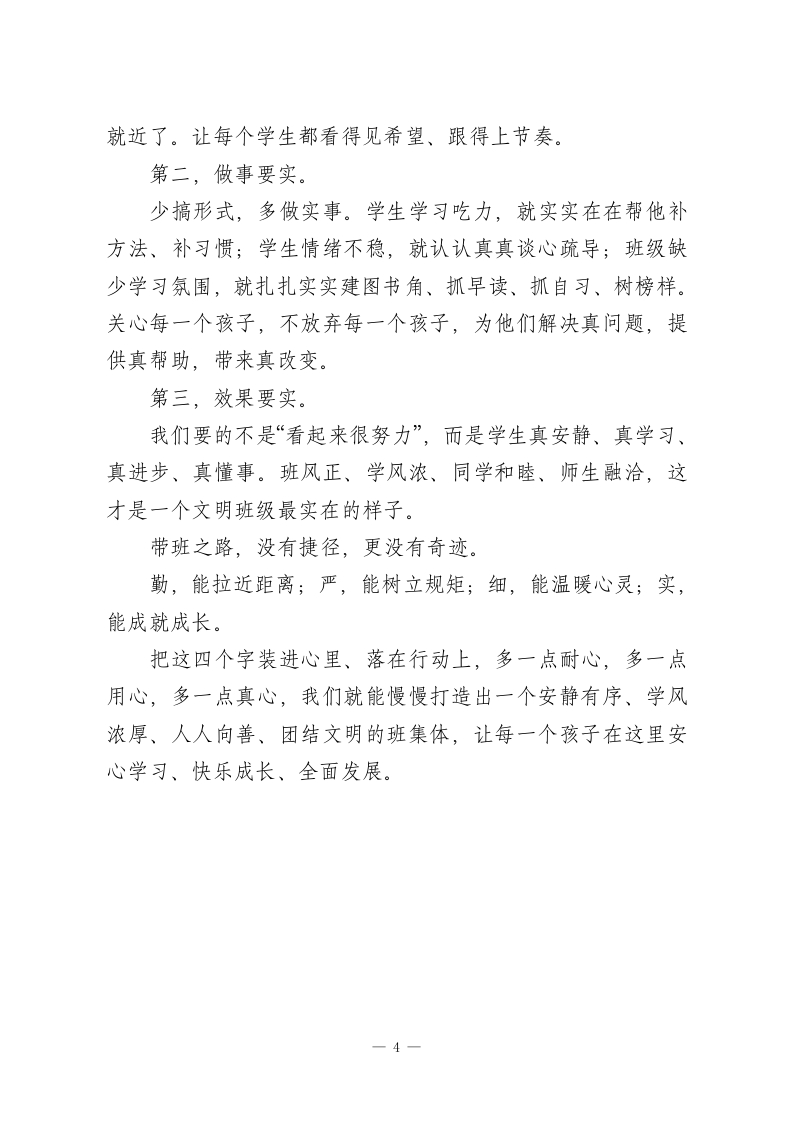 班主任班级管理:以“勤、严、细、实”四字诀,打造静心向学、和谐文明的班集体作为班主任,我们每天面对的不是冰冷的制度,而是一个个鲜活、敏感、正在成长的孩子。想让班级真正安静有序、学风浓厚、人人向善,不靠吼、不靠压,而靠一套稳扎稳打的带班思路。我始终坚信,抓好班级、育好人,最朴素也最管用的,就是勤、严、细、实这四个字。它不是口号,而是每天落在地上、走进心里的具体行动。一、勤:多走多看多交心,是管好班级的第一前提带班最忌“坐在办公室等问题”,再好的班级,也不是靠命令管出来的,是靠勤跑、勤看、勤聊守出来的。勤,首先是勤到班、勤接触。学生在校的大部分状态,只有在现场才能看清楚:早读是否开口、上课是否走神、课间是否吵闹、同学之间是否有小矛盾。班主任多在教室走一走、转一转,很多小问题当场就能化解。更重要的是,多和学生说话、多听学生倾诉,知道他们在想什么、烦什么、在乎什么。教育不是我讲你听,而是先懂再教。只有走近学生、了解学生、信任学生,学生才愿意听你的、跟着你走。勤,还要做到勤观察、勤提醒。学生的情绪变化、学习起伏、交友状态,往往都写在脸上、一1