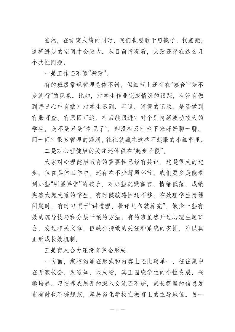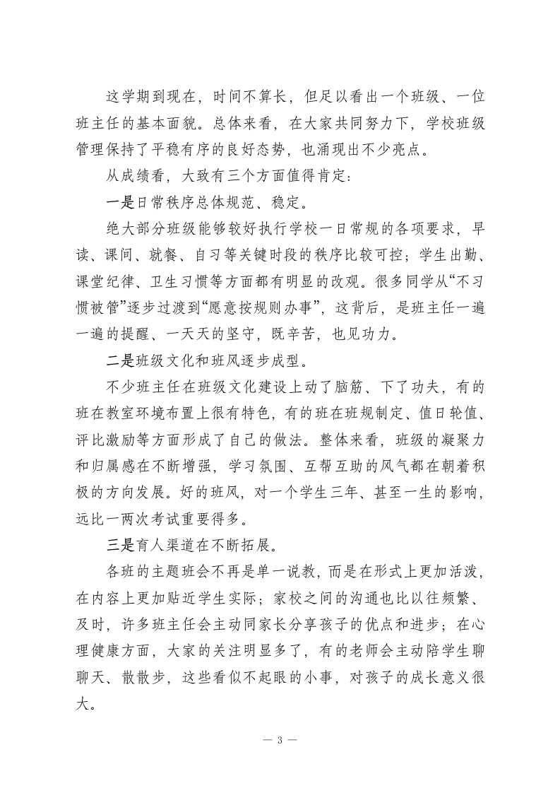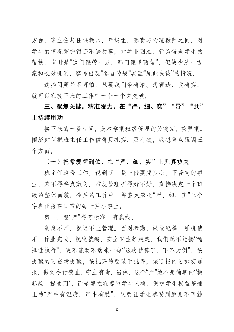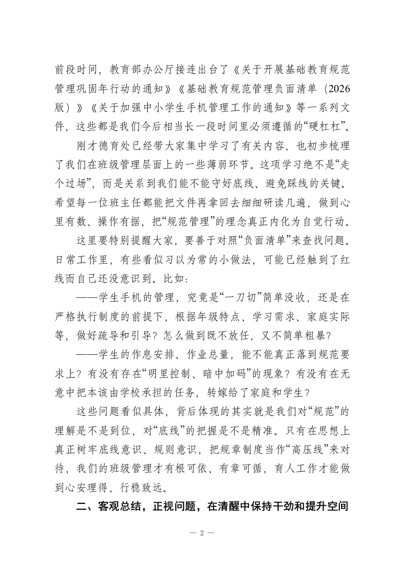 班主任工作会:抓实“细”“活”“诚”三字,跑出班级管理“加速度”!各位班主任老师:下午好!四月的校园,处处都是新绿和生机。今天把大家集中到一起,既是一次例行的班主任工作会,更是我们梳理阶段工作、统一思想认识、明确前进方向的一次交流会。本次会议有三个层面的考虑:一是回顾开学以来班级管理的整体运行情况;二是把目前普遍存在的一些共性问题摆一摆、想一想;三是结合学校本学期工作重点,对下阶段班主任工作再强调、再部署。刚才,德育处、校安办的负责同志已经把近期的重点工作作了很细致、很具体的安排,我完全赞同,也请大家认真落实。在这里,我首先代表学校,向各位在座的班主任老师表示衷心的感谢。这一个多月,大家真的是既辛苦又不容易,很多工作都是默默付出、难以量化,但学校都看在眼里、记在心里,谢谢大家的坚守和担当。下面,结合学校整体工作思路和刚才几位同志的发言,我想再从三个方面谈一些意见,与各位班主任交流、共勉」一、提高认识,把握政策,在思想上真正筑牢“规范管理”的根基要把班级带好,首先必须方向准、站位高。现在国家对基础教育领域的规范化要求可以说是越来越具体、越来越严格。1
