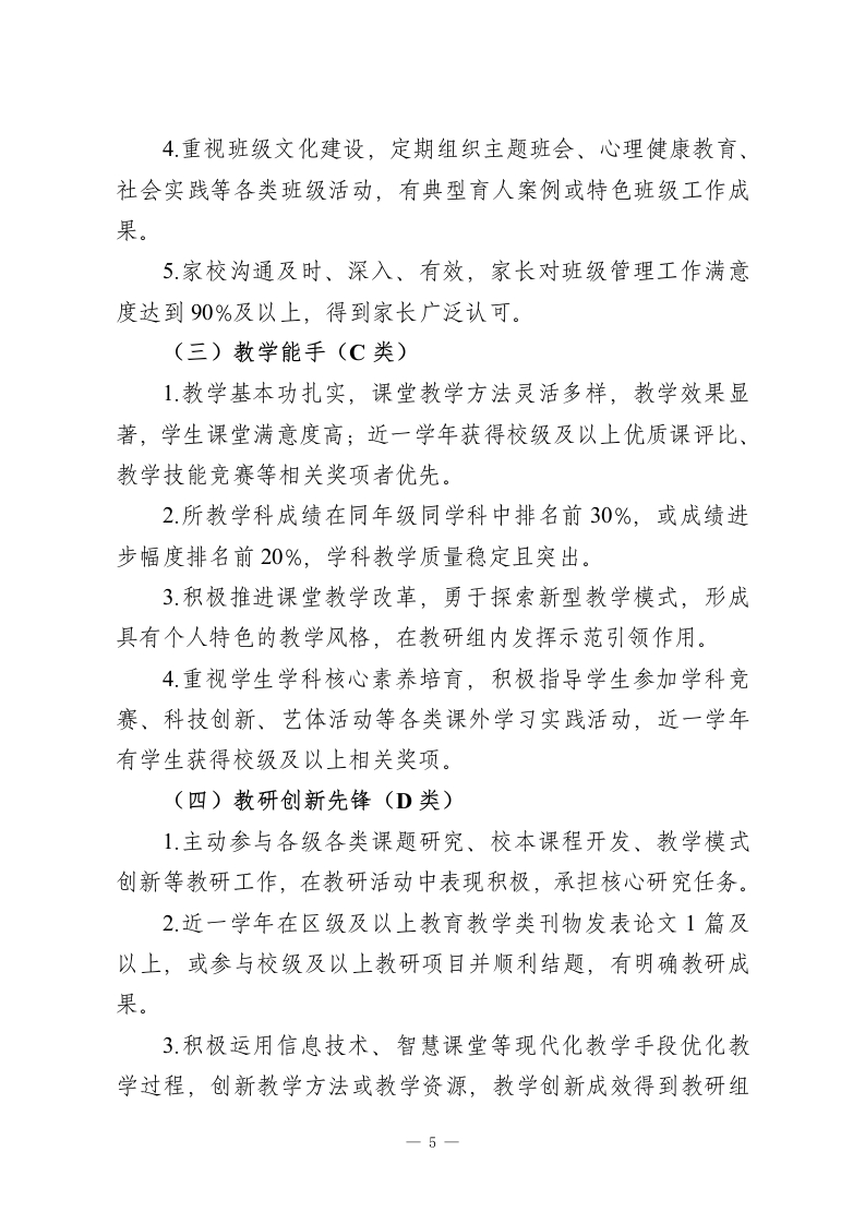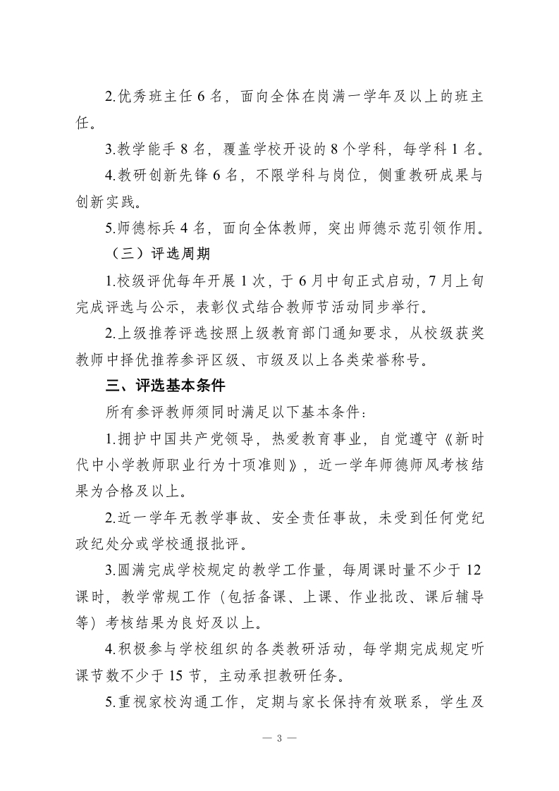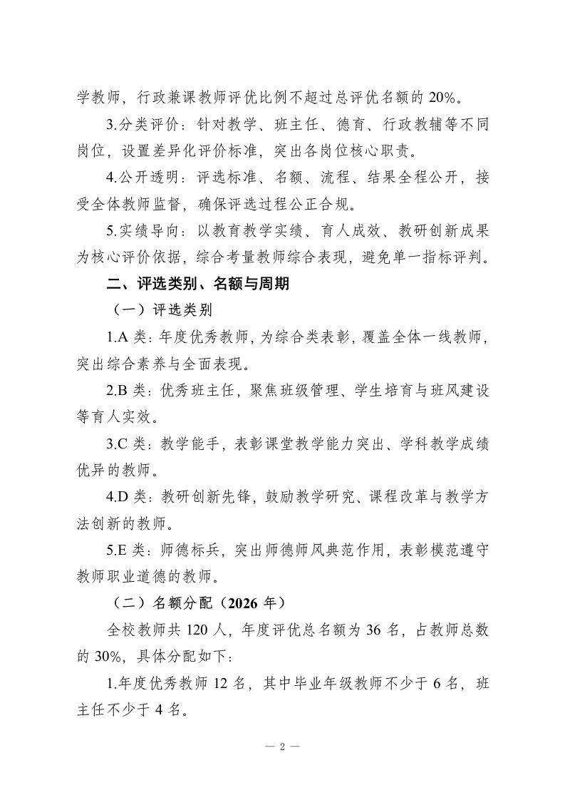 初级中学2026年教师评优评先实施方案(修订版)一、总则(一)制定目的为深入贯彻党的教育方针,落实立德树人根本任务,深化新时代教师队伍建设改革,破除“唯分数、唯升学、唯论文、唯帽子”倾向,建立科学、公平、公正的教师评价激励机制,激发教师队伍活力,全面提升教育教学质量,结合本校实际,特修订本方案。(二)指导思想以习近平新时代中国特色社会主义思想为指导,坚持师德为先、实绩为重、分类评价、注重一线、公开透明原则,突出育人核心,兼顾过程与结果,促进教师专业发展与学校高质量发展。(三)适用范围本方案适用于本校全体在职在岗教师(含在编教师、聘用制教师、交流轮岗教师),试用期教师参与考核评价,不参与评优评先。(四)基本原则1师德一票否决:师德师风为首要标准,近一学年有师德失范记录、受党纪政纪处分、参与有偿补课等违规行为的,取消当年评优资格。2.向一线倾斜:优先考虑毕业年级教师、班主任及一线教一1