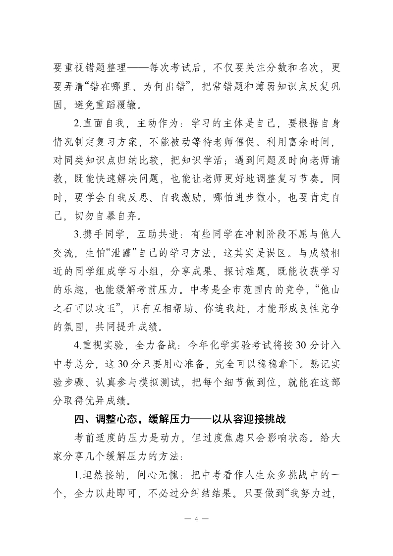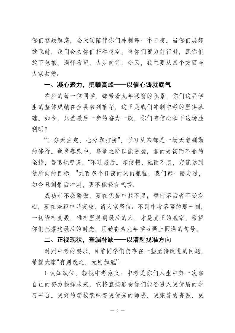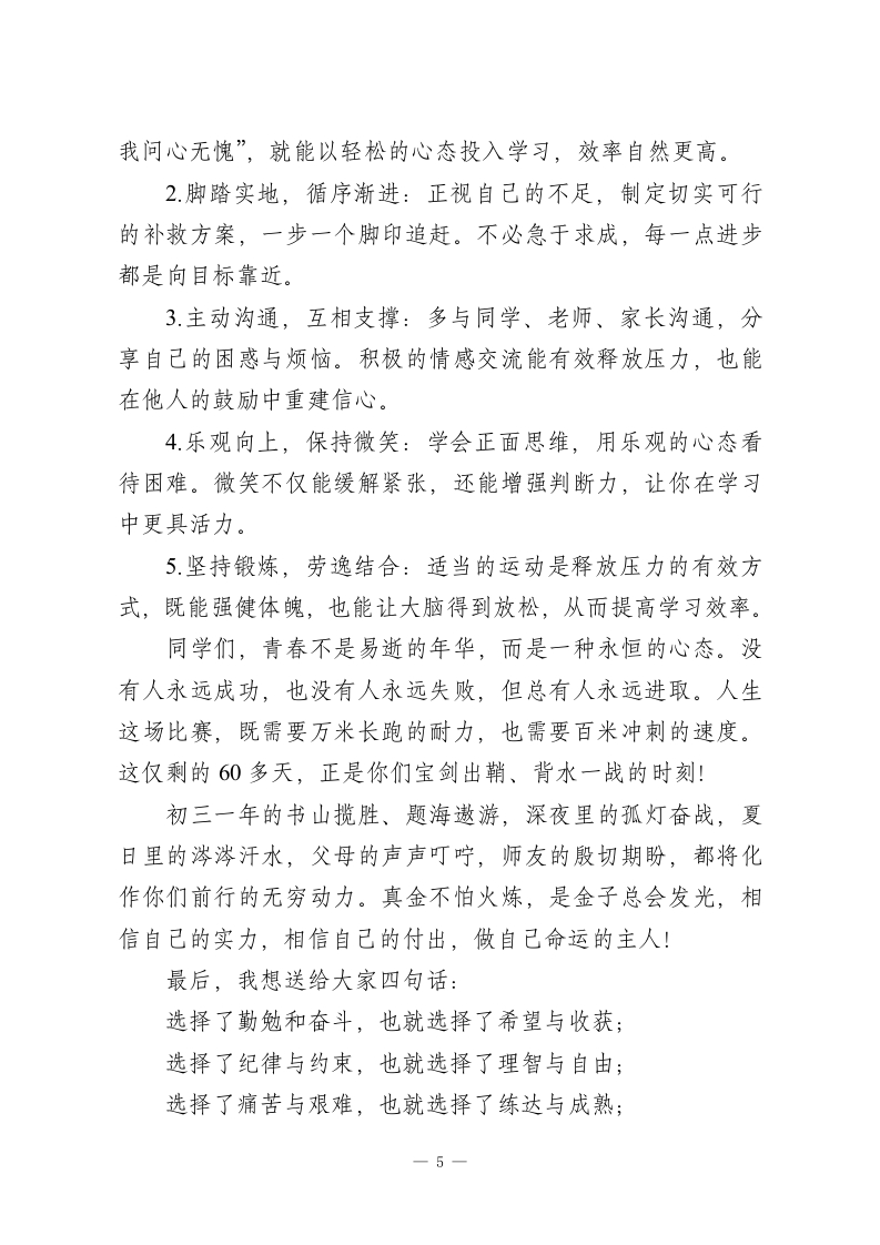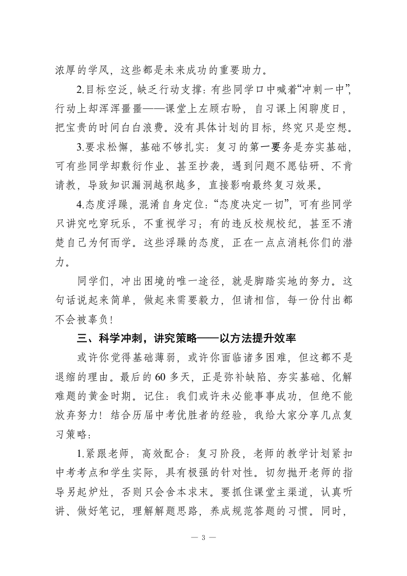 初三中考冲刺动员校长讲话:以笔为剑,不负韶华各位老师、同学们:大家下午好!今天,我们初三全体师生齐聚一堂,围绕毕业会考冲刺与年级管理事宜,共话前行之路。古人说“岁月不居,时节如流”,仿佛昨日才踏入初三的课堂,如今便已站在中考的起跑线上。此刻的你们,或许正思索着如何扎实走完最后一程,或许正忐忑于即将到来的挑战。但我想问问大家:你们真正做好迎接这场青春战役的准备了吗?距离中考越来越近,你们的心中是怎样的滋味?是对未来的憧憬,是临场的紧张,是破釜沉舟的兴奋,还是百般情愫交织?我知道,有的同学因成绩暂时落后而迷茫,有的同学因时光紧迫而焦虑,有的同学因找不到方向而徘徊,也有的同学因即将触碰理想而满心滚烫。人生漫漫,关键处往往只有几步,而中考,正是你们青春路上最关键的十字路口。它不会决定人生的全部,却能为你们打开更广阔的天地。人生不过数十载,唯有活得热烈、活得坚定、活得有价值,才算不负韶华。李宁的广告词说得好:“一切皆有可能”。在这仅剩的60多天里,我们该如何用拼搏浇灌理想,用坚持书写未来?首先我要告诉大家:在你们出征的路上,全体老师将是你们最坚实的后盾。我们会一如既往地兢兢业业,孜孜不倦地为-1