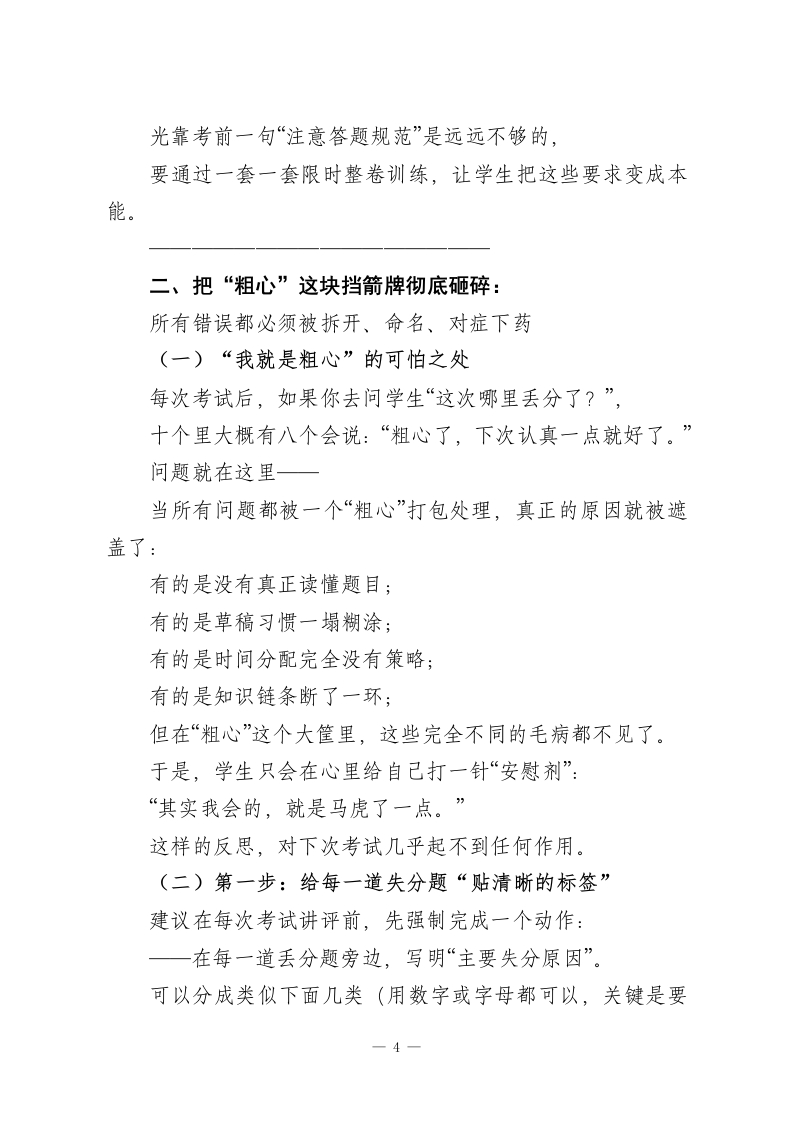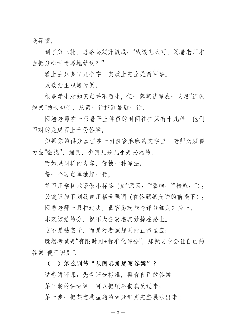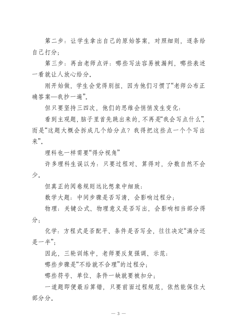 高三三轮冲刺阶段考试得分能力提升工作思路每年一到三轮复习,很多学校和老师都会做同一件事:再翻一遍书、再梳理一遍知识点、再查一遍漏洞。这件事本身没有错,但如果整整一个第三轮都只干这一件事,那就等于浪费了高三最后最宝贵的一段时间。现实是:到了四月份,绝大多数学生的知识框架已经定型了。指望用最后五十天把前面两三年落下的大洞都补齐,既不现实,也不符合学习规律。但问题紧接着就来了一一既然知识短时间内很难有质的飞跃,那分数还有没有提升空间?有,而且不小。这个空间,不主要在“再多背多少点东西”,而在“你能从试卷上拿回多少本来就属于你的分”。换句话说:在第三轮,最应该下功夫的,其实是“得分能力。得分能力不是玄学,也不是一句“调整好心态”就能概括的,它是一套可以拆开、可以练习的技术。下面的四个部分,就是第三轮里真正值得花时间去打磨的“四项基本功”。一、从“怎么解”到“怎么写才给分”:换一双阅卷老师的眼睛看自己的答案(一)为什么同样会做,有人得满分,有人被扣一半?大部分同学做题时脑子里想的是:“这题我该怎么解?”在一轮、二轮,这样想问题没有问题,因为那时主要任务一1