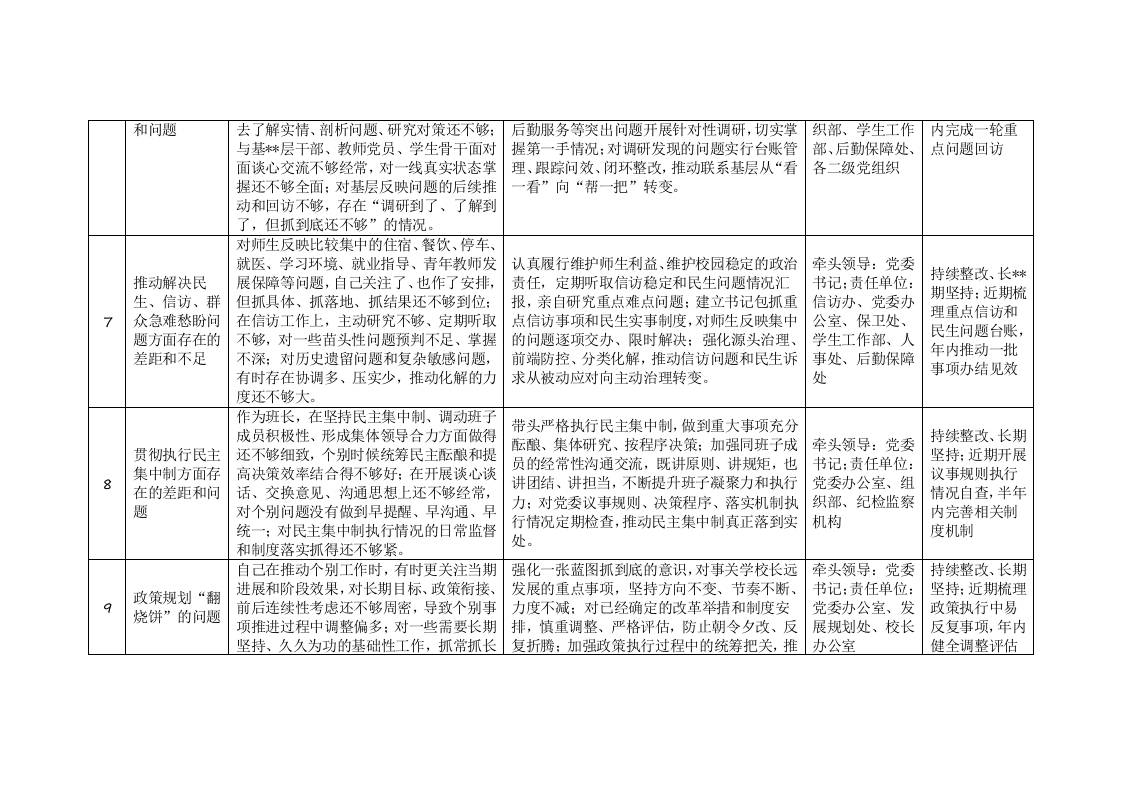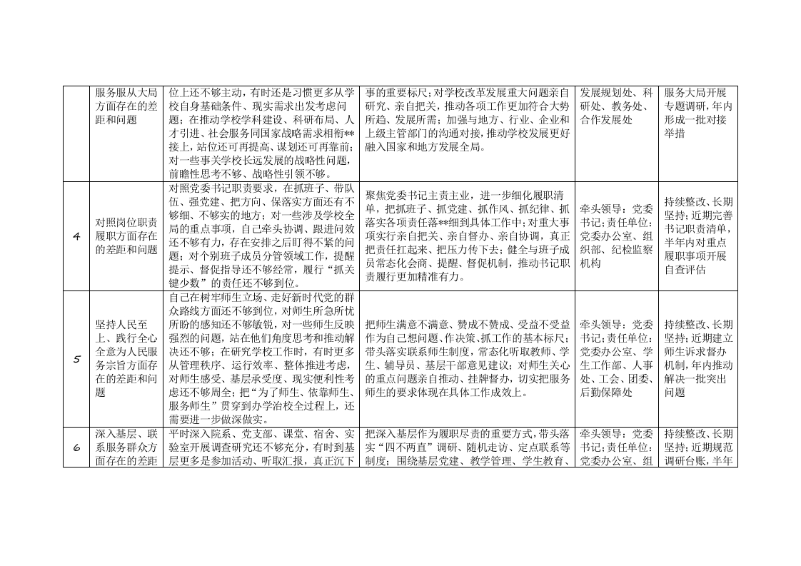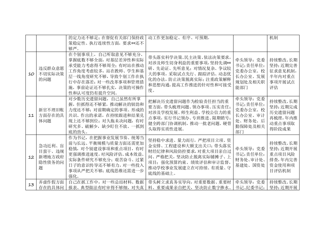 学习教育查摆问题清单(高校个人)填报单位(人):填报时间:序整改责任(含牵进展成效(含整号存在问题具体表现整改措施头领导、责任单位)改时限)作为*,对党中央关于教育、科技、人才工作的部署要求,虽然能够及时传达学把抓党中央重大决策部署落实作为履行第一习,但在结合学校实际深入研究、具体化责任人职责的重要内容,亲自研究重点任务、牵头领导:党委持续整改、长期落实党的大政方针和党中央推动、全过程盯办上做得还不够,存在抓亲自过问关键环节、亲自督促推进落实:围绕书J:责任单位:党委办公室、校坚持:近期建立原则要求多、抓落地细节不够的问题:对学校党的建设、立德树人、意识形态、人才培书记领办事项1重大决策部署些重点任务,部署时强调得比较多,后养等重点领域,逐项建立书记领办事项台账,长办公室、组织方面存在的差部、宣传部、发清单,半年内开距和问题续跟踪问效不够紧,压力传导有时停留在推动任务到岗、责任到人:健全定期调度、专会议层面:在把政治要求转化为办学方题督办、跟踪问效机制,确保党中央重大决策展规划处及各二展一轮专题督级党组织查向、治理要求和发展举措上,思考还不够部署在学校不空转、不虚化、不走样。深、抓手还不够实。对*关于高校党的建设、思想政治工作、教师队伍建设、青年学生成长成才等重要论述,自己在深学细悟、融会贯通上还不把学习贯彻*精神作为政治责任抓紧抓实,带持续整改、长期落实*重要J够,有时更多停留在学习文件、把握提法头学原文、悟原理、谈认识、讲体会、抓转化:牵头领导:党委话和重要Z示坚持:近期完成上,真正联系职责、联系学校、联系问题建立书记主持研究、专题部署、定期盘点机制,书J:责任单位:重点要求对照批S精神方面思考还不够深:对重要指示批示精神,虽确保学习贯彻不是一传了之、一学了之:对照党委办公室、宣存在的差距和梳理,年内开展然作了安排部署,但作为第一责任人抓闭总书记重要要求逐项检视学校落实情况,发现传部、马克思主问题环落实、抓成效检验还不够到位:对贯彻偏差及时校正,推动形成学习领会更深、贯彻义学院、组织部常态化“回头看”落实中的偏差和薄弱环节,提醒纠偏还不落实更实的工作格局。够及时。树立“全国作为党委书记,在从党和国家事业全局审强化从大局看学校、从全局抓办学的意识,把牵头领导:党委持续整改、长期盘棋”思想、视学校工作、从区域发展大局谋划学校定服务国家战略、服务区域发展作为书记谋事抓书记:责任单位:坚持:近期围绕