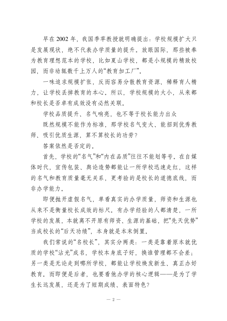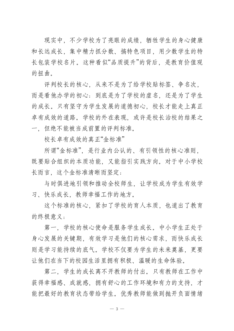 好校长的“金标准”:无关规模与名气,只在师生成长与时代同行提起一位校长是否卓有成效,大多数人第一反应都会看向学校的外在表现:校区越办越多、学生规模不断扩大,或是学校名气越来越响、生源师资愈发优质,便觉得这位校长能力出众、治校有方。可这些看似亮眼的指标,真的能作为评判校长的核心标准吗?其实我们早已陷入了认知误区。真正能定义一位校长价值的,从来不是学校的规模体量、外界的虚名声望,而是与时俱进地引领全校师生,把学校打造成学生有效学习、快乐成长,教师安心从教、幸福工作的地方一一这,才是卓有成效的校长毕生追求的核心目标,也是衡量校长能力的真正“金标准”。学校规模扩大,绝不等于校长治校有成很多人习惯用企业的发展逻辑衡量学校,觉得学校规模越大、校区越多、实现集团化办学,就代表校长管理能力强、办学成效显著。可学校和企业有着本质的区别,这套逻辑放在教育领域,根本行不通。工业时代,社会需要大量标准化的劳动人才,学校承担着批量培养劳动者的功能,一定范围内的规模扩张,确实能反映学校的办学效率。但如今我们早已步入数字智能时代,知识获取的渠道彻底改变,现代教育的核心,是关注每一个学生的个体生命,激发他们的内在成长动力,用教育的温度成就独一无二的生命。一1