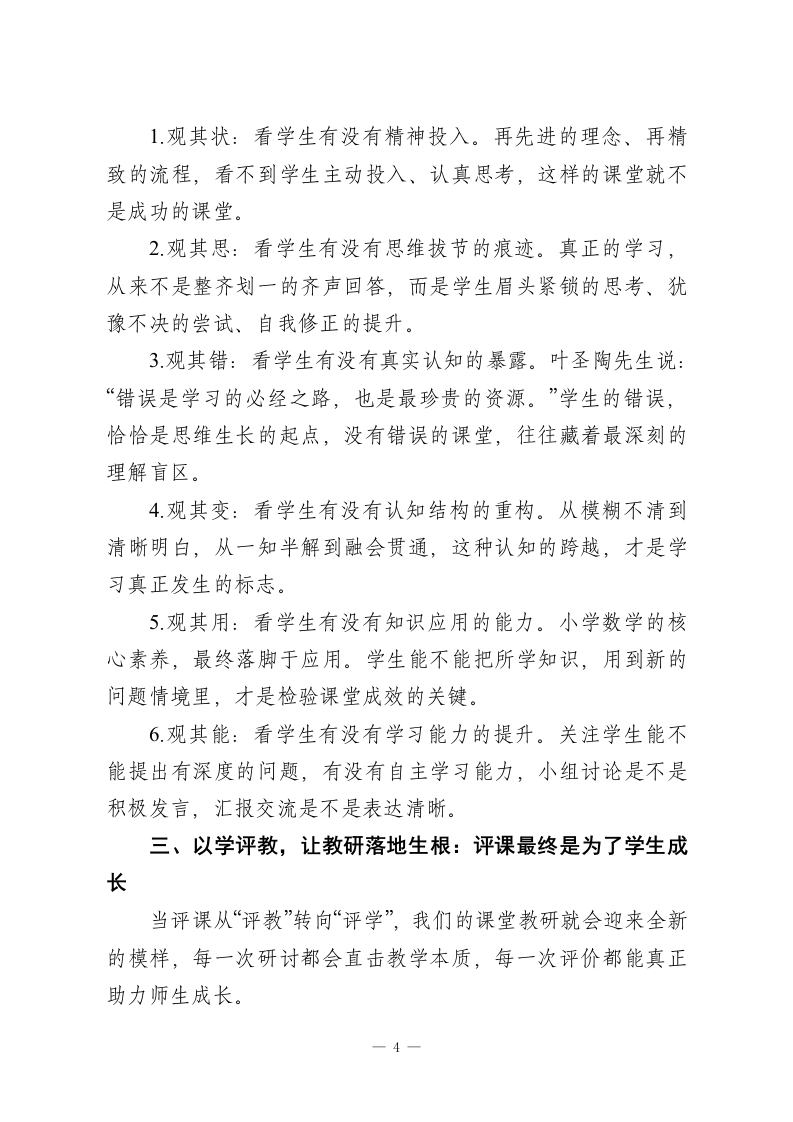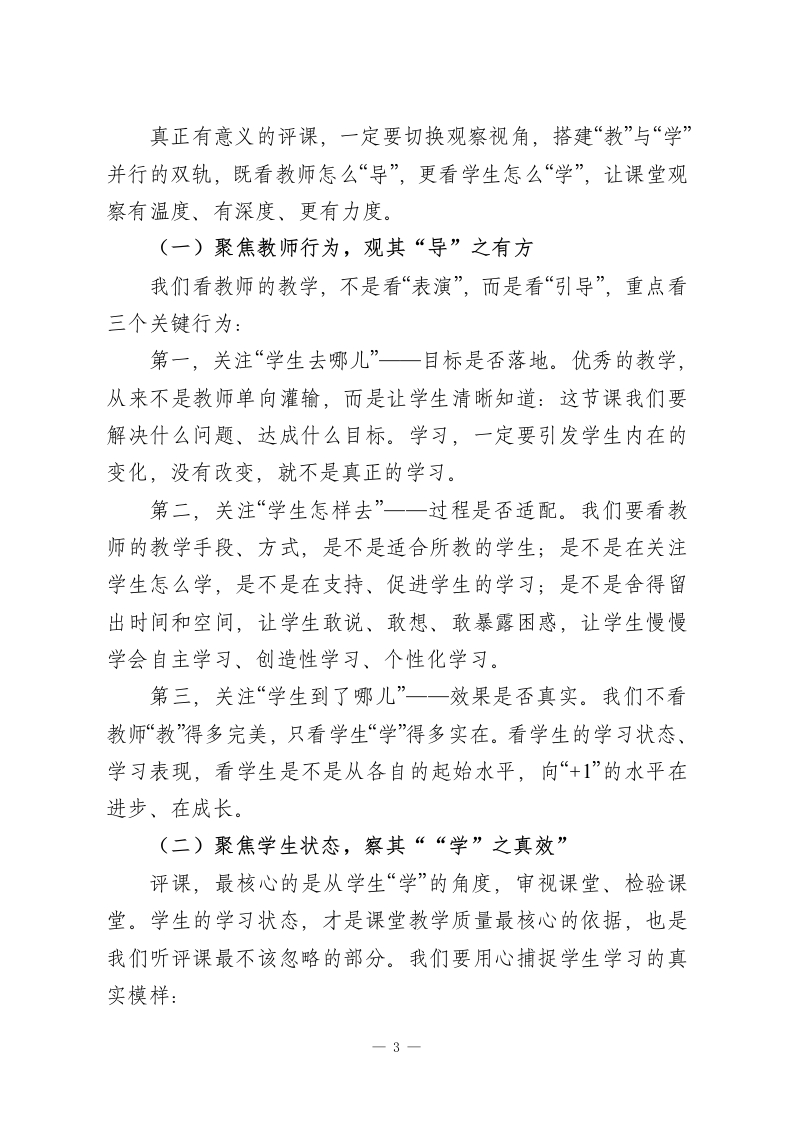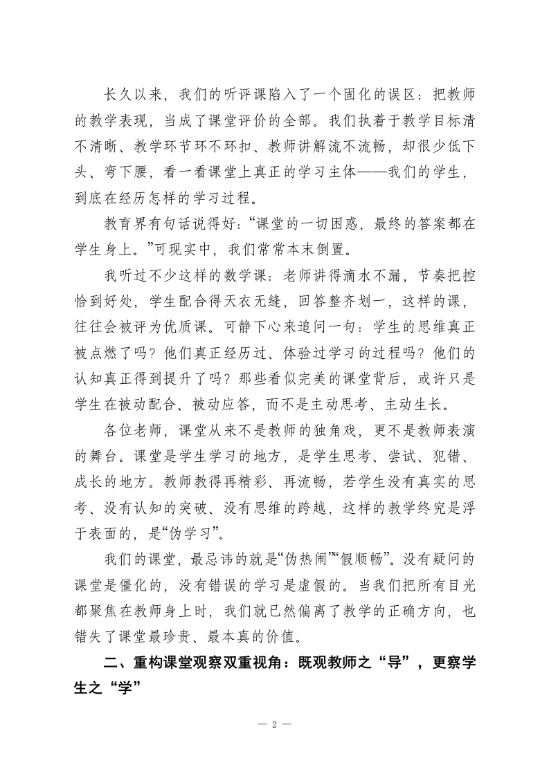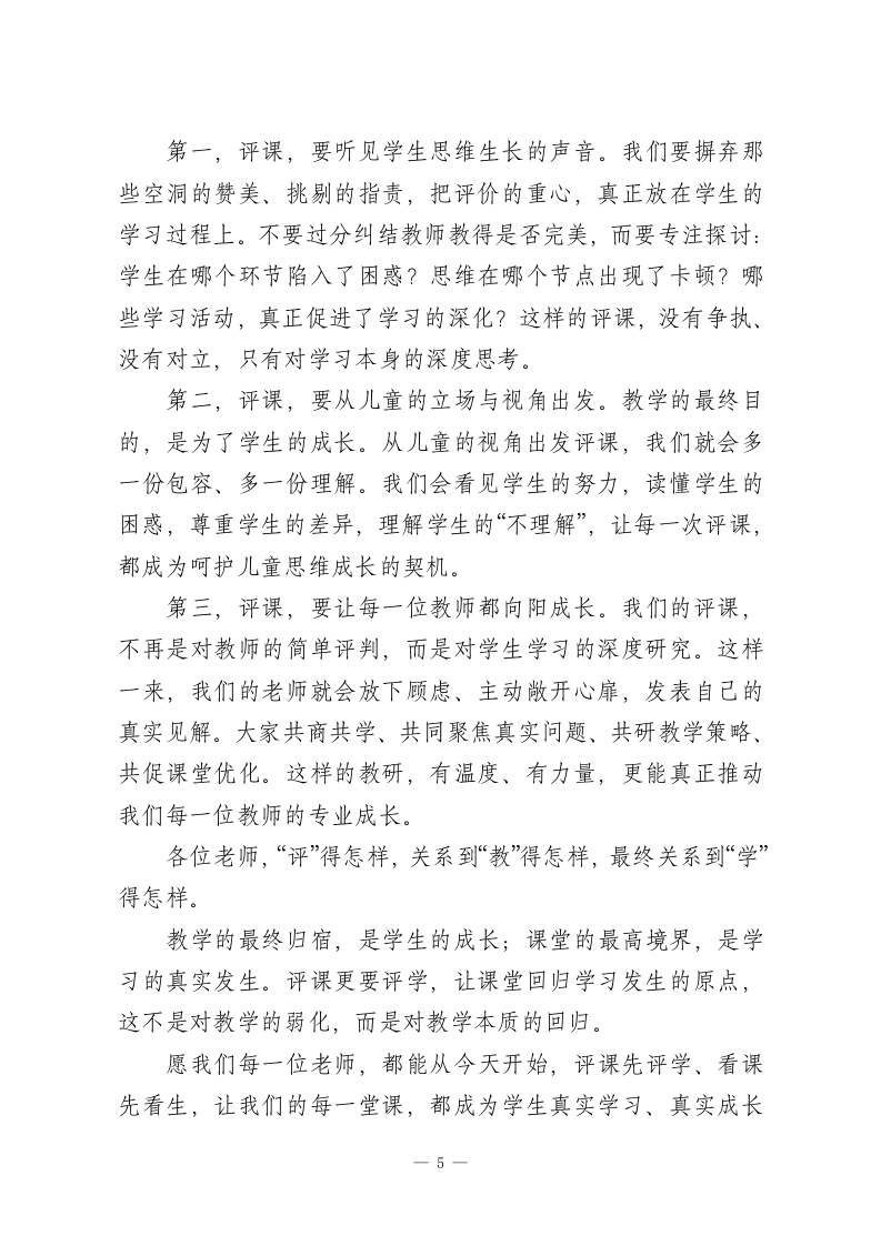 教师会议上校长讲话:评课先评学、看课先看生各位老师、各位教研同仁:大家好!今天,我们聚焦一个所有课堂、所有教研都绕不开的话题评课。这些年,我们听了无数节公开课、示范课、常态课,评课的时候,大家总爱说:这堂课目标明确、过程优化、效果突出;这位老师素质优秀、设计精巧、课堂行云流水…这些评价本身没错,可越往教学深处走,我越清醒地感受到:我们的评课,看得见“教师”,却很难看见“学生”;重视“教”,却轻视了“学”。翻开我们的评课记录,浓墨重彩写的,几乎全是授课老师的表现、设计、环节,可对学生在课堂上到底怎么学、学得怎么样、遇到了什么困惑、有了什么成长,往往轻描淡写、一带而过。这不是我们故意忽略,而是长期以来的评课惯性,让我们偏离了课堂最本真的方向。我始终认为,一堂好课的标准,从来不该只停留在教师“教”得精彩,更该扎根在学生“学”得真实。评课的方式,更不能只评教师的“教”,一定要评学生的“学”,而且后者,才是评课的核心与关键。今天,我们就一起走出评课的惯性误区,重构课堂观察的视角,真正让评课回归教学本质。一、走出评课惯性误区:别让“教的精彩”掩盖“学的真实”