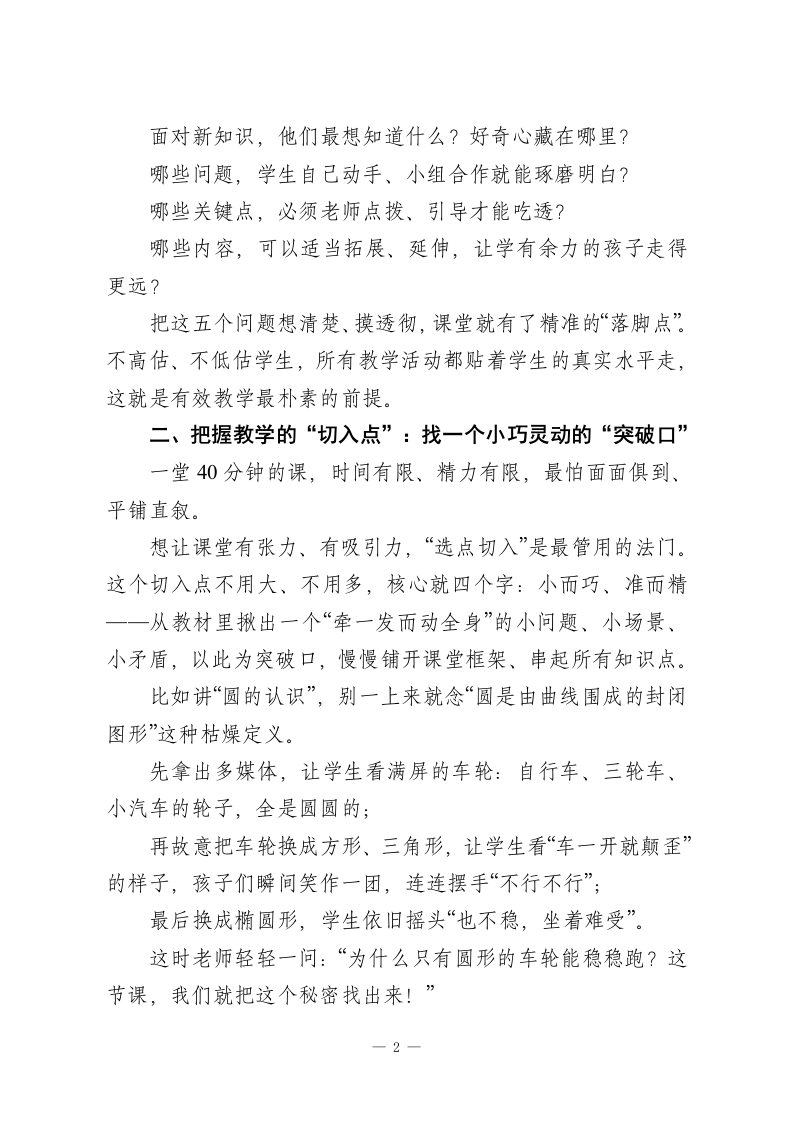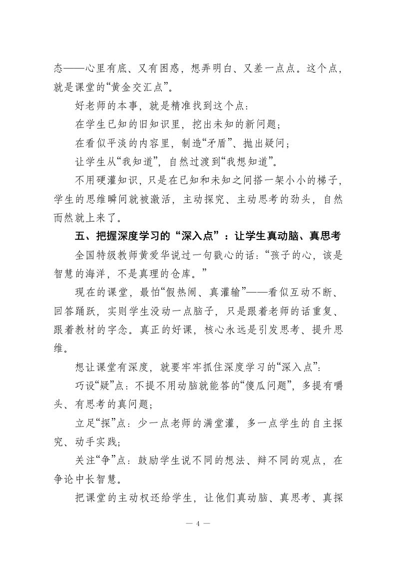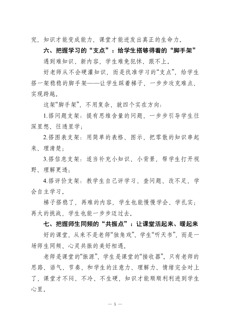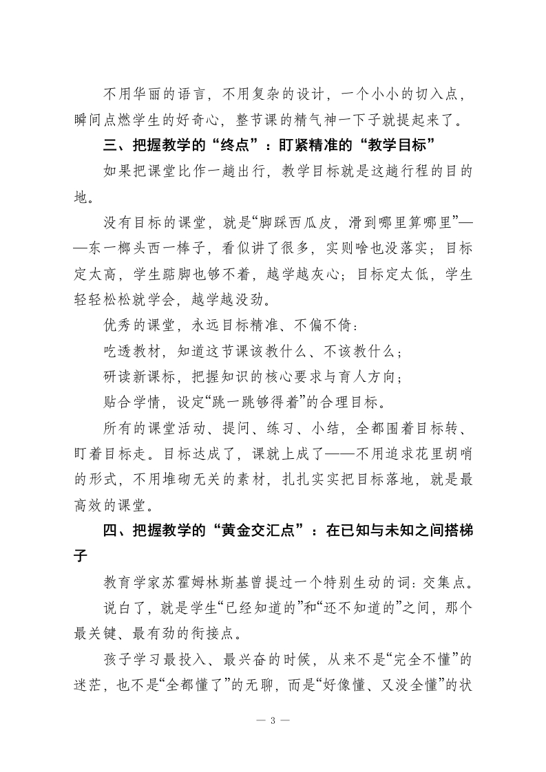 教师会议上校长讲话:一堂好课的八个“心”法,让每节课都高效、鲜活、有深度每天站在三尺讲台,我们几乎都在反复琢磨同一个问题:到底什么样的课,才算真正的好课?有人说好课要热闹有趣,有人说好课要扎实高效,还有人觉得好课得有深度、有启发。听过全国各地无数名师的示范课,越发觉得:好课的模样从来没有统一标准一一有的朴实无华却直击核心,有的生动活泼却步步扎实,有的循循善诱却润物无声。但剥去所有形式的外衣,所有优质课堂的底层逻辑,始终离不开八个关键章法。这不是空洞的教育理论,而是每一位一线教师天天能用、课课能落地的实在心法。正如教育先贤所说:教学最该遵循的,永远是孩子的天性与成长规律。守住这八个“点”,再普通的课堂,也能变成学生爱听、学得进、想得深的优质好课。一、把握教学的“起点”:先摸透学生的“真实学情”好课从来不是从教材开始,而是从学生开始。很多老师备课,一头扎进教材里抠知识点、理流程,却忘了最关键的一件事:学生上课前,到底已经会了什么?学情,就是课堂的真正起点一一摸不清这个起点,目标定不准、重点抓不住、难点破不了,课上得再花哨,也是“对牛弹琴”。备课时,不妨先静下心问自己五个最实在的问题:这节课的内容,学生已经知道了什么?哪些是不用教就会的?一1