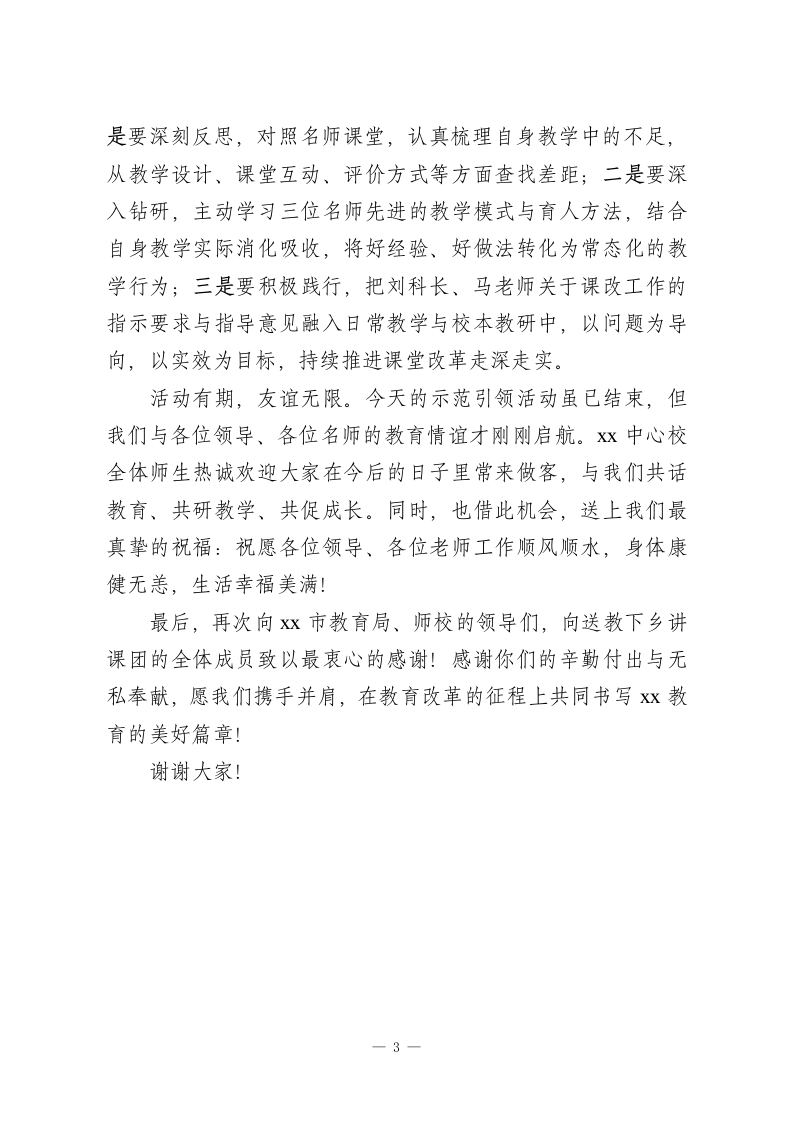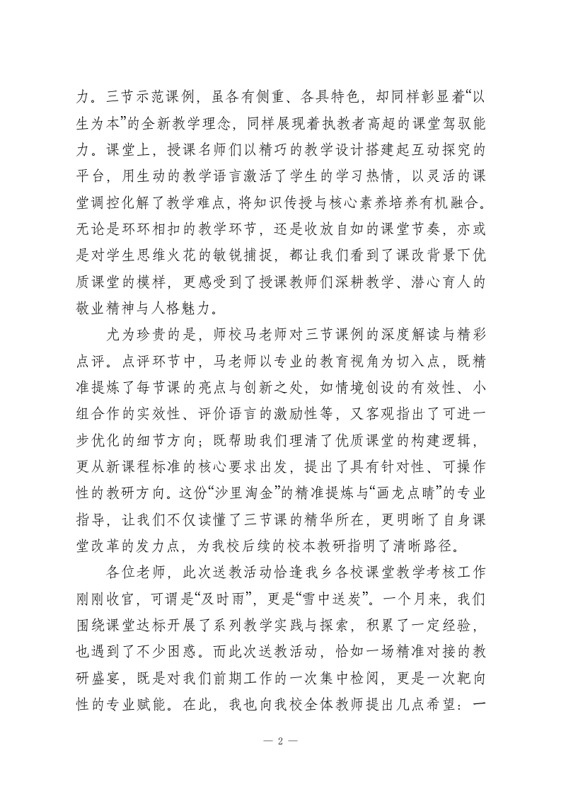 课堂教学改革示范引领活动闭幕式,校长致辞:感恩送教传薪火,课改同心向未来尊敬的各位领导、各位授课名师,亲爱的教育同仁们:大家上午好!历时半天的深耕细研,Xx市课堂教学改革示范引领活动在我校圆满落下帷幕。此刻,我谨代表xx中心校全体师生,向全程统筹指导、倾情付出的市教育局、师校领导,向远道而来、倾囊相授的授课教师团队,致以最诚挚的感谢和最崇高的敬意!你们的到来,如春风化雨,为我校的课堂改革注入了鲜活动能:你们的坚守,似星光引路,为基层教育人点亮了前行方向。推进教育均衡发展,让优质教育资源惠及每一所学校、每一位学生,是教育工作者的共同初心。多年来,xx市教育局始终将“送教下乡”作为深化课堂改革、促进城乡教育协同发展的重要抓手,以高度的责任担当搭建起城乡教育交流的桥梁。从先进教育理念的精准传递,到优质教学经验的深度分享,再到实用教学方法的现场示范,“送教下乡”活动始终立足基层学校的真实需求,把最前沿、最实用、最接地气的教育智慧送到教育一线,让我们基层教师足不出校就能近距离接触优质课堂,在观摩中思考,在交流中成长。这份深耕教育的初心与担当,赢得了受教单位全体教师的一致赞誉,也成为推动我市课改工作向纵深发展的强大动力。此次示范引领活动,更以“精准实效”为核心,让我们真切领略到了课改先进校的育人风采,感受到了优秀教师的课堂魅1