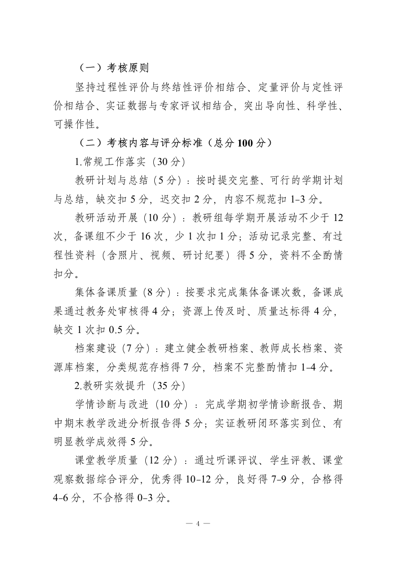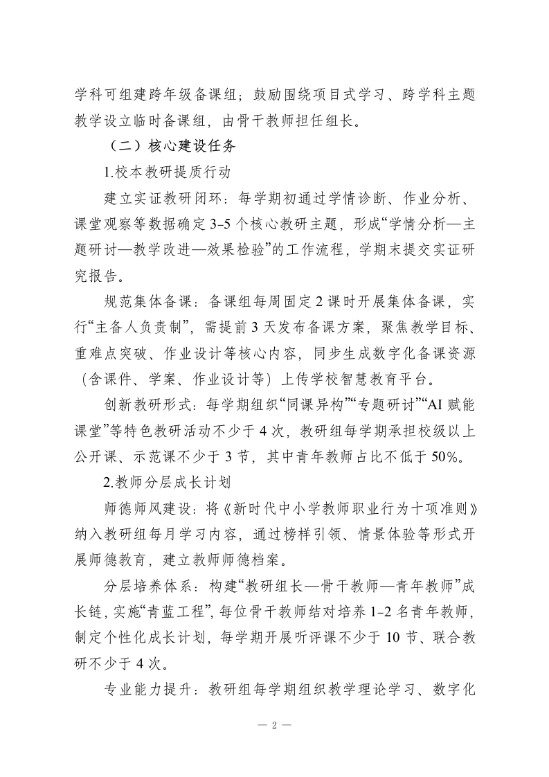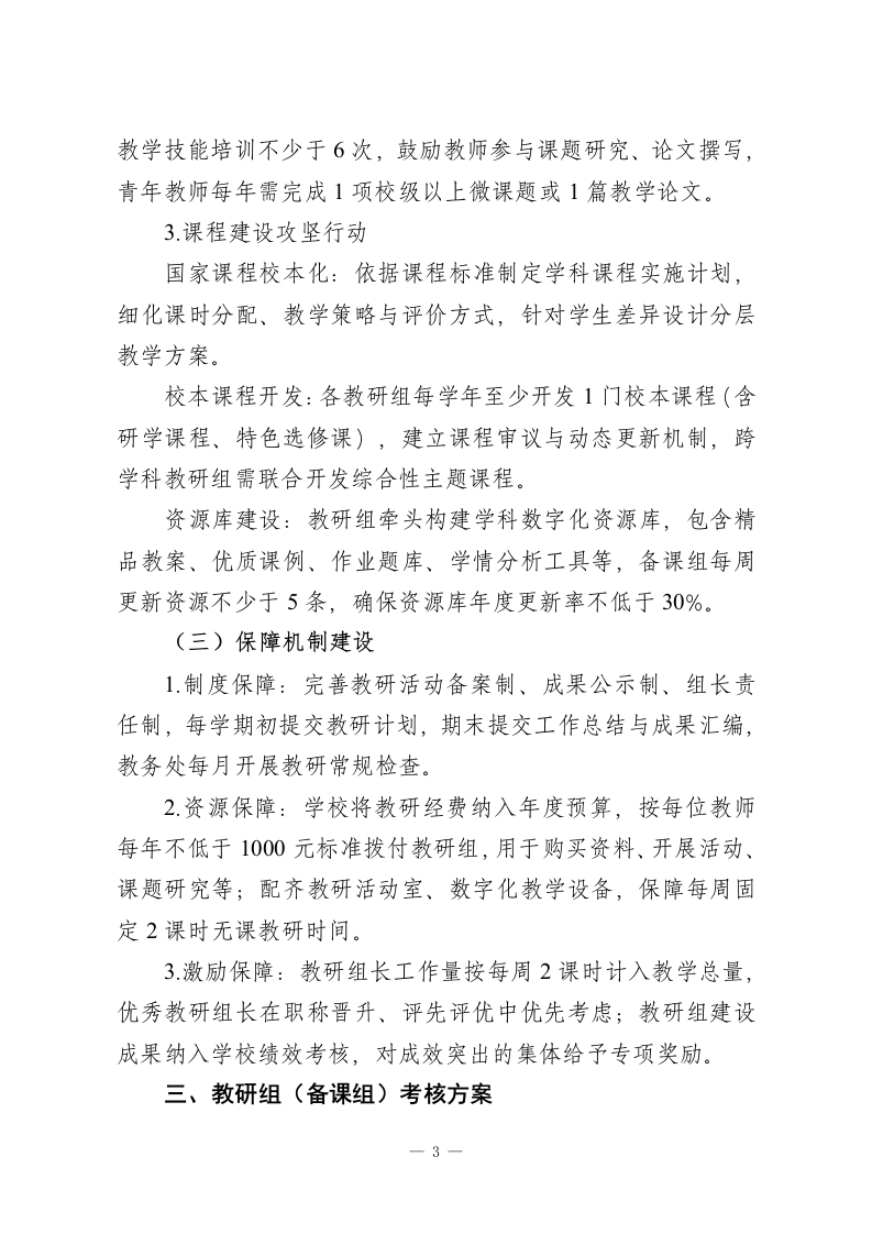 市实验中学教研组(备课组)建设与考核方案(2026年修订版)一、总则(一)指导思想以核心素养培育为导向,落实“内涵发展、质量立校、科研强校”办学理念,遵循《安徽省中小学校教研组建设指导意见》要求,构建“实证教研、数字赋能、分层成长”的教研体系,推动教研组(备课组)成为教学改革的主阵地、教师成长的共同体、质量提升的核心引擎。(二)适用范围全校各学科教研组、各年级备课组(含跨学科综合备课组、跨校区联合教研组)。二、教研组(备课组)建设方案(一)组织架构建设1.三级管理体系:建立“校长一教务处一教研组(备课组)”三级管理机制,校长为第一责任人,教务处牵头统筹,教研组负责学科整体建设,备课组聚焦日常教学研讨。2.组长选拔与培养:教研组长实行“选拔一培养一使用”一体化机制,需具备中级以上职称、3年以上教研管理经验,经民主推荐、教务处考察、校长办公会任命,任期3年。学校每学期组织教研组长专题培训、名校跟岗学习不少于2次,提升课程领导与团队管理能力。3.备课组设置:按年级+学科设置基础备课组,规模较小的一1