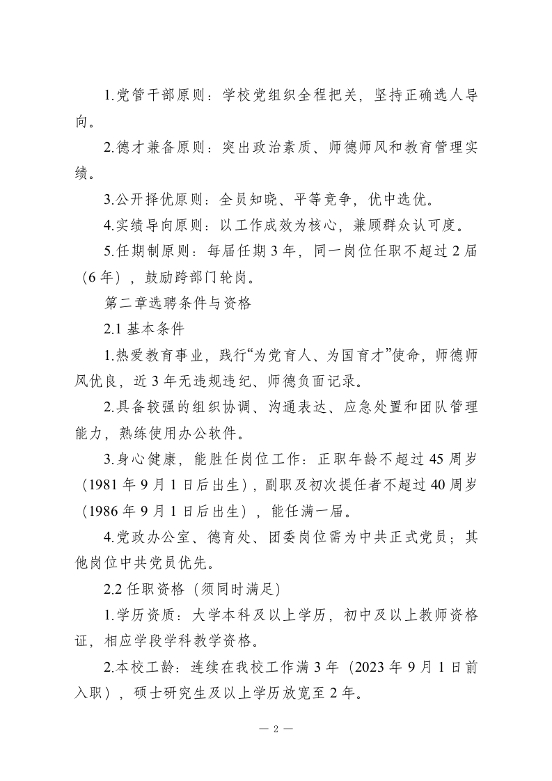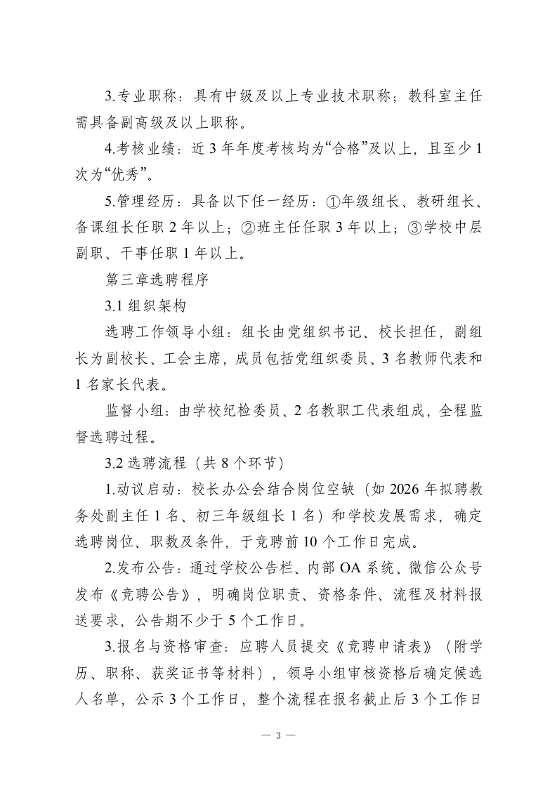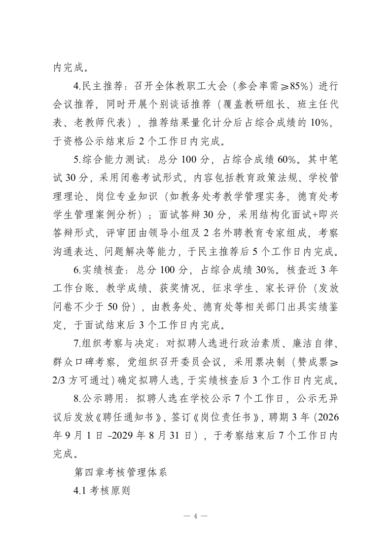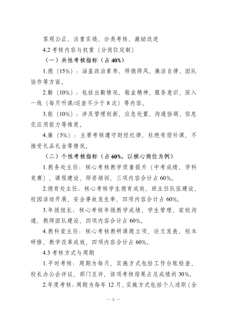 市实验中学中层管理岗位选聘与考核管理方案(2026年修订版)第一章总则1.1制定目的为深化学校人事制度改革,建立公开、平等、竞争、择优的选人用人机制,加强中层管理队伍建设,提升学校治理能力和办学水平,激发中层干部履职活力,根据《党政领导干部选拔任用工作条例》《事业单位领导人员管理规定》等上级文件精神,结合我校“立德树人、五育并举”办学理念和36班规模办学实际,修订本方案。1.2适用范围本方案适用于学校以下内设机构正、副职负责人选聘与考核:党政办公室(主任、副主任)教务处(主任、副主任2名,分别分管教学管理、课程建设)》德育处(主任、副主任2名,分别分管学生管理、班主任工作)总务处(主任、副主任1名)安全保卫处(主任、副主任1名)教科室(主任、副主任1名)团委(书记、副书记1名)》年级组(三个年级,各设组长1名、副组长2名)1.3基本原则一1