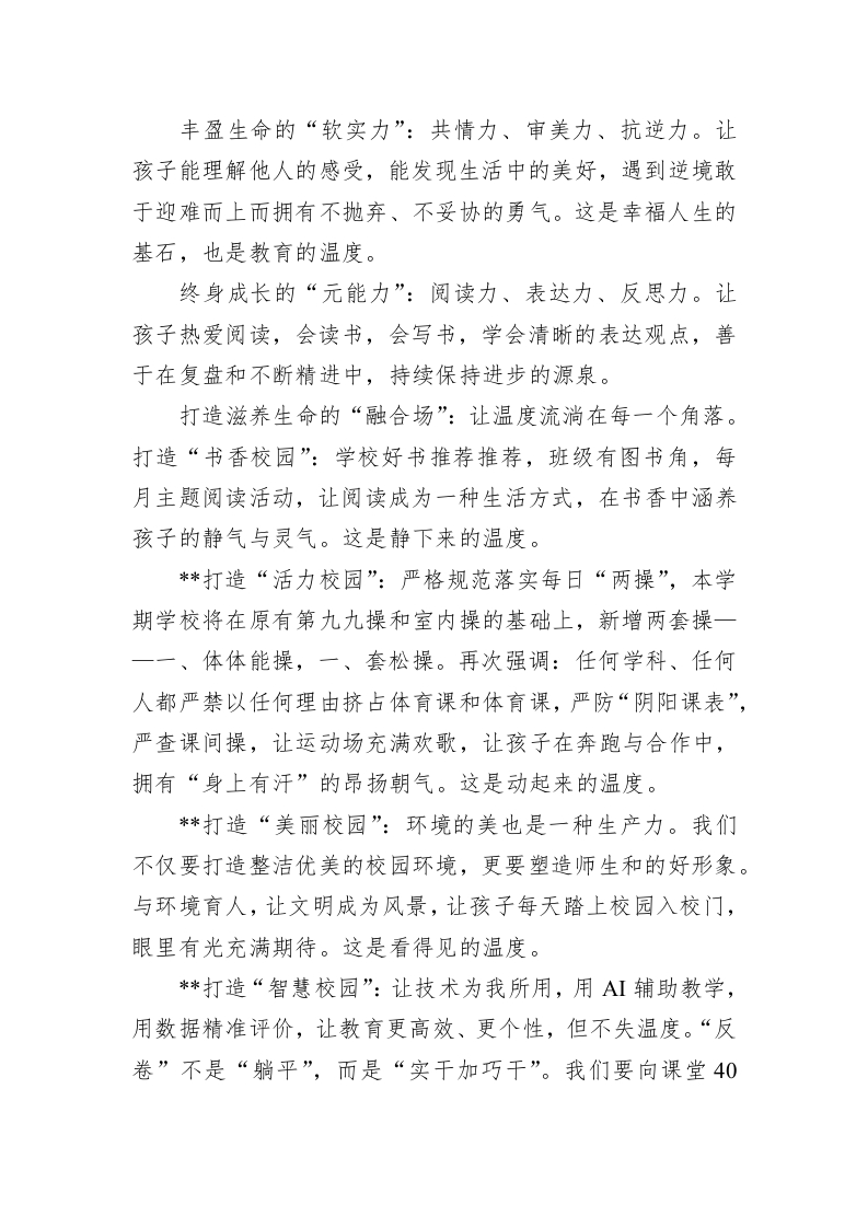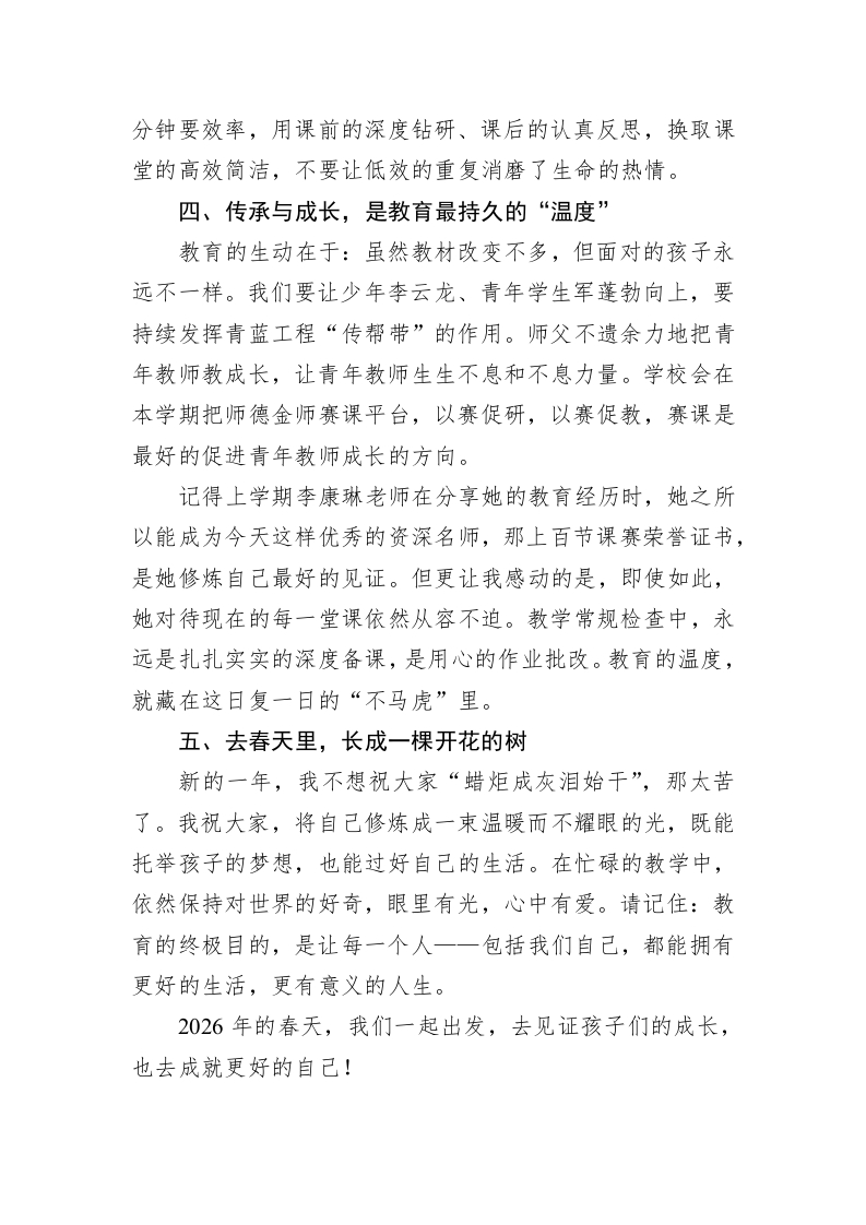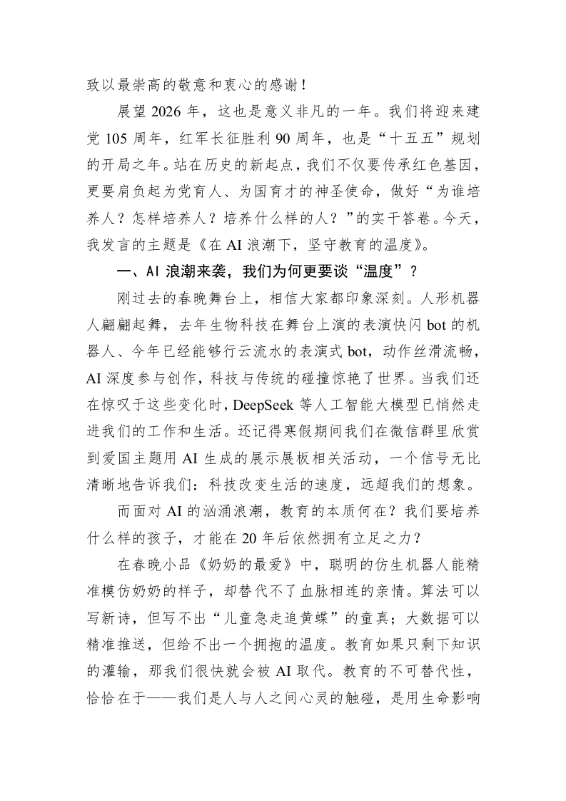 小学党总支书记在2026年春季开学工作大会书记讲话:在AI浪潮下,坚守教育的温度亲爱的老师们:大家上午好!欢迎归来!春回大地,万象更新。带着“新年”的喜悦与自豪,我们重聚在生机勃勃的校园,共同开启2026年春季学期的崭新篇章。在此,我谨代表学校党总支,向在座的每一位老师致以最诚挚的新春问候!大家上午好!欢迎归来!春回大地,万象更新。带着“新年”的喜悦与自豪,我们重聚在生机勃勃的校园,共同开启2026年春季学期的崭新篇章。在此,我谨代表学校党总支,向在座的每一位老师致以最诚挚的新春问候!回顾过去的2025年,是辛苦并充实的一年,也是硕果累累的一年。让我们全国“优秀少先队”集体、正式授牌“全国国防教育示范校”,荣膺“XX市大中小学思政课一体化试点学校”。这些荣誉,更是责任!它见证了我们XX人的奋斗与担当,是我们教育教学深耕不辍、学生成长丰富多彩、书香校园建设初见成效的生动写照。这份沉甸甸的荣誉,凝聚着全体师生的心血与汗水,请允许我代表学校党总支向大家