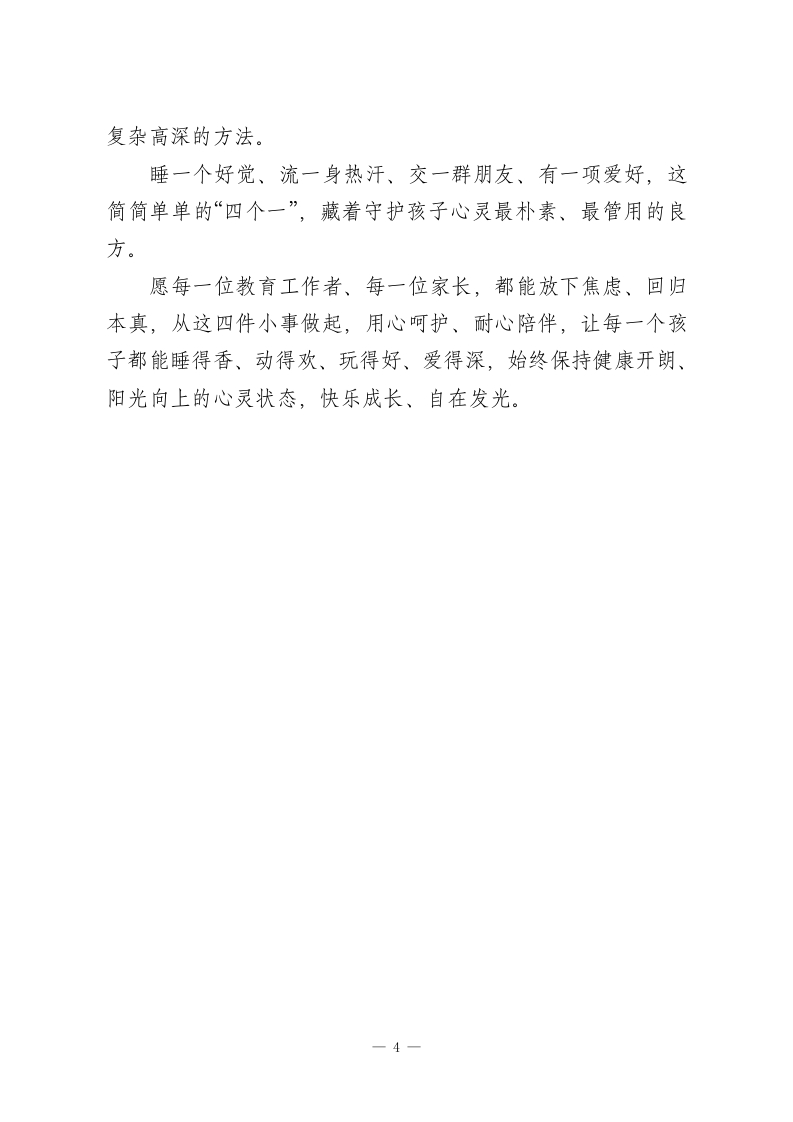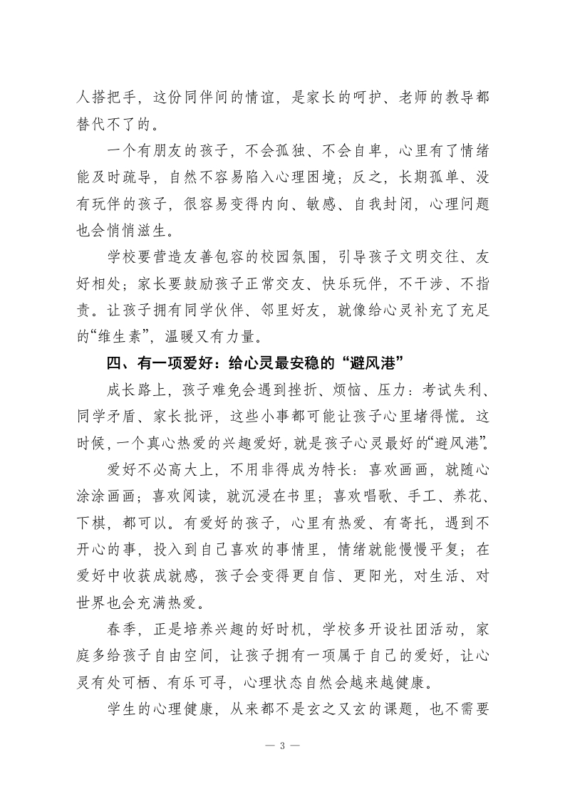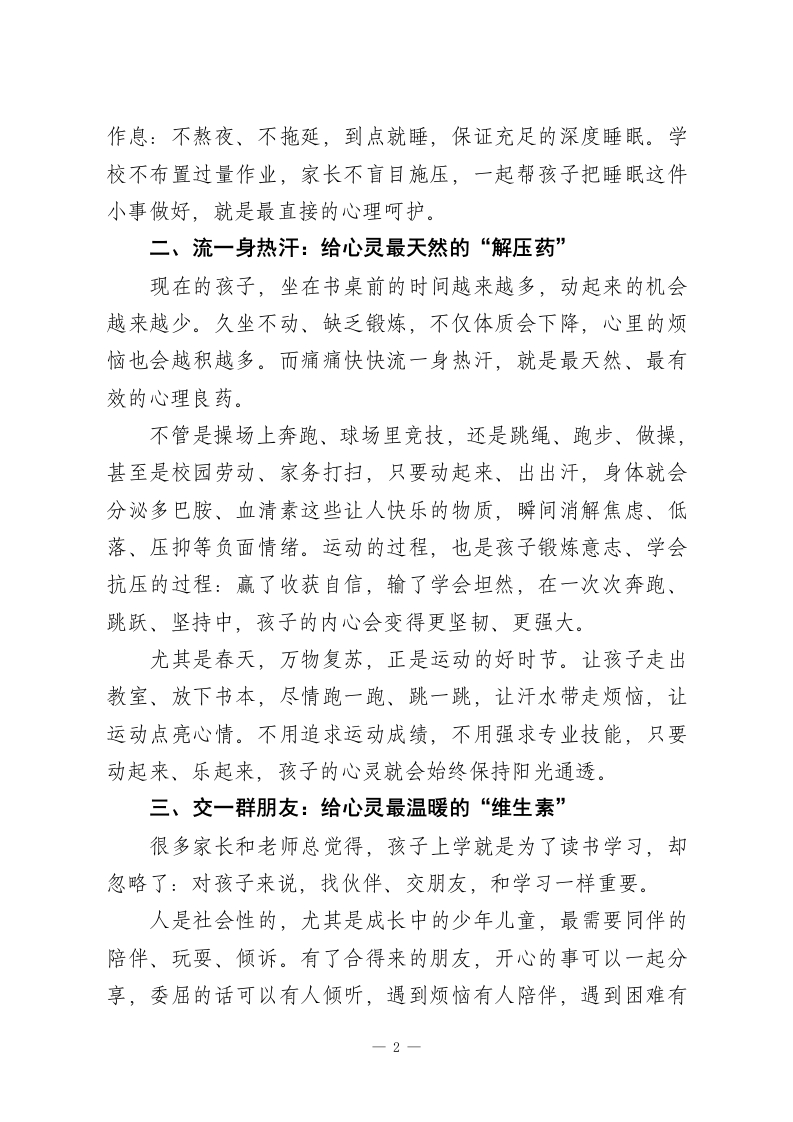 校长精彩演讲,守护学生心灵成长:抓好心理健康的“四个一”朴素良方当下,学生心理健康早已成为学校、家庭、社会共同关注的核心话题。一提到心理疏导、情绪调节,很多人首先想到的是专业课程、心理咨询、干预辅导,这些固然重要,但在我看来,学生的心理健康,从来都不只是藏在专门的心理教育里,更藏在日常起居、生活点滴中。想要守护好孩子的心灵,不用追求复杂的方法,抓好最朴素、最实在的“四个一”,就足够让孩子远离阴霾、向阳成长。一、睡一个好觉:给心灵最好的“净化器”在快节奏的学习生活里,“好好睡觉”成了很多孩子的奢侈品。为了多刷一套题、赶一份作业,不少孩子熬夜到深夜,第二天顶着黑眼圈上课,情绪烦躁、注意力涣散,一点点小事就容易发脾气、钻牛角尖。其实,良好的睡眠,是心理健康最基础、最管用的基石。科学研究早已证明,睡眠和情绪是双向绑定的:睡得足、睡得香,大脑就能有效清理一天的压力、烦躁、委屈这些“心理垃圾”,孩子第二天醒来,情绪更平稳、心态更阳光,面对学习和生活也更有劲头;反之,长期睡眠不足,孩子就会变得敏感、易怒、低落,一点点压力都能被无限放大,心理状态自然越来越差。睡一个好觉,从来不是“偷懒”,而是给心灵充电。不管是低年级的孩子,还是备战考试的中高年级学生,都要守住规律1