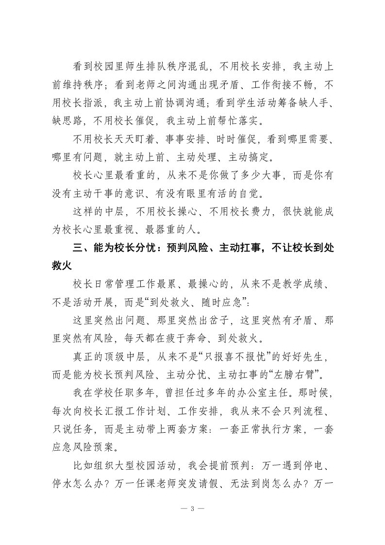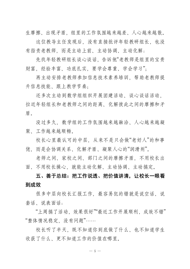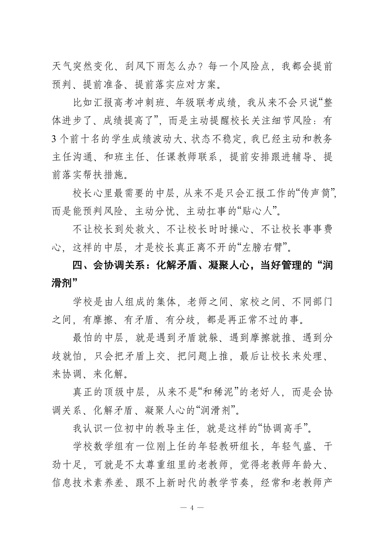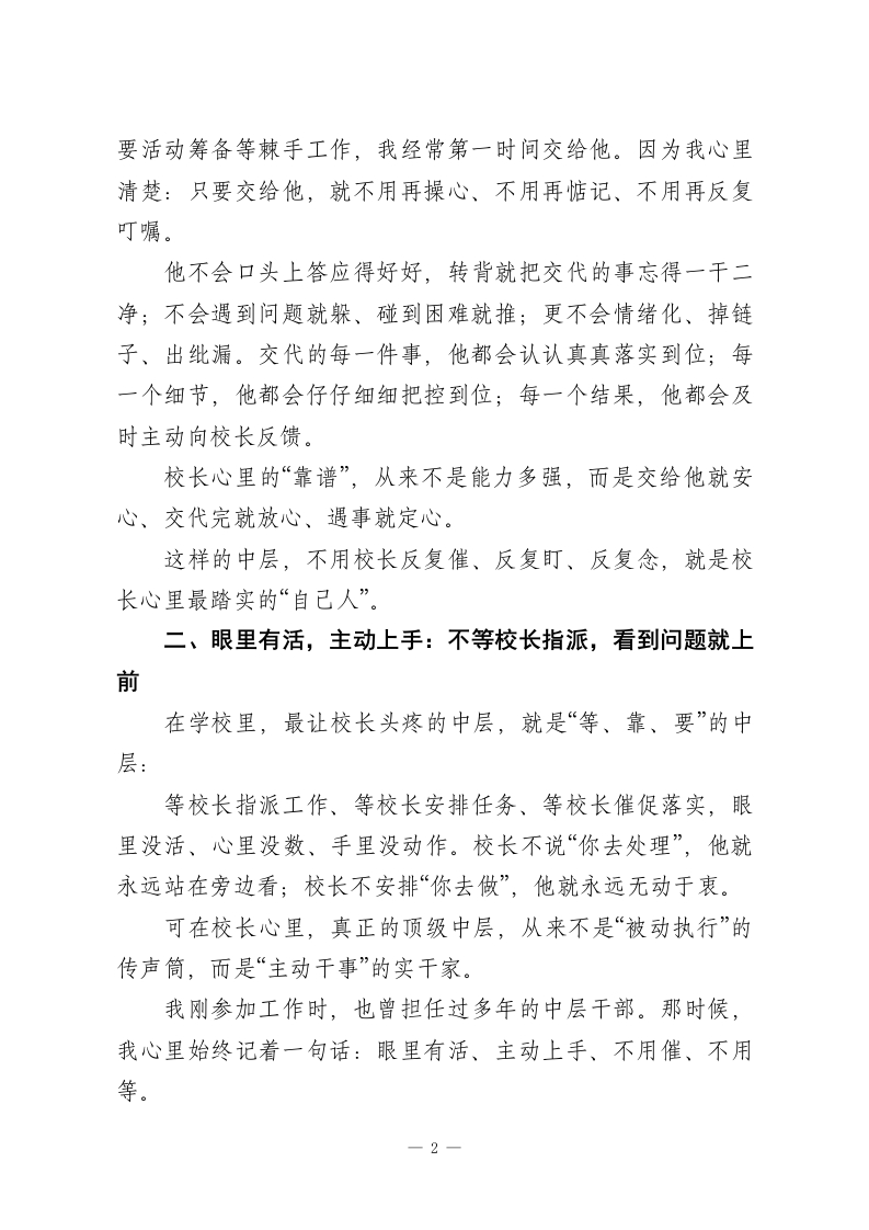 校长心里最认可的顶级中层,就看这6点!做到的都是学校的“顶梁柱”在学校管理里,中层是承上启下的“咽喉”,是校长的左膀右臂,是一线教师的领头人,更是各项工作落地的“关键枢纽”。很多中层觉得,只要把校长交代的事做完、把日常工作应付好,就算称职。可在校长心里,真正的顶级中层,从来不是能力最突出、工作最亮眼的,而是最实在、最靠谱、最能杠事的。我在校长岗位上多年,带过数十位中层干部,也见过太多形形色色的管理场景。最后发现,能让校长打心底里认可、放心、器重的中层,全都藏在这6条最朴素的标准里。做到的,都是学校不可或缺的“顶梁柱”。一、让人放心,靠谱:交给他,校长就不用再操心校长安排工作,最怕的不是事情难、任务重,而是交给的人不靠谱、情绪化、爱掉链子。我任职期间,曾遇到两位截然不同的中层:一位老师课堂教学能力不错,个人业务也很突出,可就是情绪波动大、遇事容易慌,稍微遇到点压力就情绪化,稍微碰到点难题就想退缩。我多次想把毕业班的教学管理、重要的招生宣传工作交给他,可始终不敢一一怕他关键时刻掉链子、出岔子,怕他情绪上来就把工作抛在脑后。还有一位中层干部,工作不算最出彩、口才不算最伶俐,可就是让人踏实、让人放心。学校的招生宣传、家校沟通、重-1-