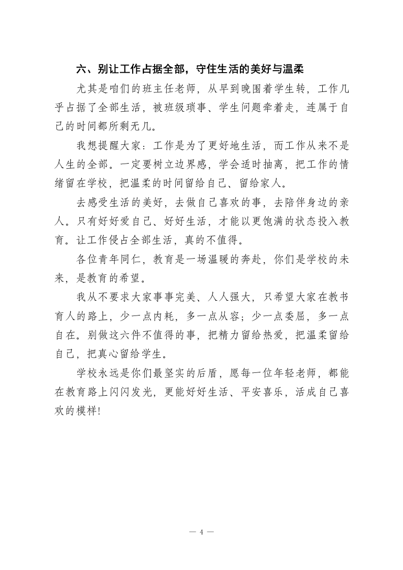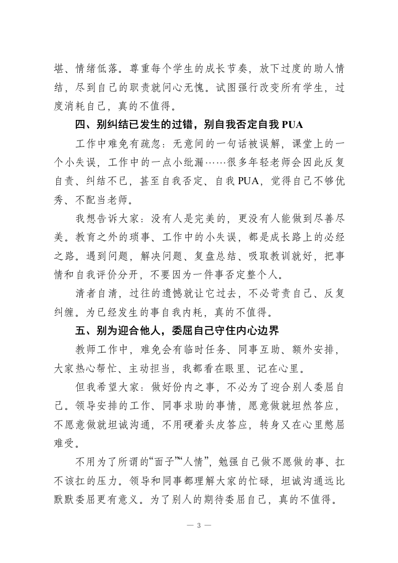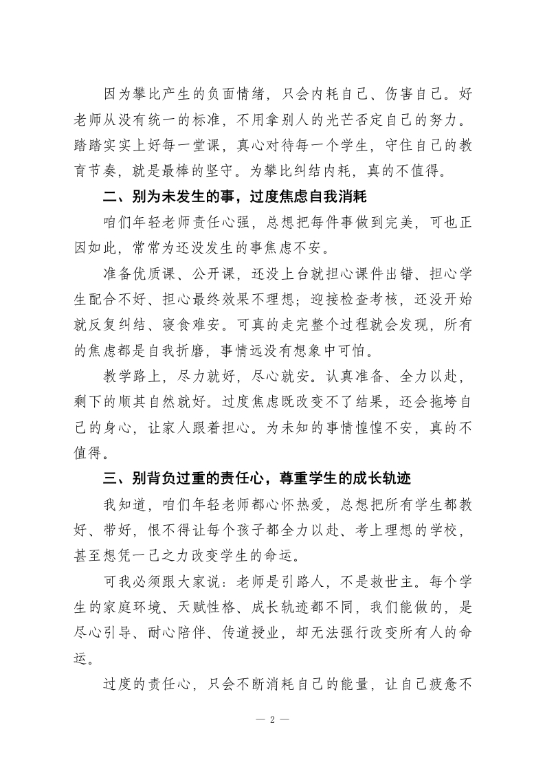 校长演讲,致青年教师:教育路上别为难自己,这六件事最不值得做各位青年教师同仁:大家好!每次走进教研组、走进课堂,和咱们年轻老师聊天,我都能真切感受到大家的赤诚与热爱,也格外心疼大家心底的焦虑与疲惫。刚踏上讲台的你们,曾对教师生涯满怀憧憬,可真正扎根一线才发现,日常的琐碎、工作的压力、家校的琐事、成长的困惑,和曾经想象的从容教书相差甚远。难免会力不从心,难免会自我怀疑,甚至偶尔会开玩笑说“当老师最不值得”。可我知道,大家嘴上抱怨,转身依旧认真备课、耐心育人,从未辜负肩上的责任。作为陪伴大家一路走来的教育同行,今天我想掏心窝子跟大家说:教育是一场细水长流的修行,千万别为难自己。这六件事,最消耗自己、最不值得做,希望大家都能记在心里。一、别和他人攀比,守住自己的教育节奏每到评优评先、职称晋升的时候,校园里总会多一丝无形的压力。有人如愿获评,有人遗憾落空,这本是常态。我想告诉大家,千万不要盲目攀比,更不要心生嫉妒。你看到的只是别人光鲜的结果,却看不到他们背后默默的付出、长期的积累。有的人擅长教研课题,靠专业成果脱颖而出;有的人深耕课堂,用教学质量坚守初心。每个人的成长路径不同、优势不同,评价体系也很难做到面面俱到。1