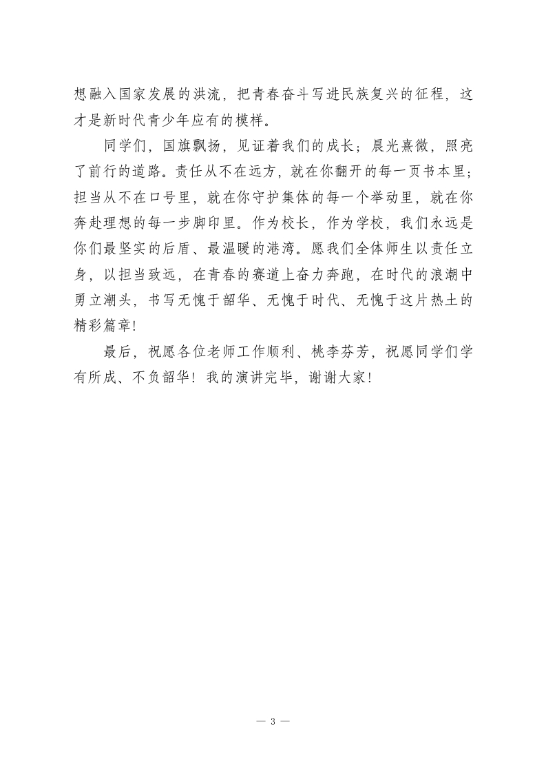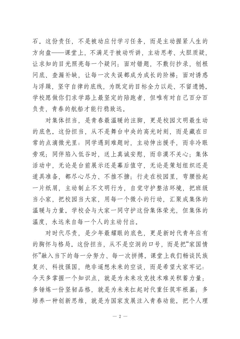 校长在国旗下讲话:责任在肩,青春向前尊敬的各位老师,亲爱的同学们:大家早上好!迎着朝阳,伴着国旗冉冉升起,我们又一次相聚在这庄严的国旗下。车尔尼雪夫斯基曾说:“生命,如果与时代的崇高责任紧密相连,便会拥有超越岁月的力量,实现真正的永垂不朽。”一个人真正的成长,从不是年龄的增长,而是学会主动扛起肩头的责任。尤其在科技飞速发展、时代浪潮奔涌的今天,我们面临着前所未有的机遇与挑战,更需明晰那份沉甸甸的责任,以担当之姿奔赴未来。今天,我以校长的身份,与全体师生一同探讨“责任与担当”这一深刻命题。于师者,责任是教书育人的初心坚守,是托举青春梦想的使命担当;于在座的同学们,责任与担当,是青春最厚重的底色,是成长最坚实的脚步,更是新时代赋予我们的必然要求。身为教育者,我们的责任,不仅是深耕讲台、传授真知,更要以爱为犁、以行作舟,引领同学们明辨是非、涵养品格。我们会用反复打磨的教案、耐心细致的答疑、始终如一的陪伴,为同学们的成长保驾护航;更会以身作则,用一言一行诠释坚守的力量,用一举一动示范担当的内涵。但成长终究是一场自己的旅程,责任与担当的真谛,终究要靠同学们在日常点滴中亲身践行、用心体悟。对自己负责,是成长的第一粒扣子,更是人生远航的压舱一1